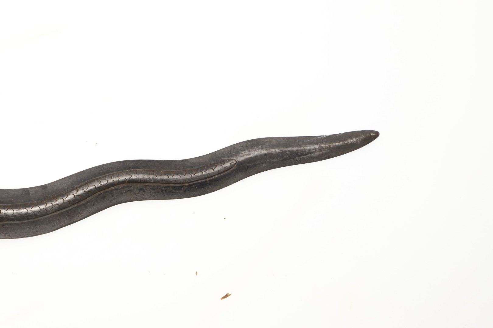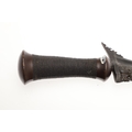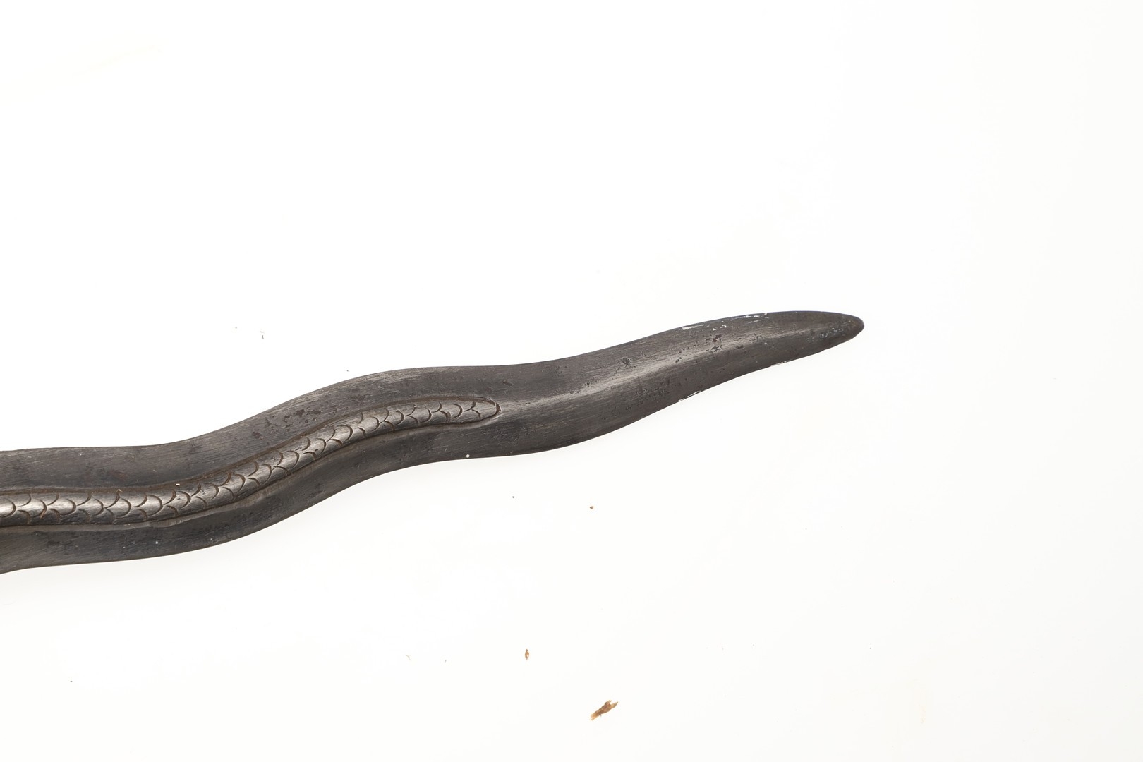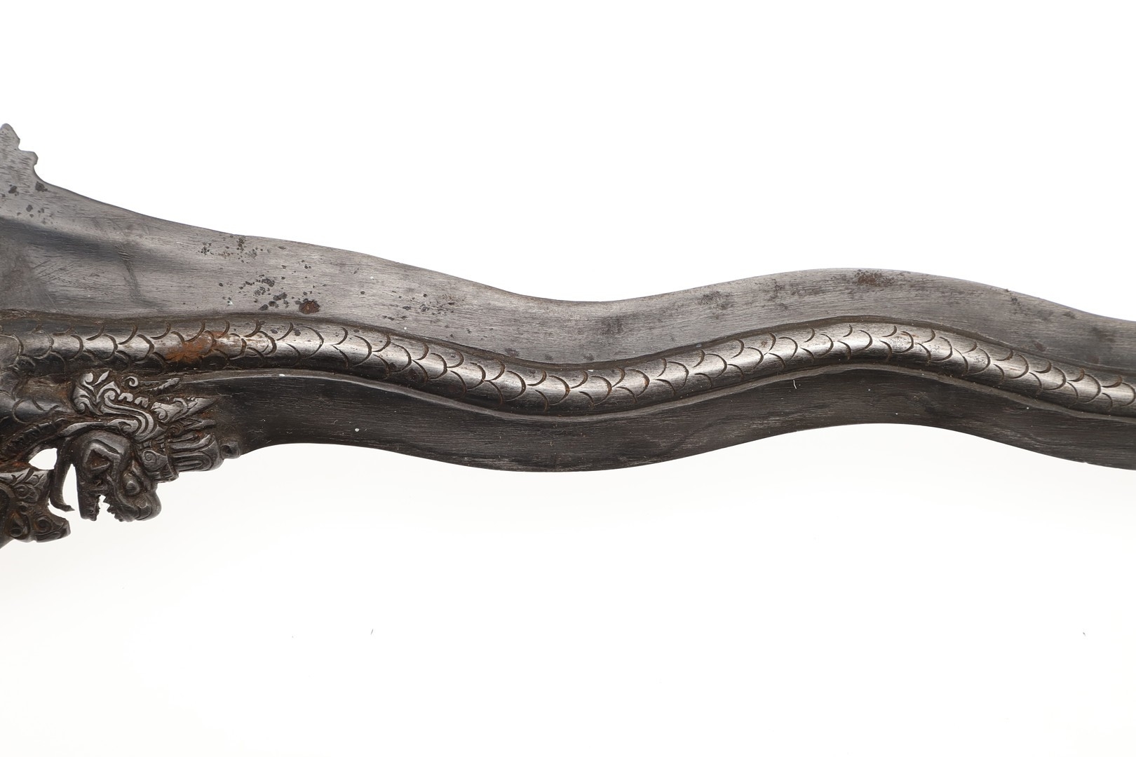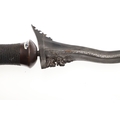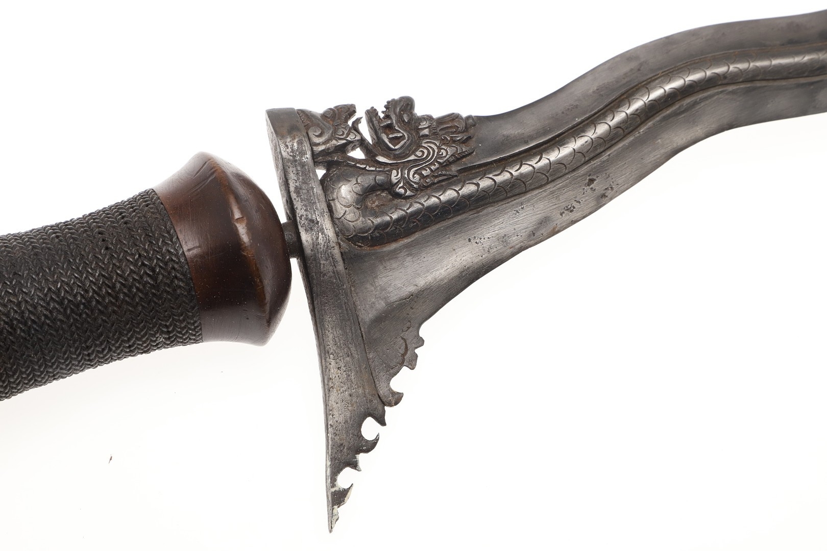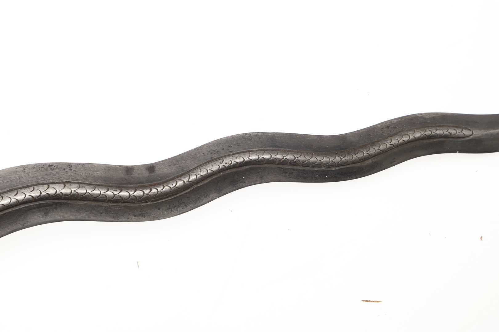 A KRIS NAGARAJA AND SCABBARD FROM LOMBOK OR BALI. The 45 cm ten curved blade with the Naga snake carved in relief to almost the entire length of the blade. The Naga wearing a royal tiara. On a turned wooden grip with a woven cover. In a plain wooden scabbard of the Lombok Bali type, the Sampir of fine black wood. 66.5 cm.