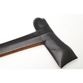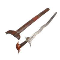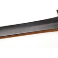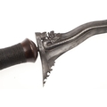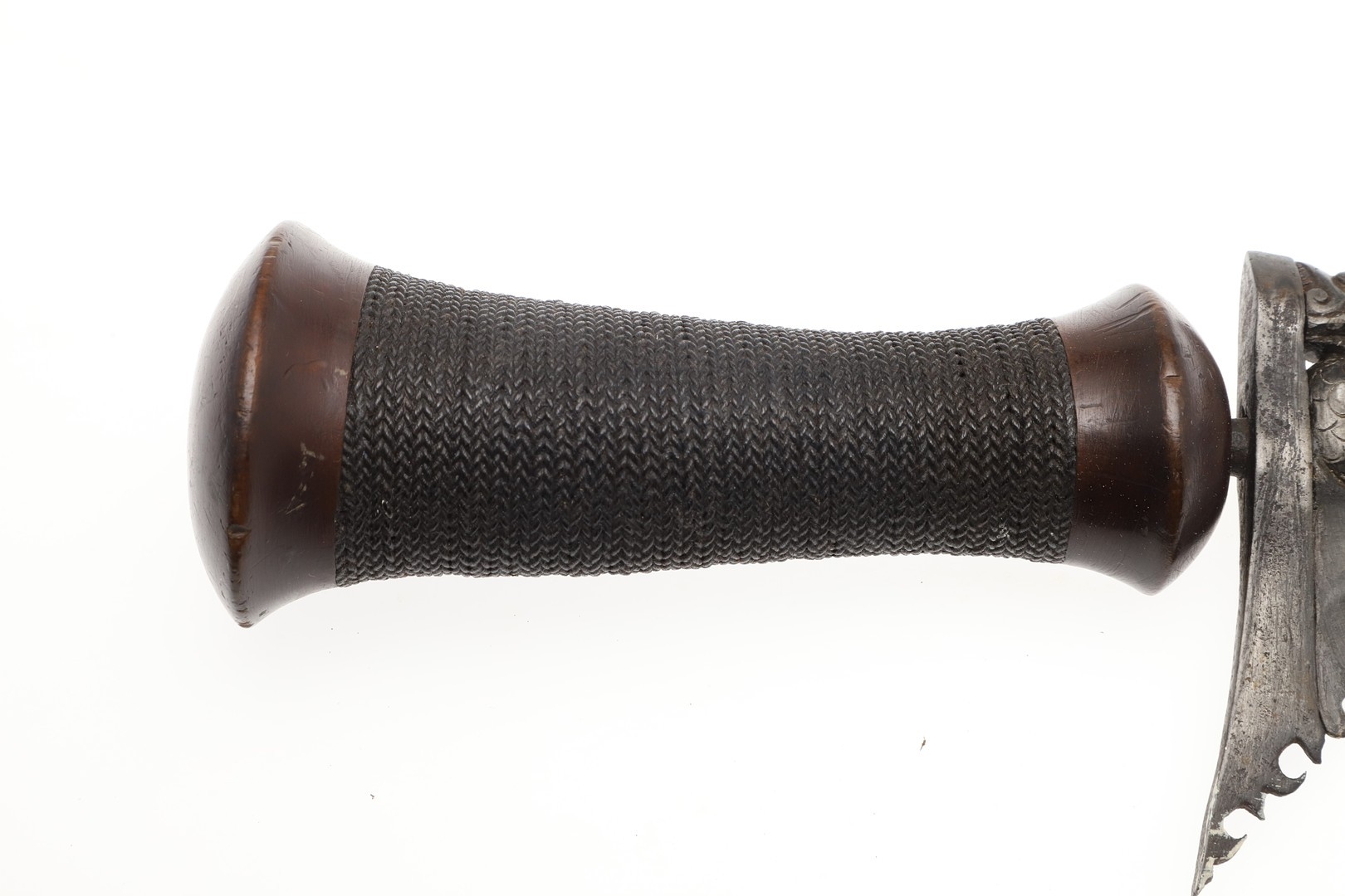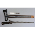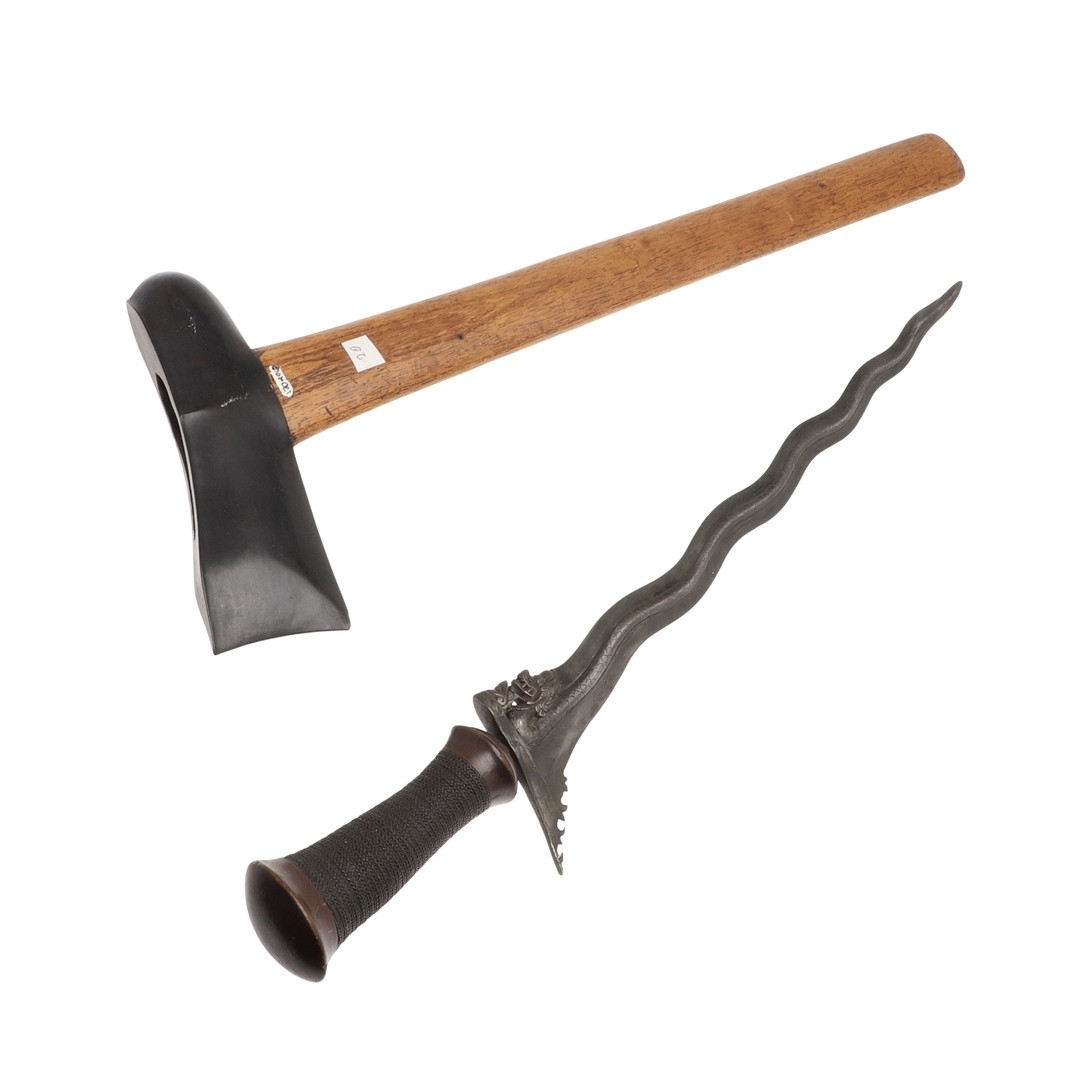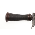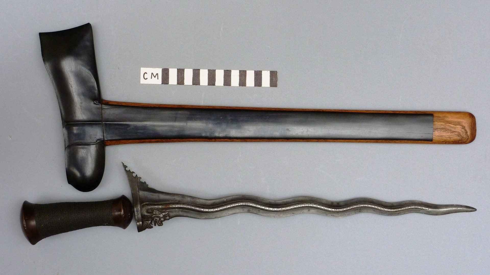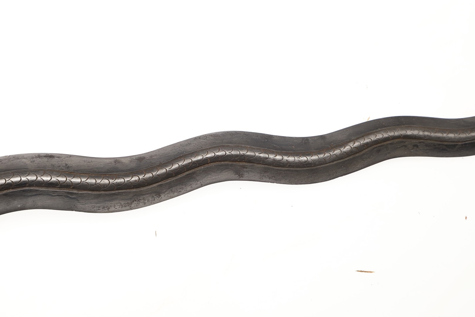 A KRIS NAGARAJA AND SCABBARD FROM LOMBOK OR BALI. The 45 cm ten curved blade with the Naga snake carved in relief to almost the entire length of the blade. The Naga wearing a royal tiara. On a turned wooden grip with a woven cover. In a plain wooden scabbard of the Lombok Bali type, the Sampir of fine black wood. 66.5 cm.