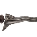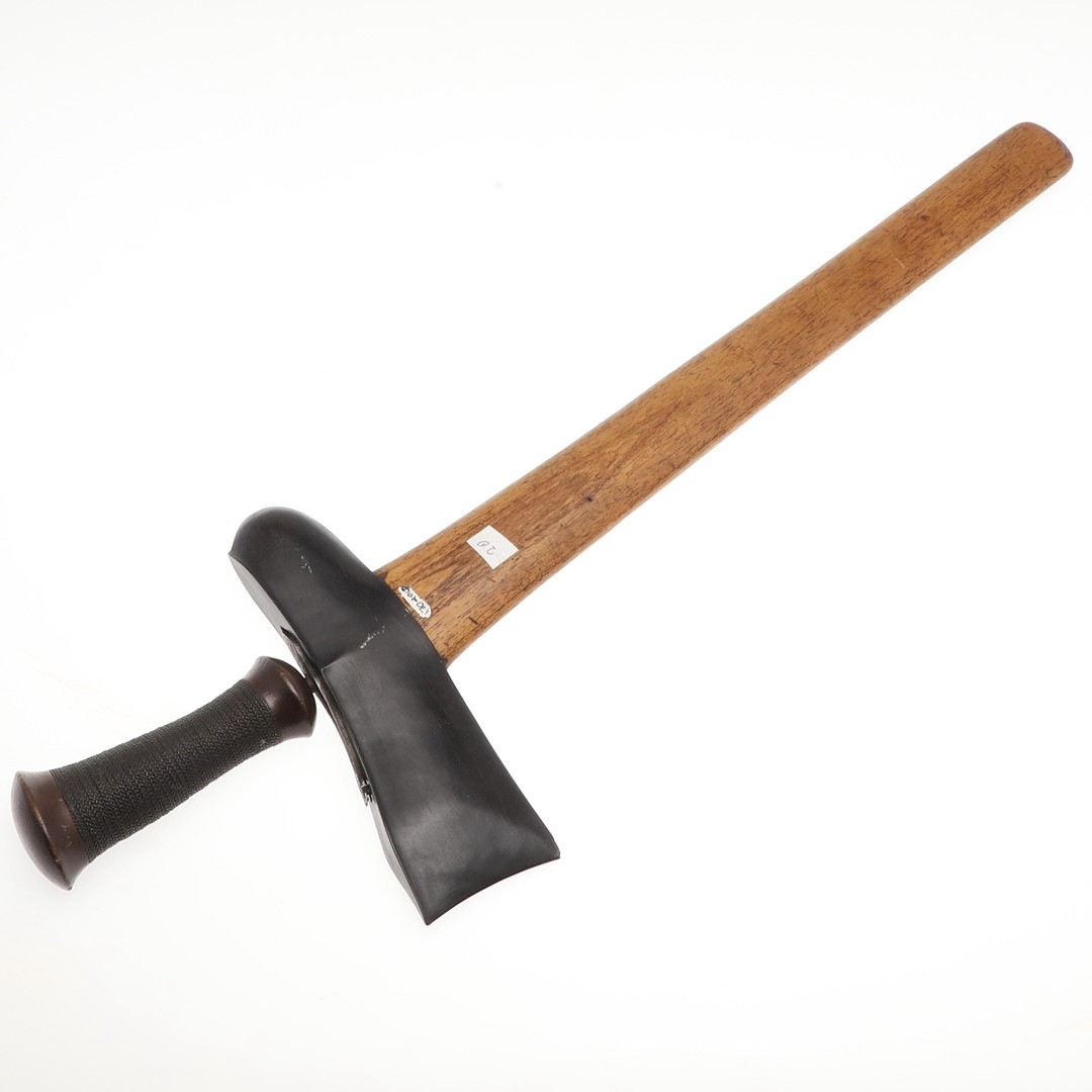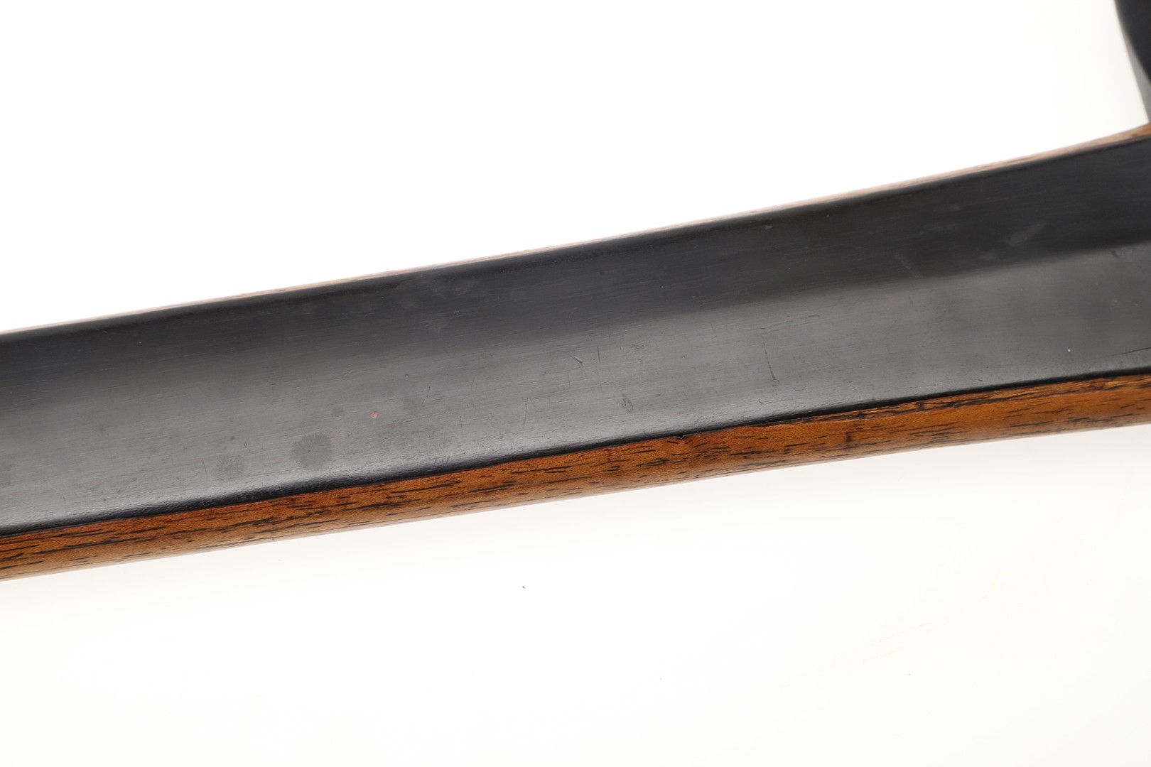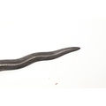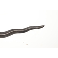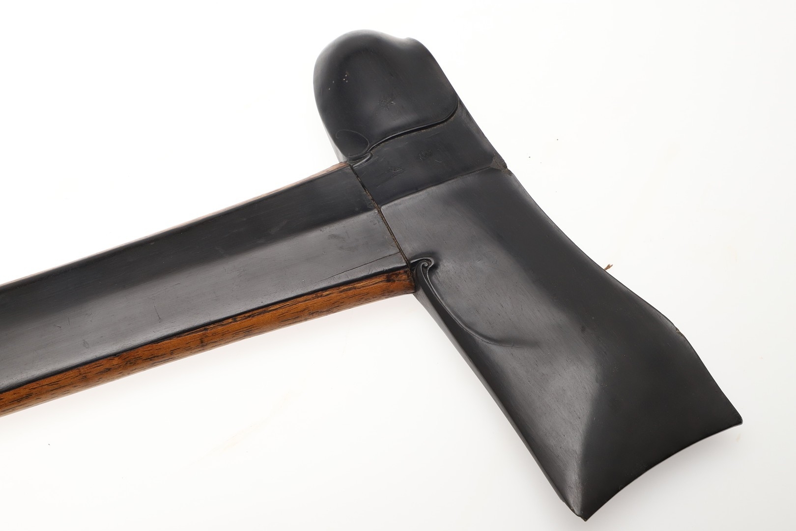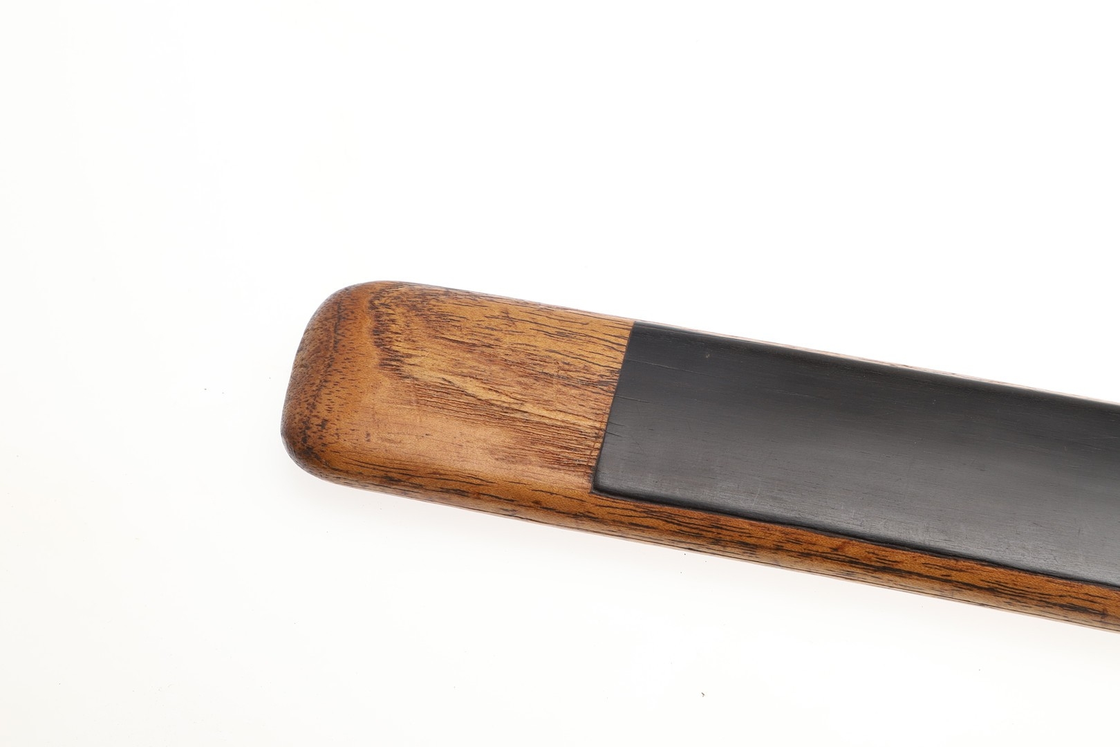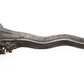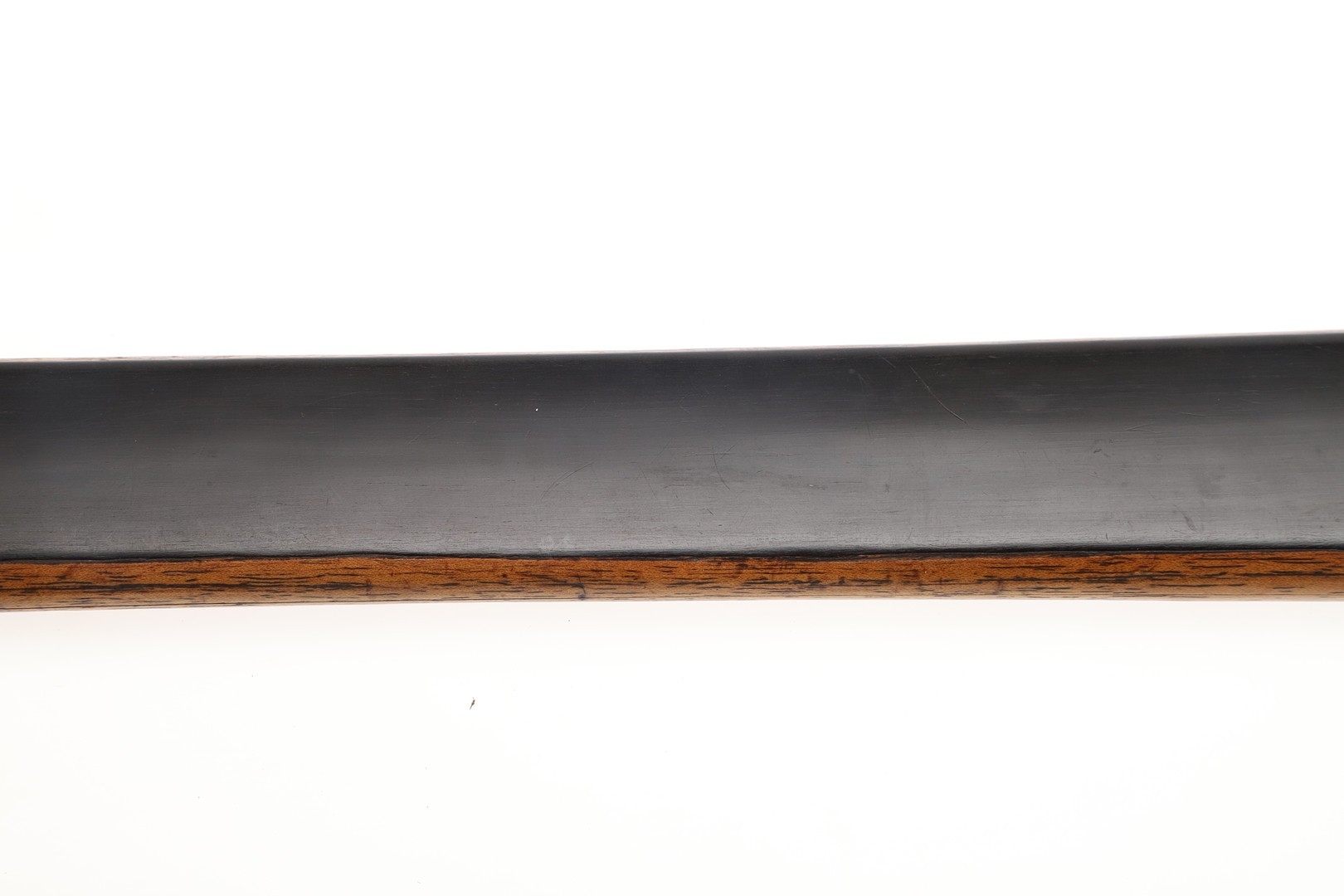 A KRIS NAGARAJA AND SCABBARD FROM LOMBOK OR BALI. The 45 cm ten curved blade with the Naga snake carved in relief to almost the entire length of the blade. The Naga wearing a royal tiara. On a turned wooden grip with a woven cover. In a plain wooden scabbard of the Lombok Bali type, the Sampir of fine black wood. 66.5 cm.