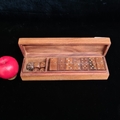 A wooden vintage domines and dice set. Held in a partitioned wooden box with brass accents.