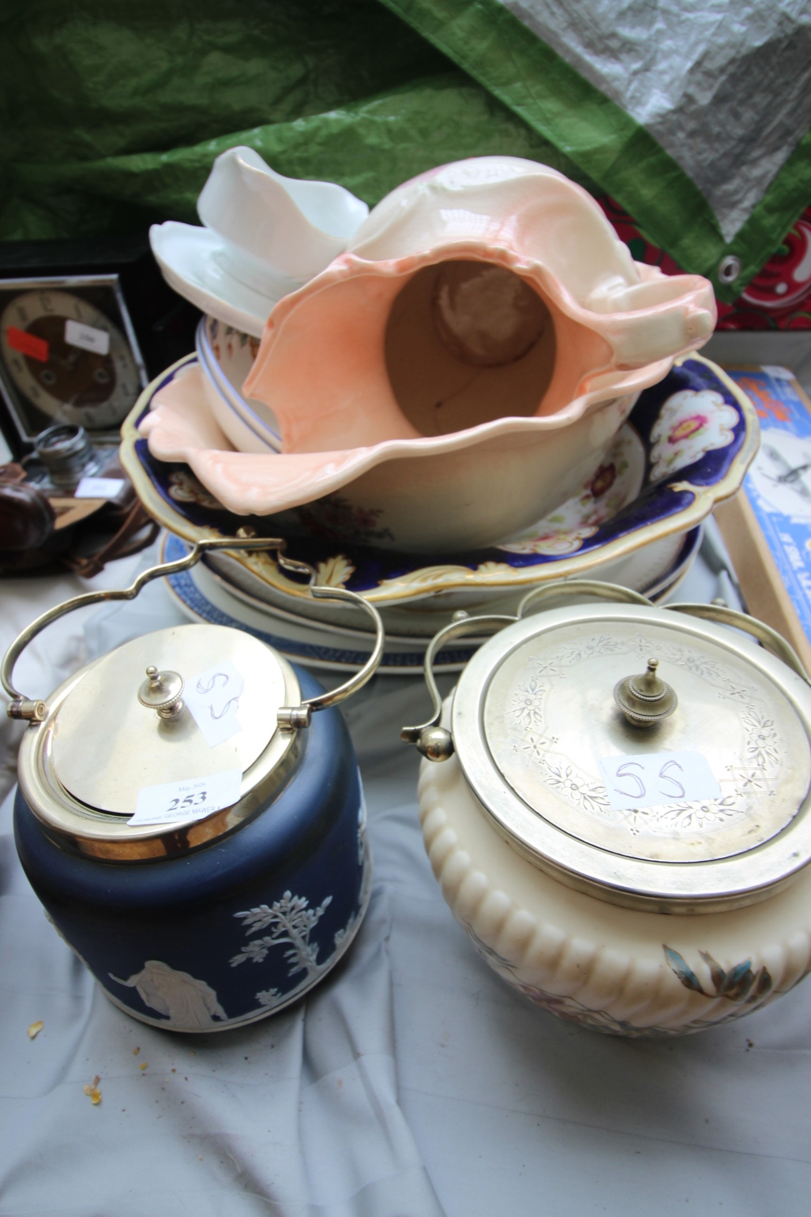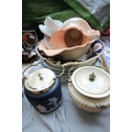 Mixed lot of various china, toilet bowl, additional toilet bowl, meat trays and 2 biscuit barrels
