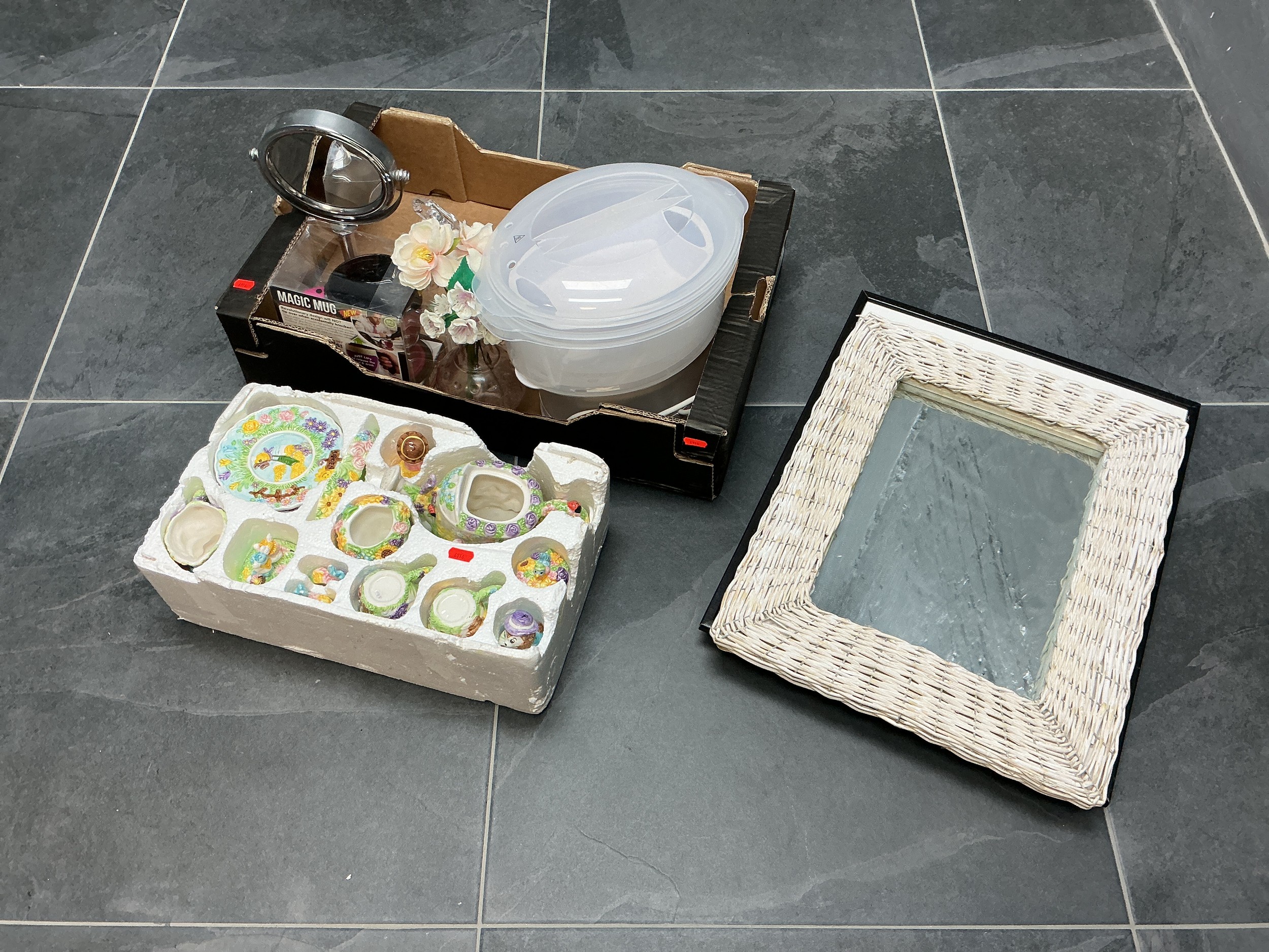 A Selection of Household Items - Includes Russell Hobbs Steamer (Powers On), Garden Tea For Two Set (As Found), Wicker Framed Wall Mirror, And More