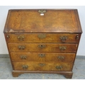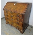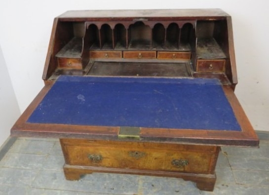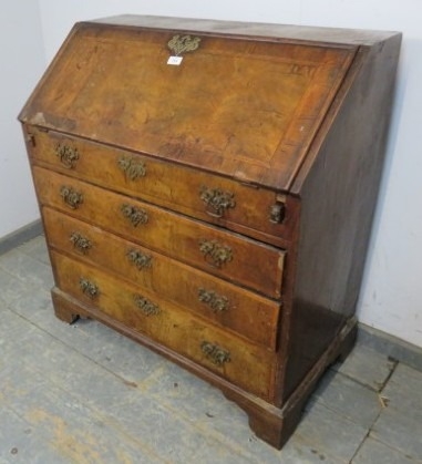 A George III walnut bureau with feather banding and a fall flap with a fitted interior with well over four drawers. H100cm x W91cm x D50cm approx.