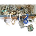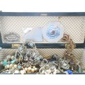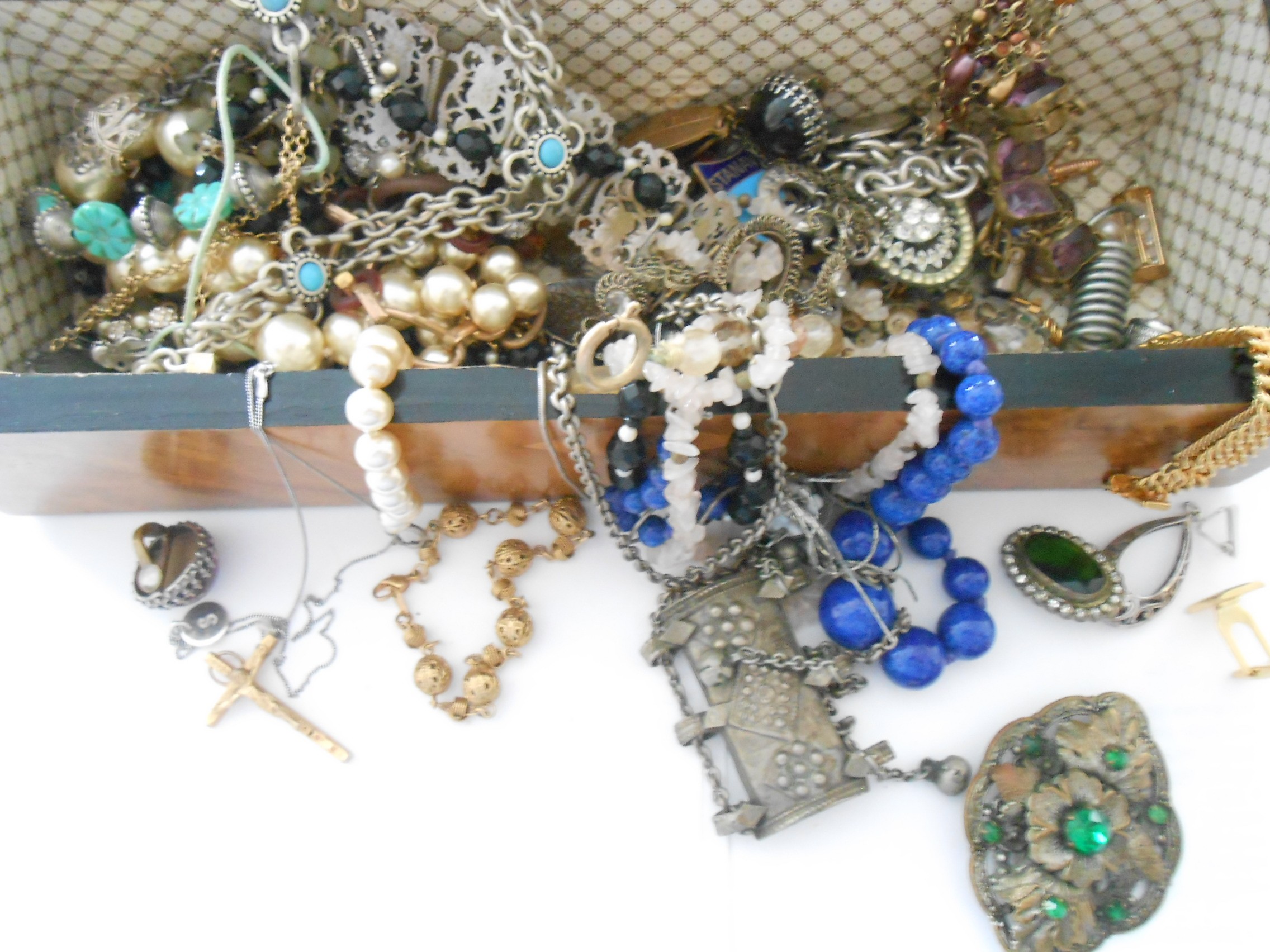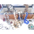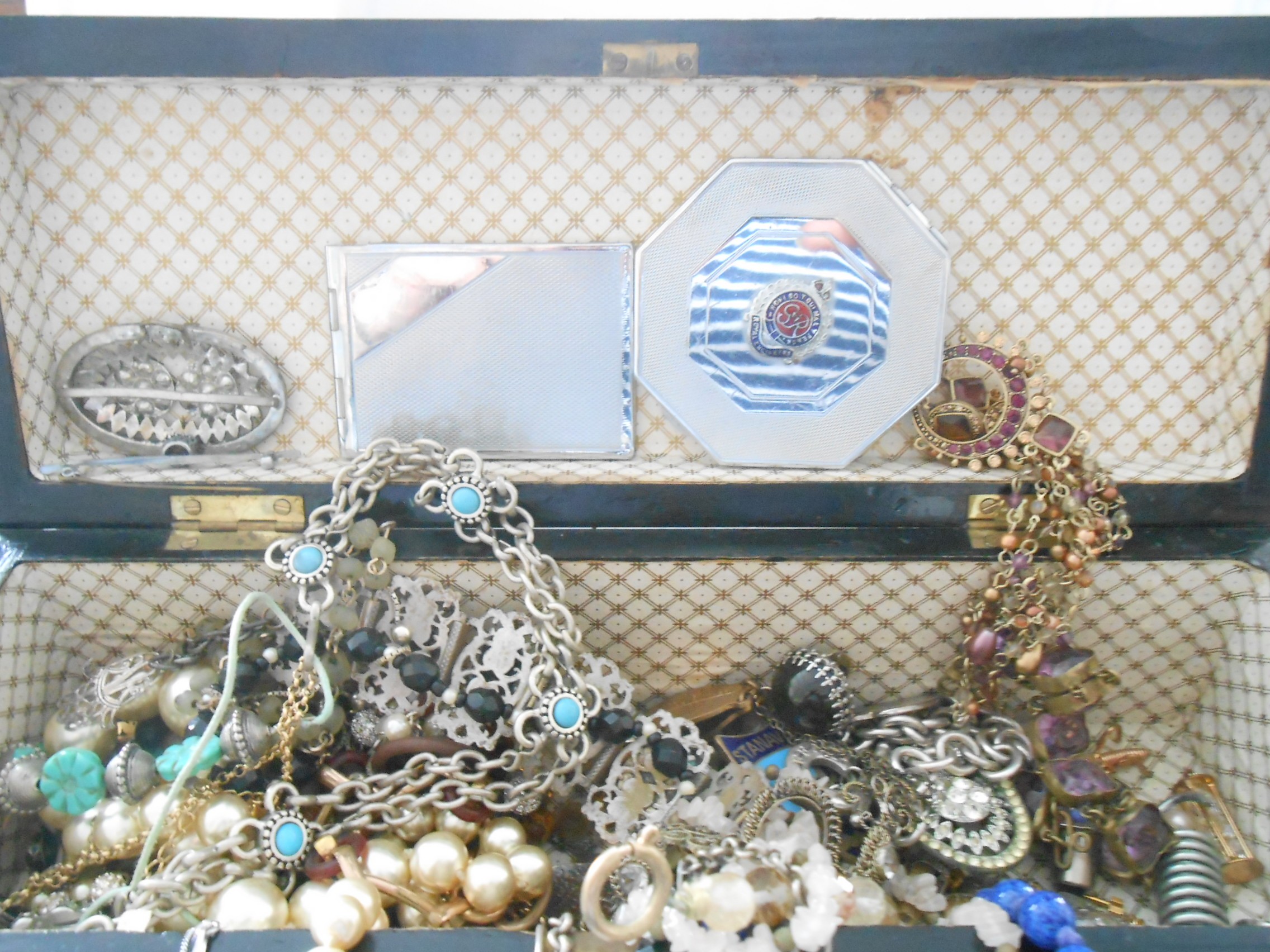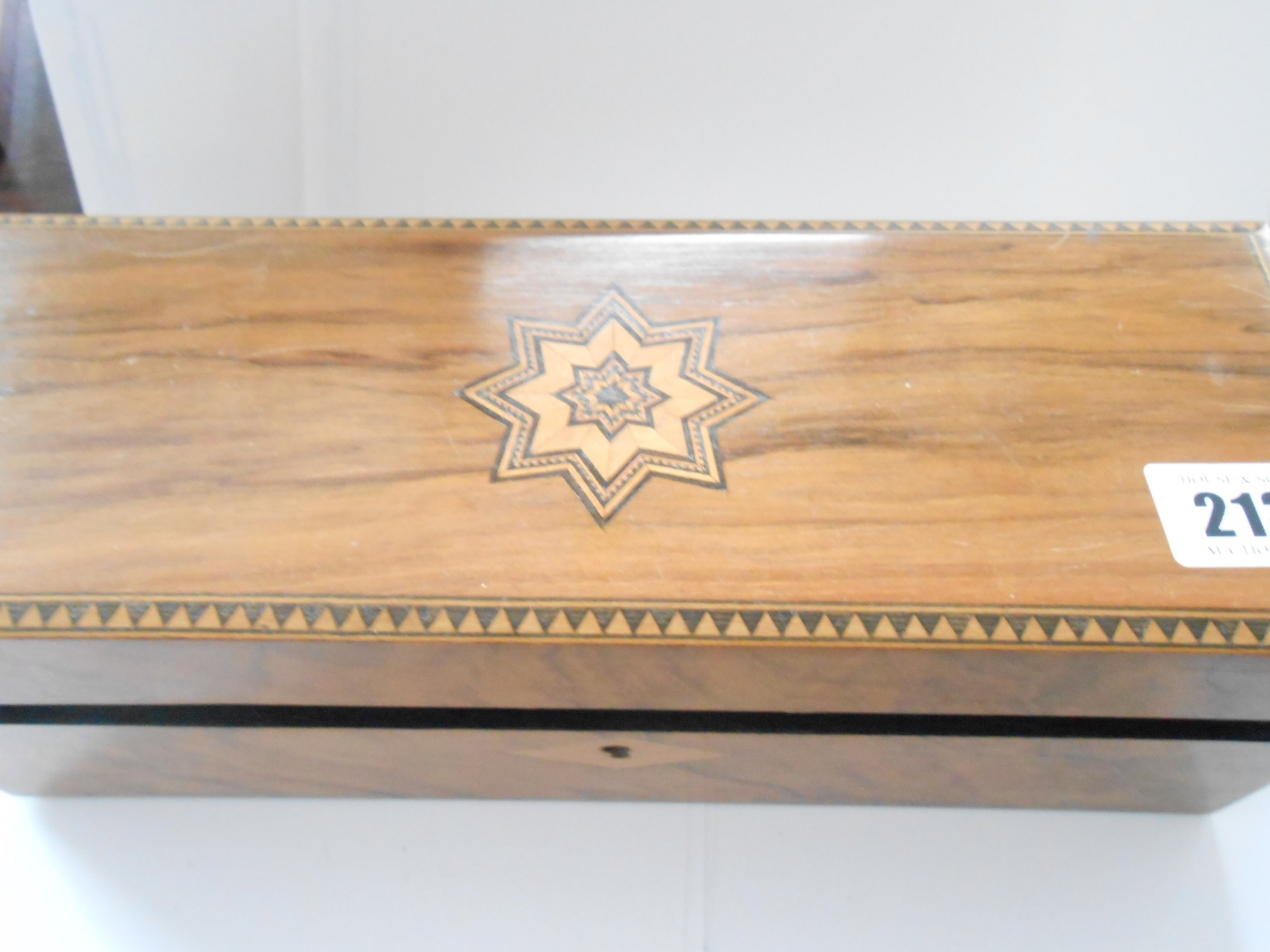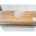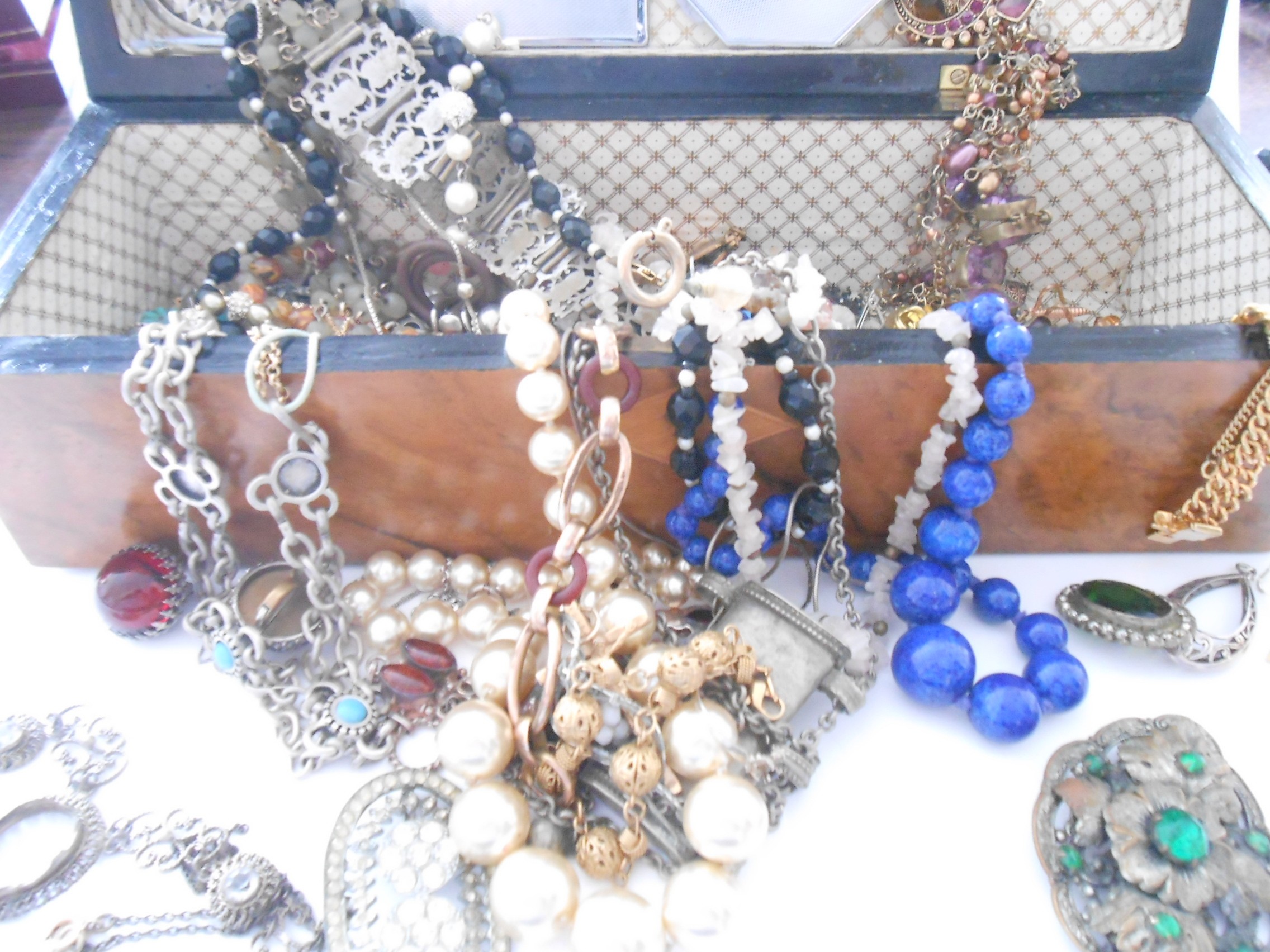 A walnut and inlaid glove box containing a selection of costume jewellery including paste set buckle, compact with Royal Engineers insignia, chrome stamp book, bead necklaces etc..