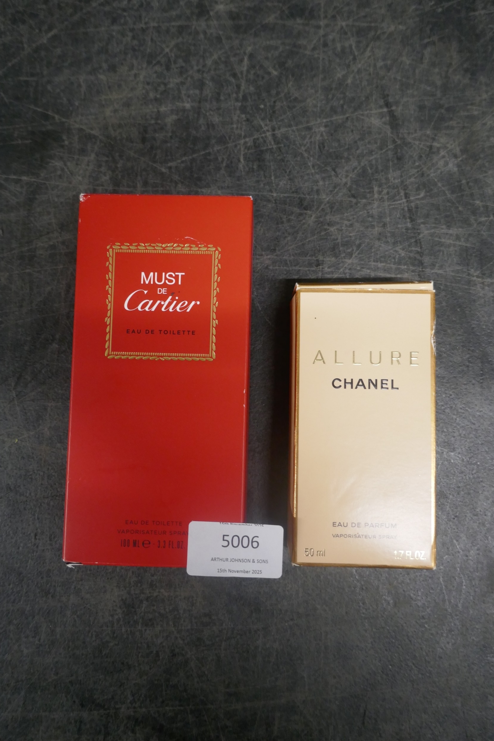 A 50ml bottle of Chanel Allure perfume and a 100ml bottle of Must De Cartier perfume