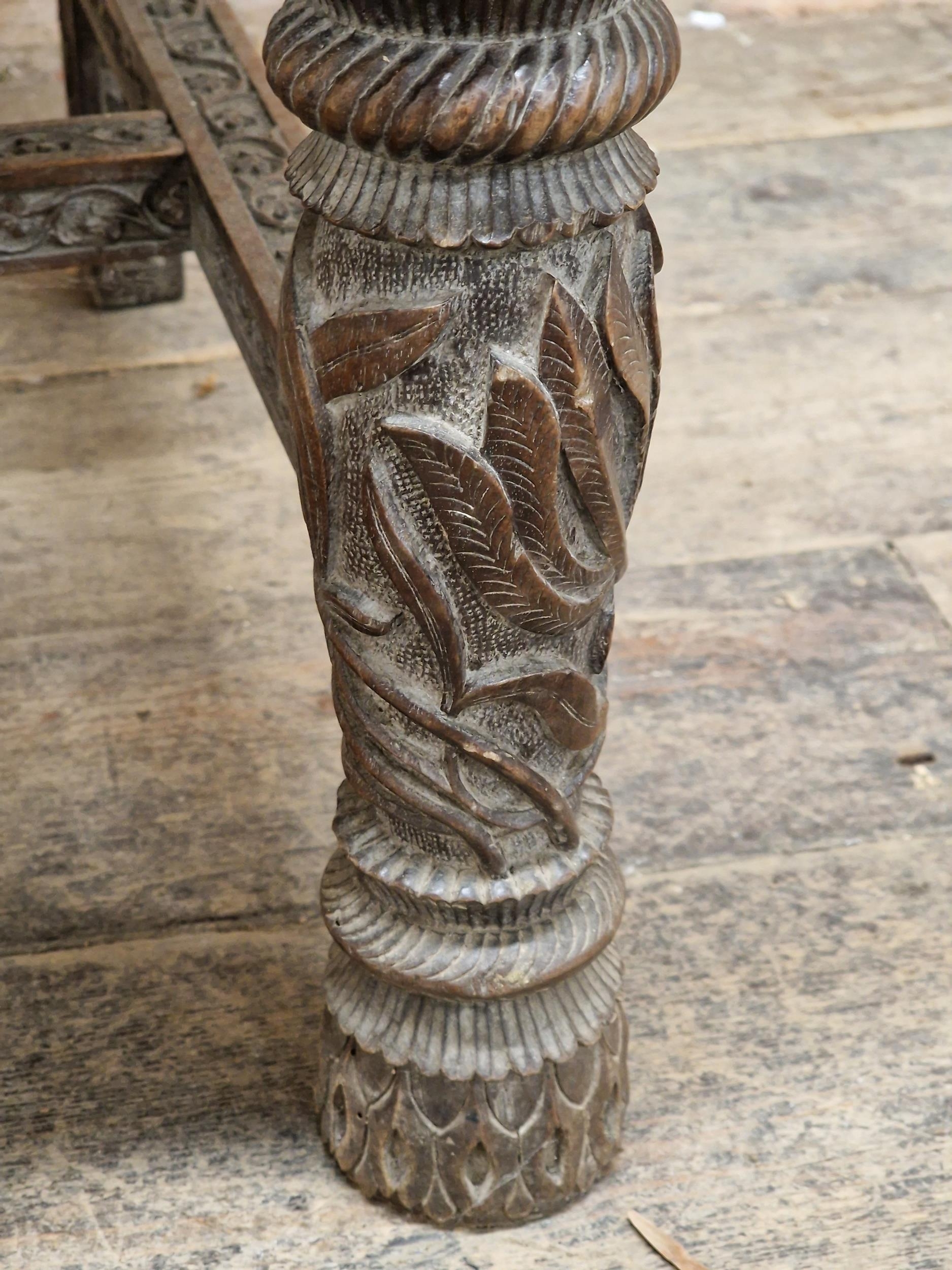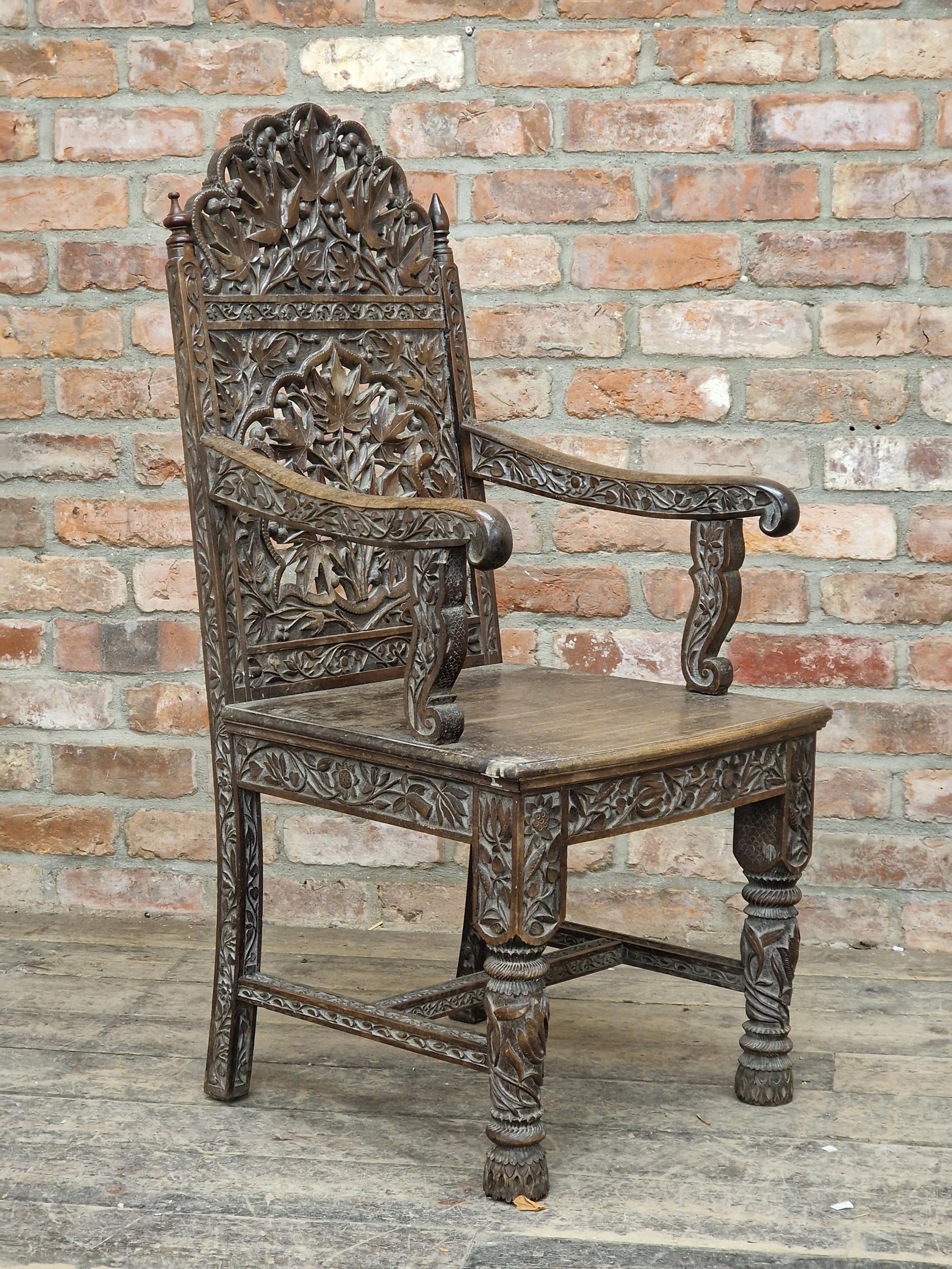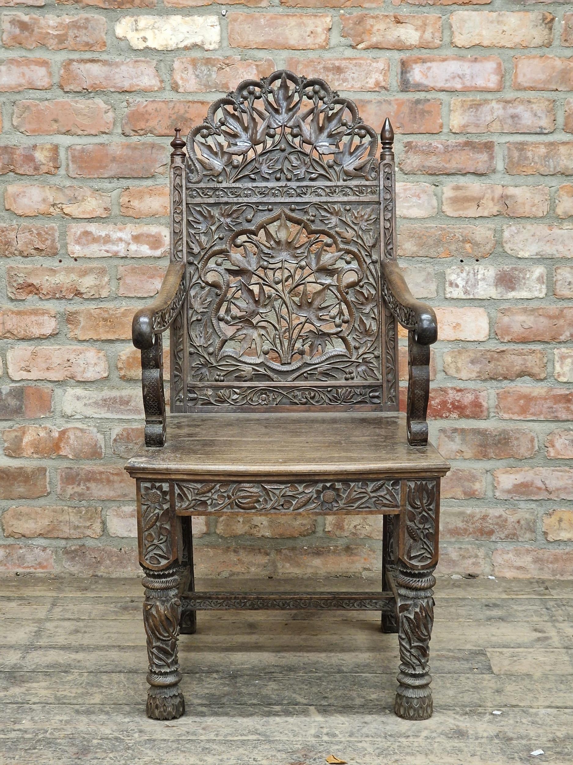 19th century Anglo Indian armchair, profusely carved with pierced floral detail, raised on turned supports, H 111cm x W 54cm x D 54cm