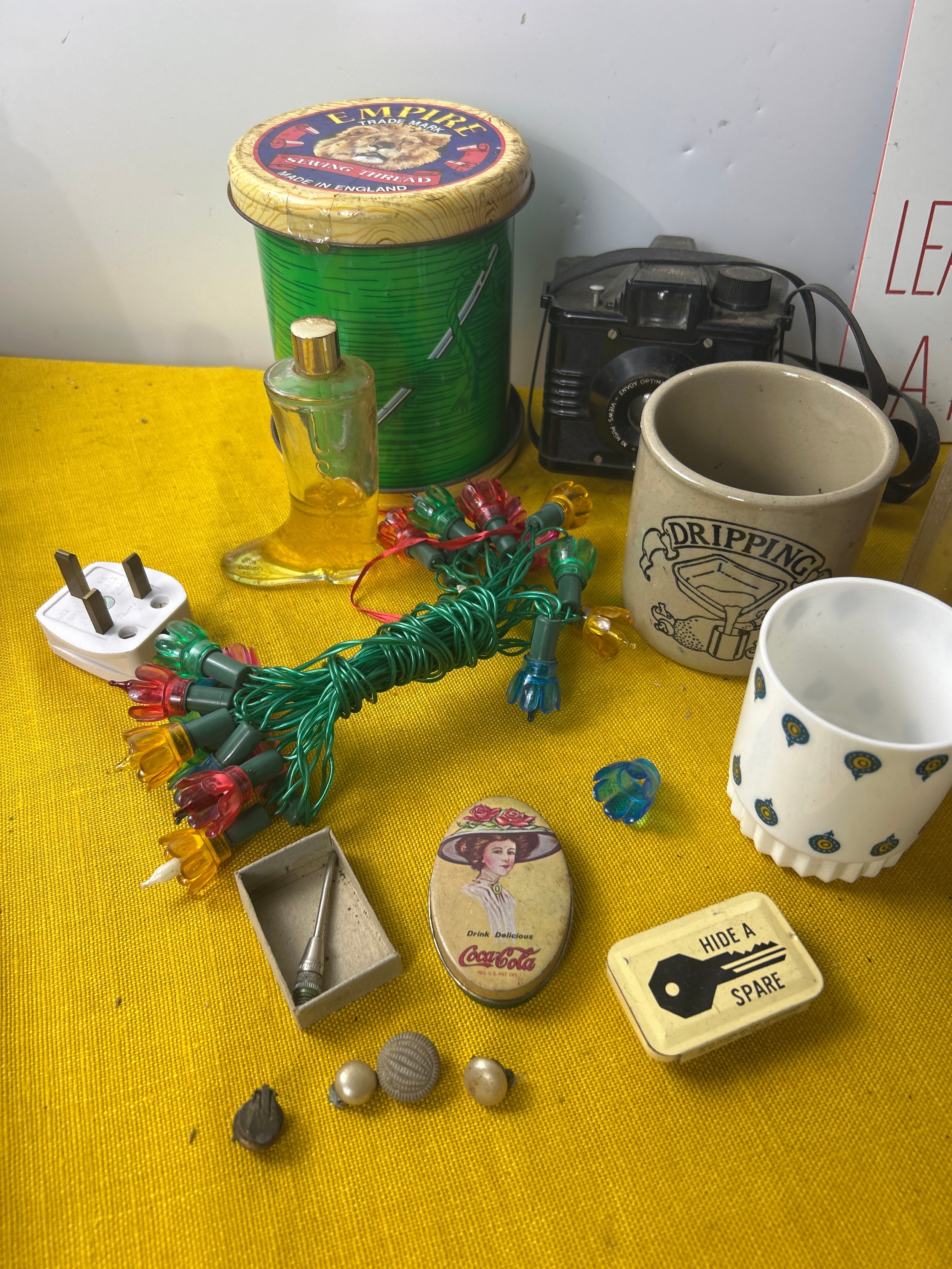 Collectible lot inc vanity set, carving knife, darts, Christmas lights and more