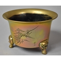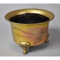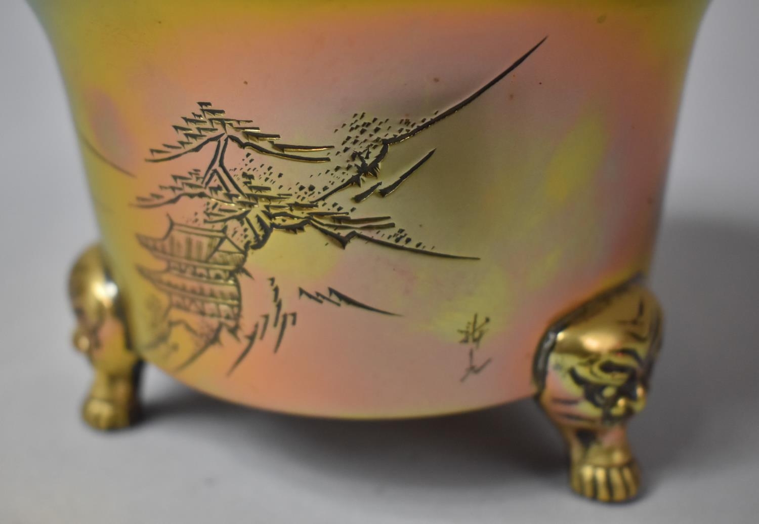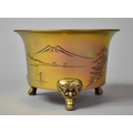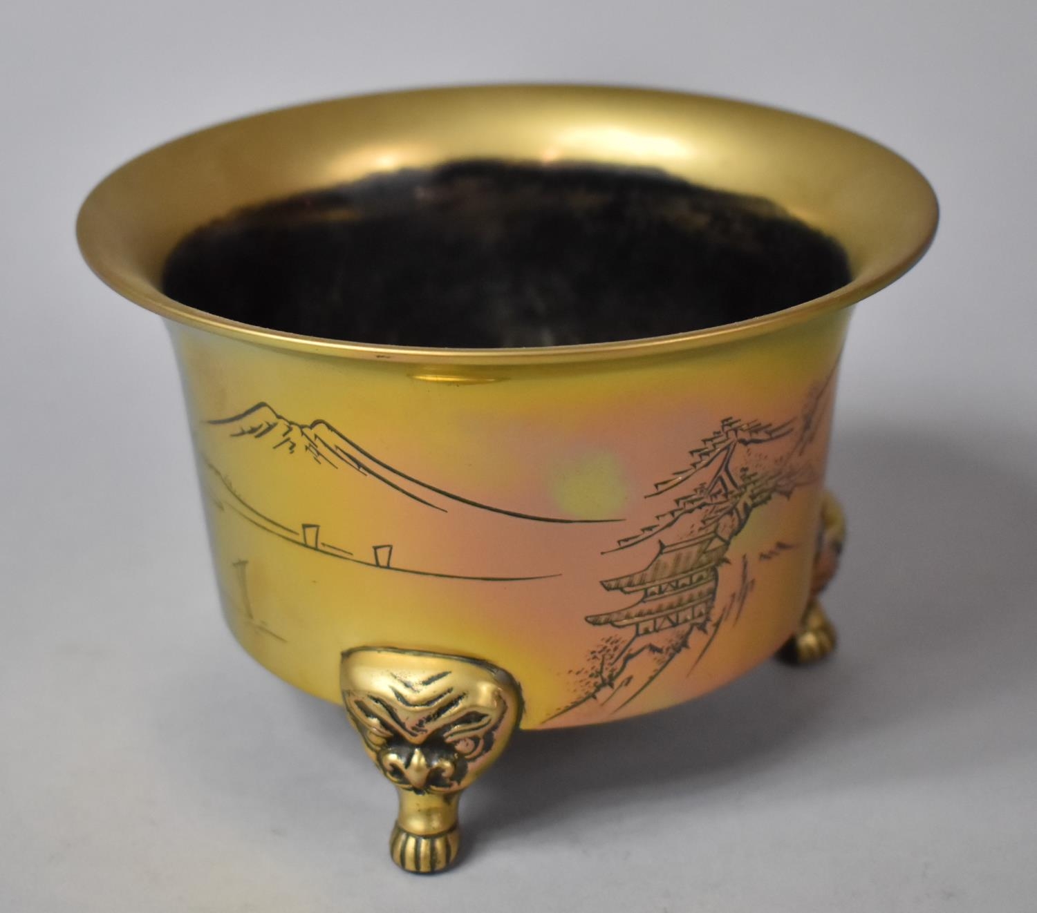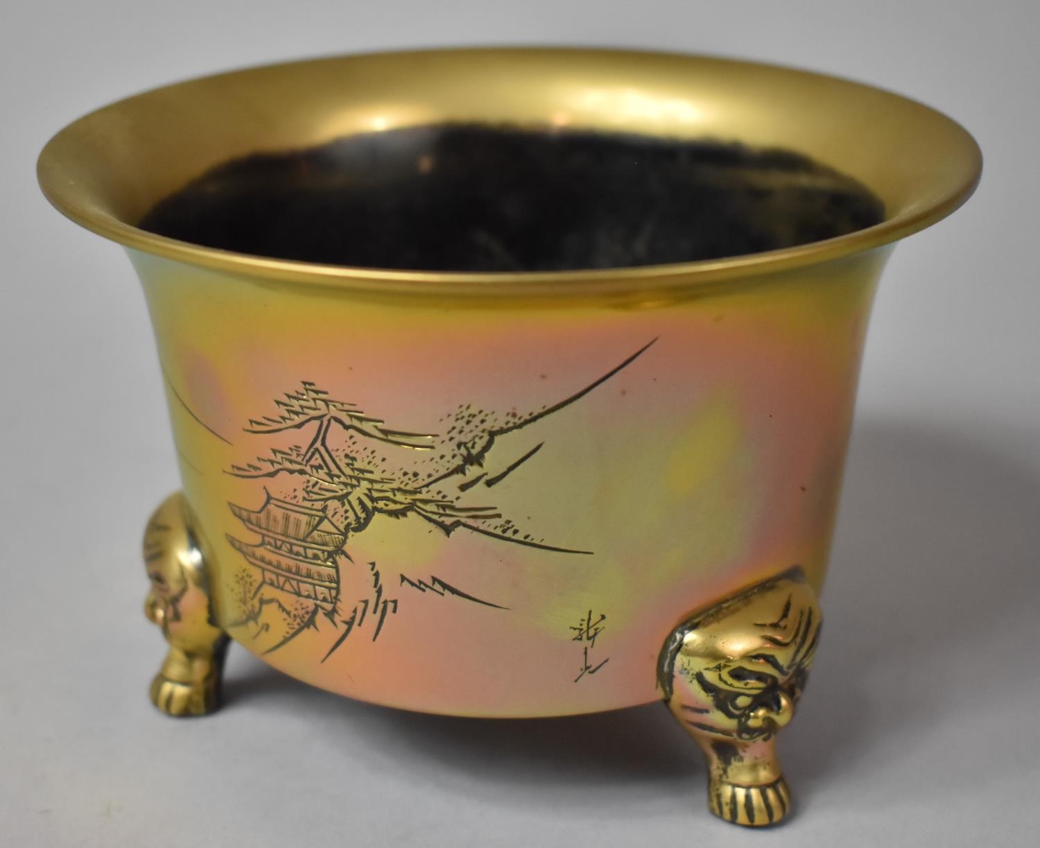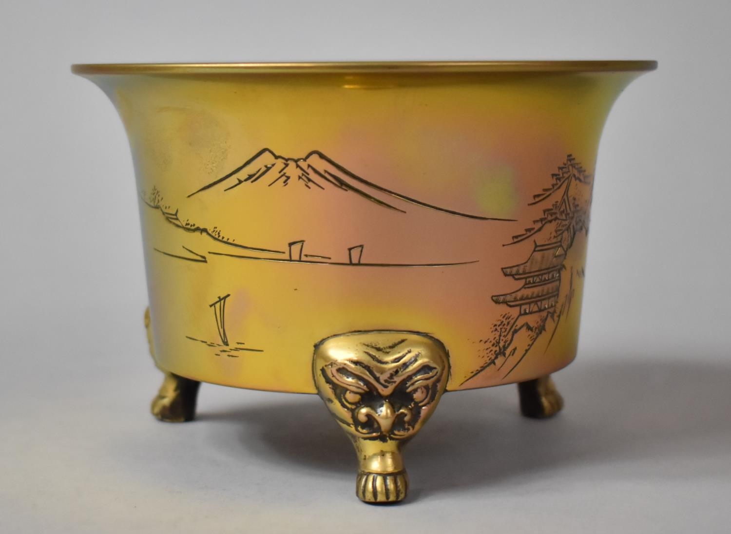 A 20th Century Oriental Polished Brass Incense/Bowl Supported on Tri Stylised Feet, the Body Engraved with Mount Fuji Scene, 9.5cm high and 14cm Diameter