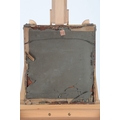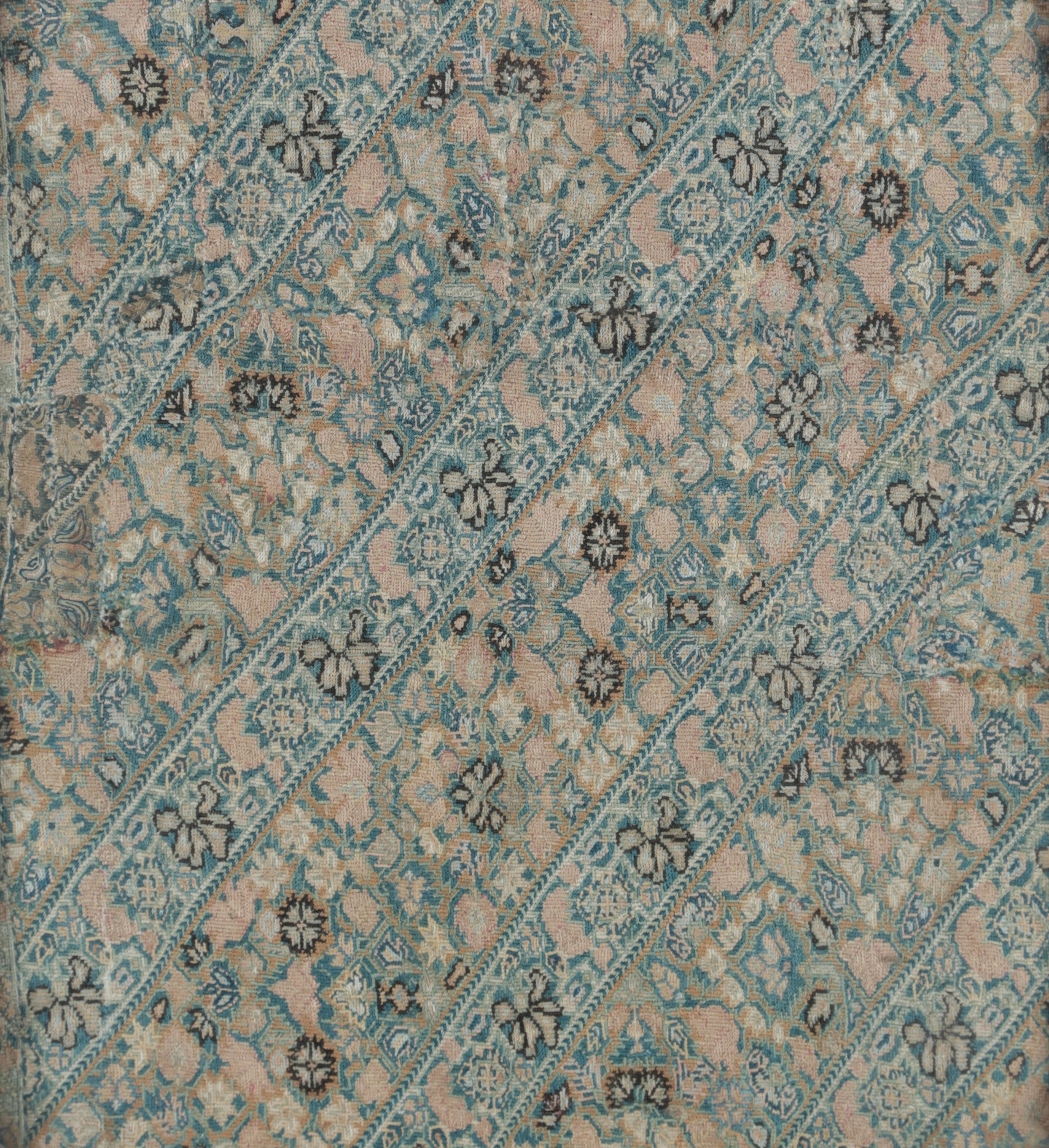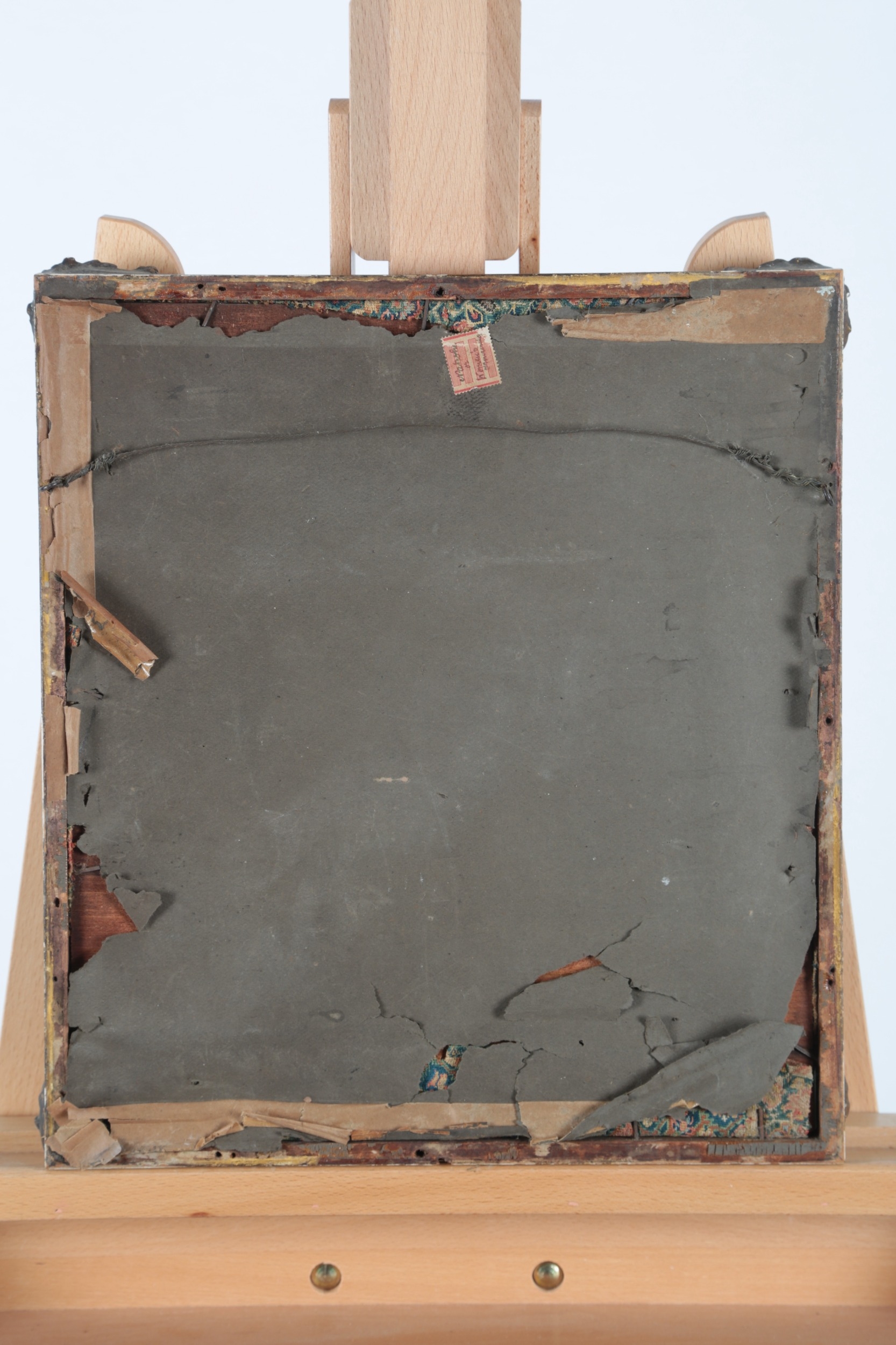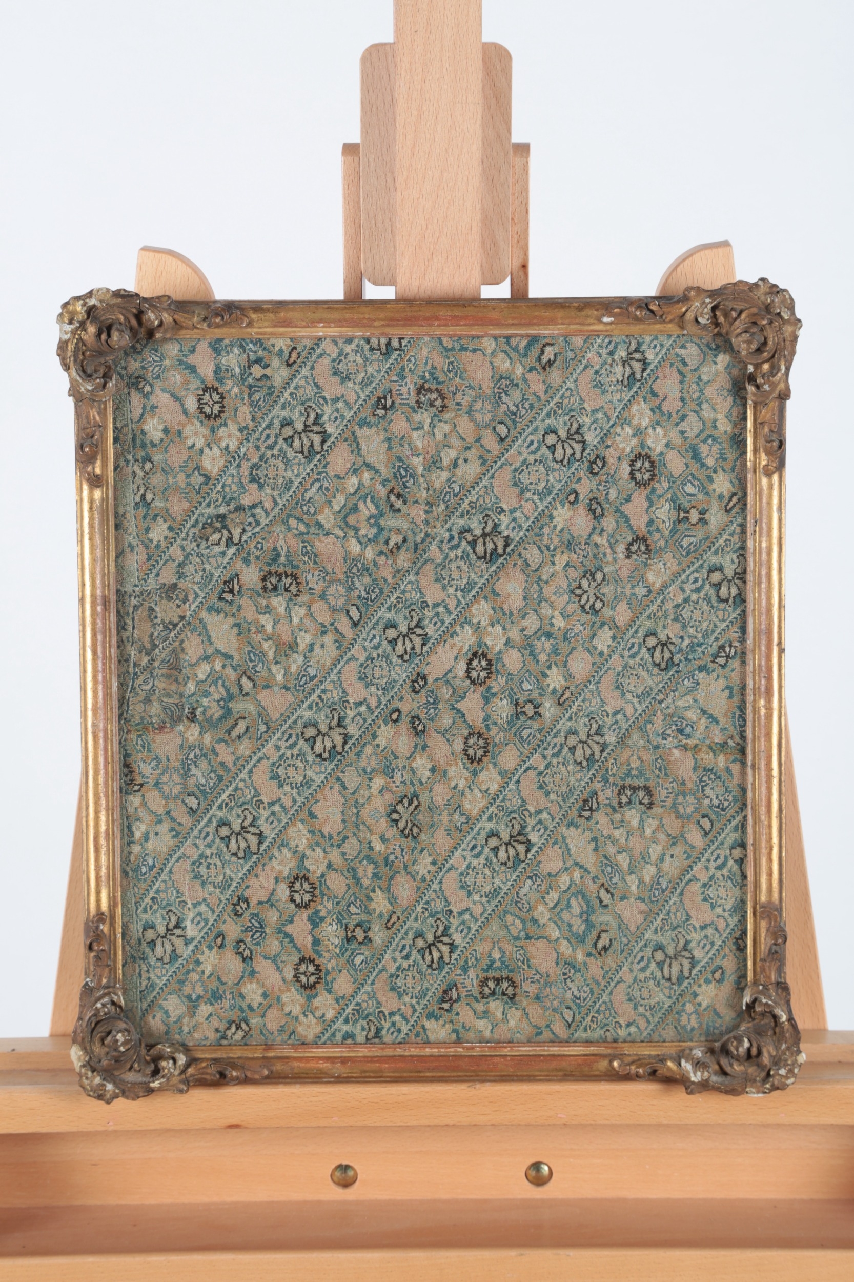 An early to mid 19th century Persian finely needleworked framed panel. worked with mixed finely spun silks and wools in a diagonal stripe with intricate floral motifs, in mostly blues and greens, being fragment from a larger panel, 29cm x 33.5cm.