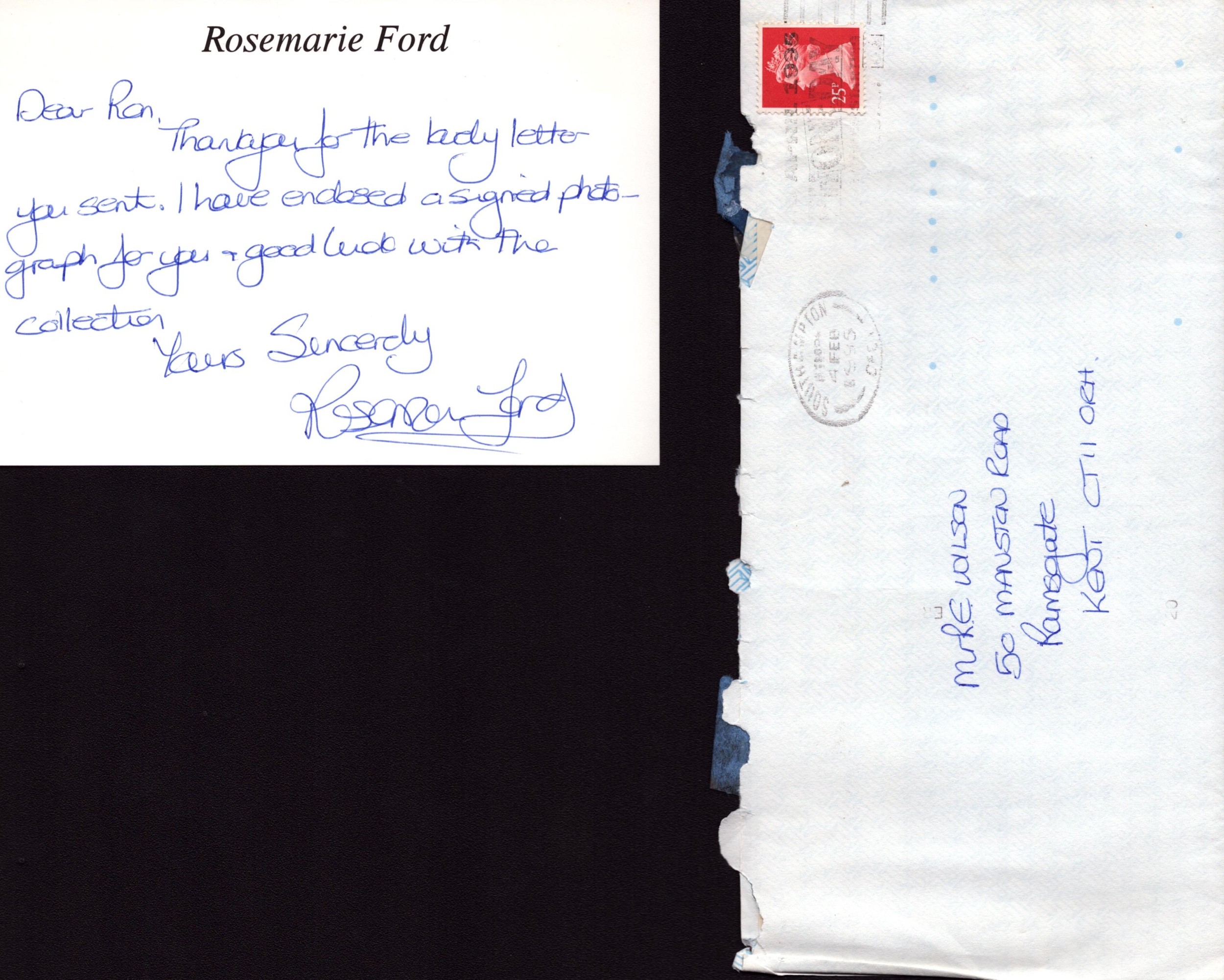 Rosemarie Ford handwritten and signed 6x4 white card, dedicated.