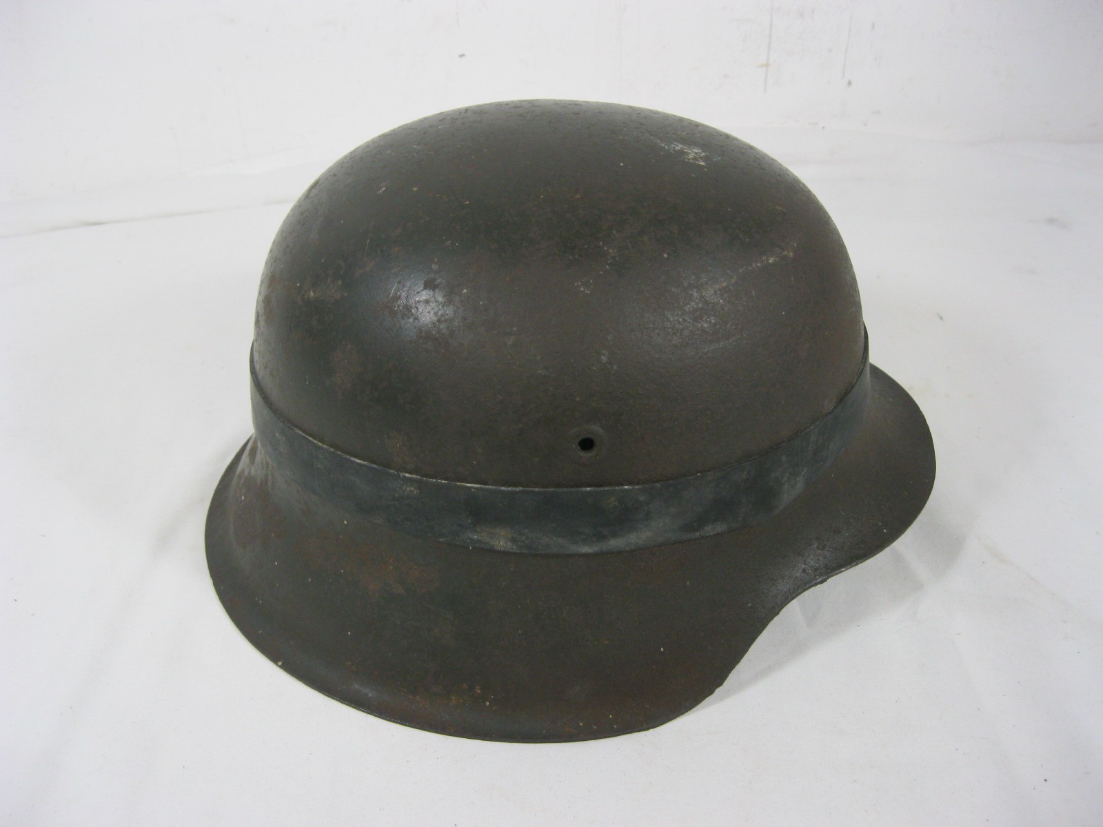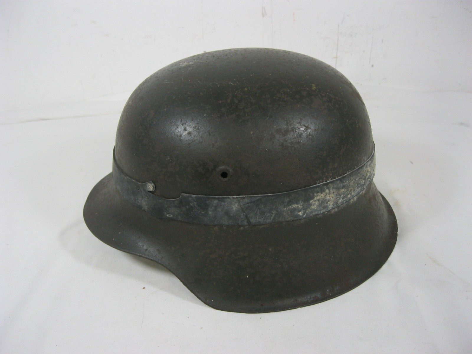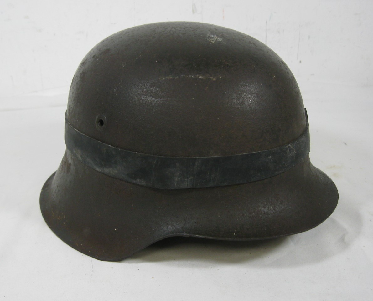 A WW2 German M1942 Helmet with liner. Vendor advises it was picked up near Caen in Normandy by the original postwar owner who passed away in 2005. Fitted with rubber camouflage strap. Light rust to finish. Period manufacturer's stamps under rear skirt partially obscured by surface rust but appear correct style. We believe this to be a genuine WW2 German helmet but as always buyers are reminded that it is their responsibility to satisfy themselves as to originality.