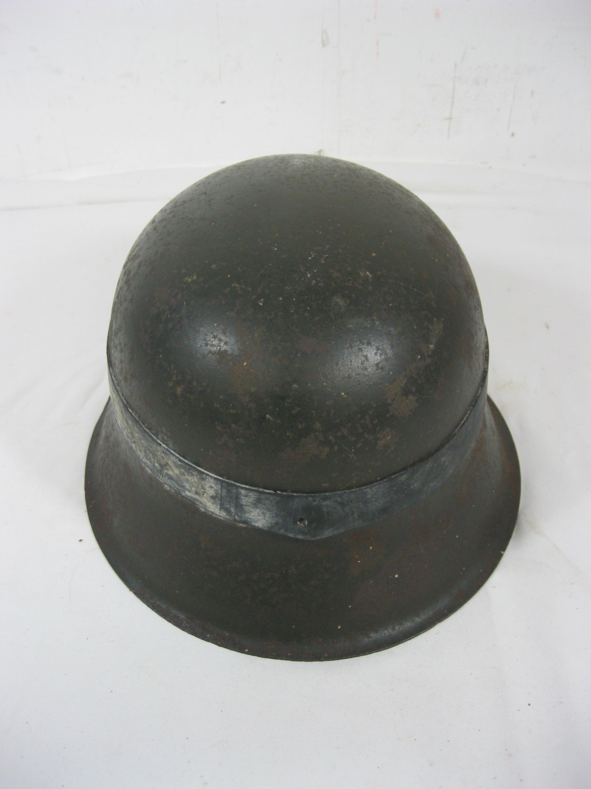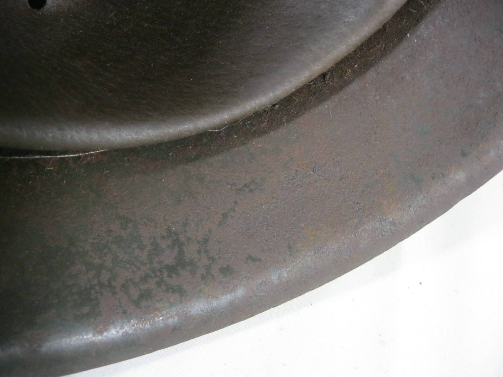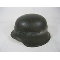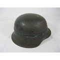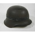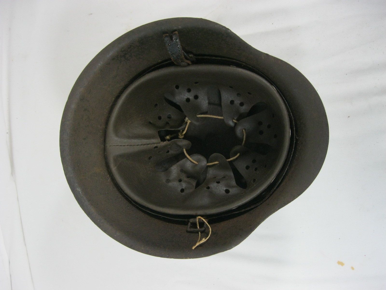 A WW2 German M1942 Helmet with liner. Vendor advises it was picked up near Caen in Normandy by the original postwar owner who passed away in 2005. Fitted with rubber camouflage strap. Light rust to finish. Period manufacturer's stamps under rear skirt partially obscured by surface rust but appear correct style. We believe this to be a genuine WW2 German helmet but as always buyers are reminded that it is their responsibility to satisfy themselves as to originality.