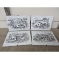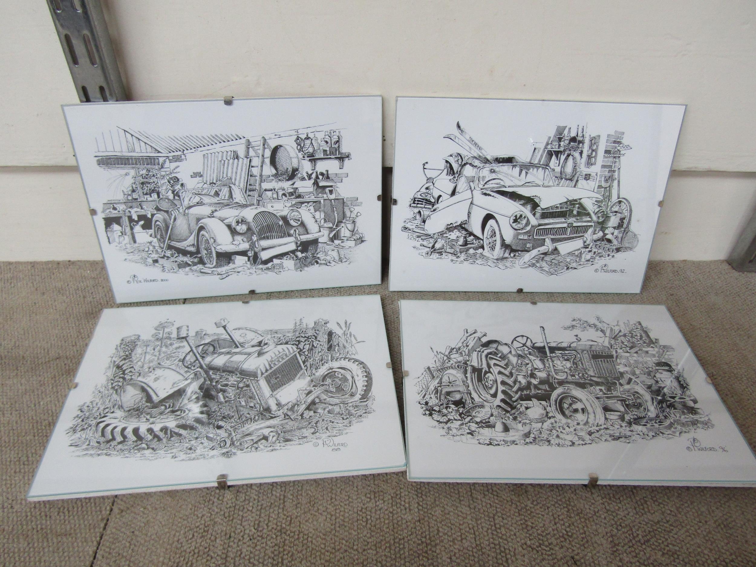 Four framed prints by P. Wilford covering tractors and cars, each 21cm x 15cm