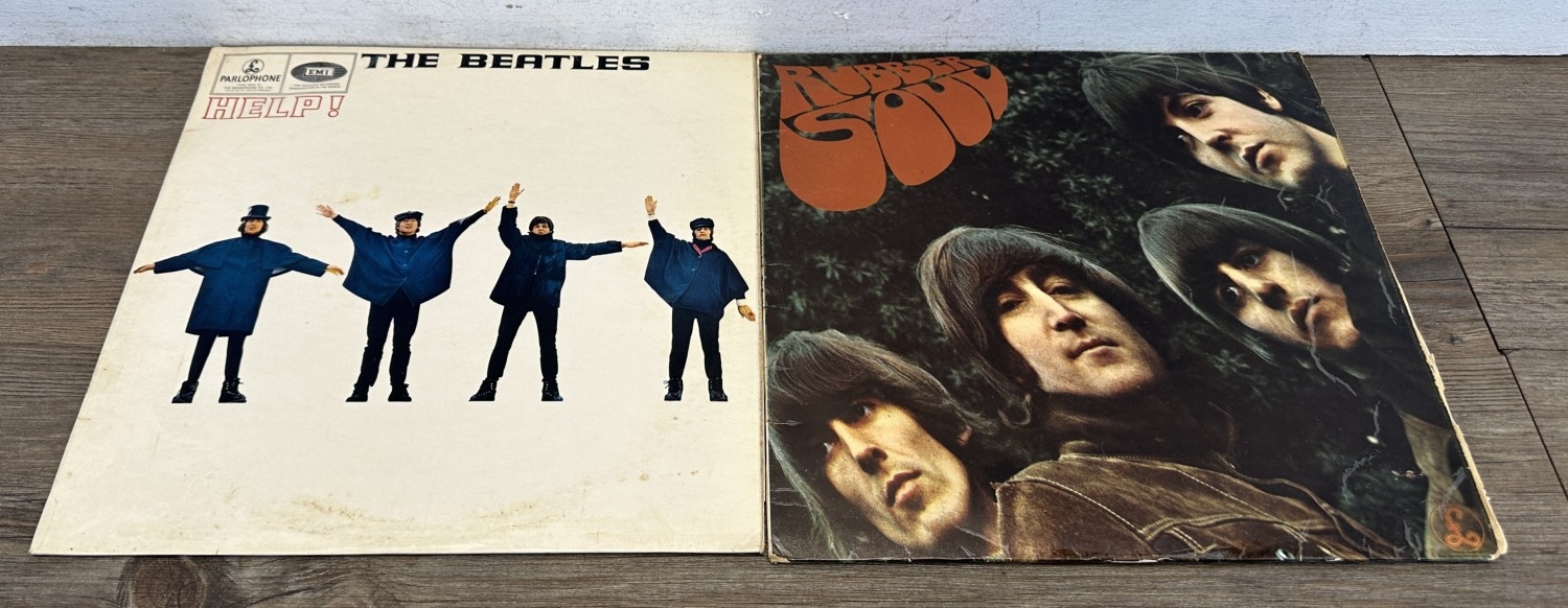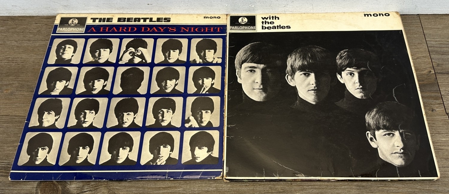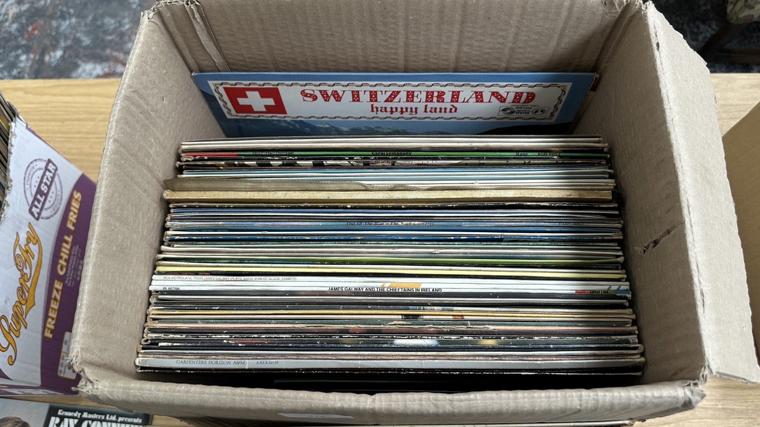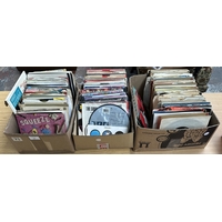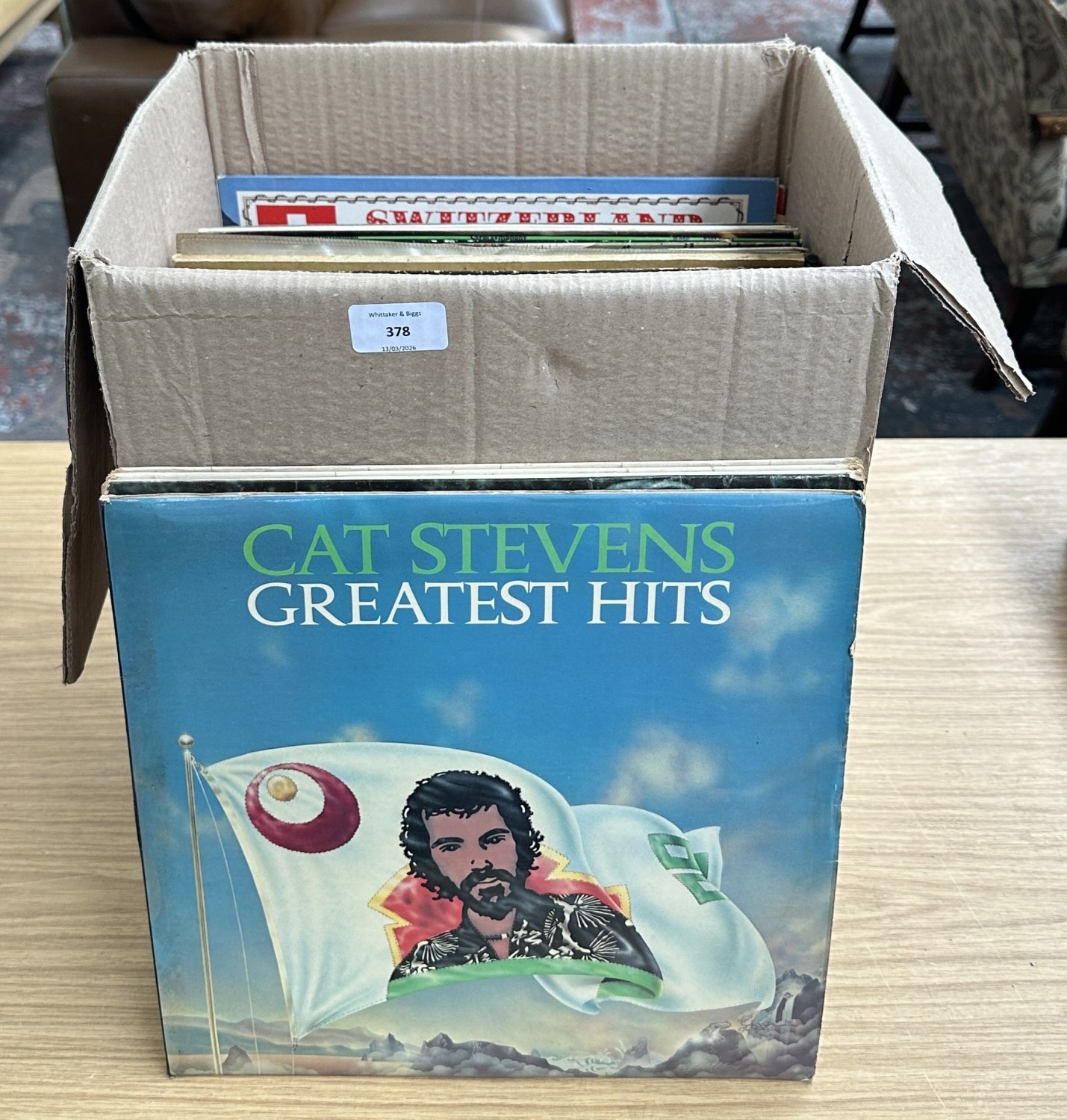 A box containing 7" and LP vinyl records to include The Beatles 'A Hard Day's Night', 'With The Beatles', 'Help!' and 'Rubber Soul', Carole King, Cat Stevens, Abba etc.
