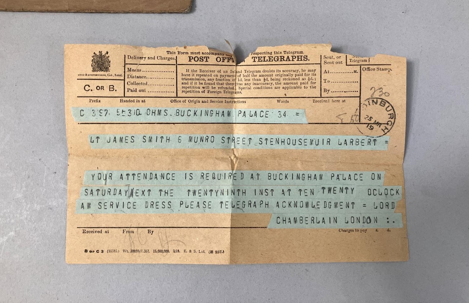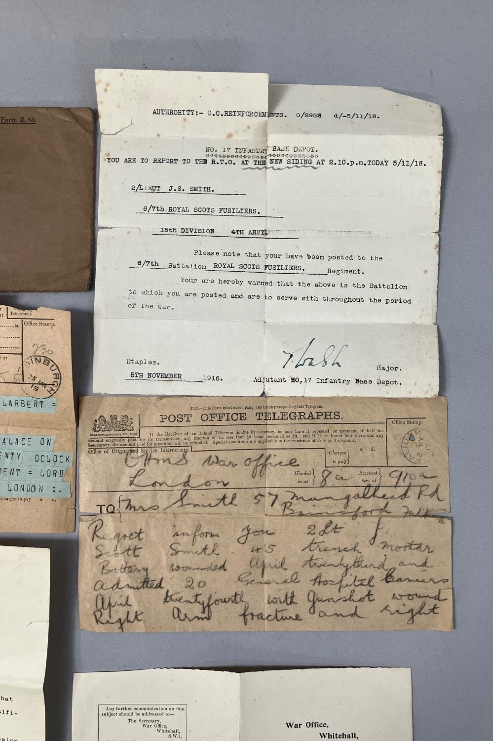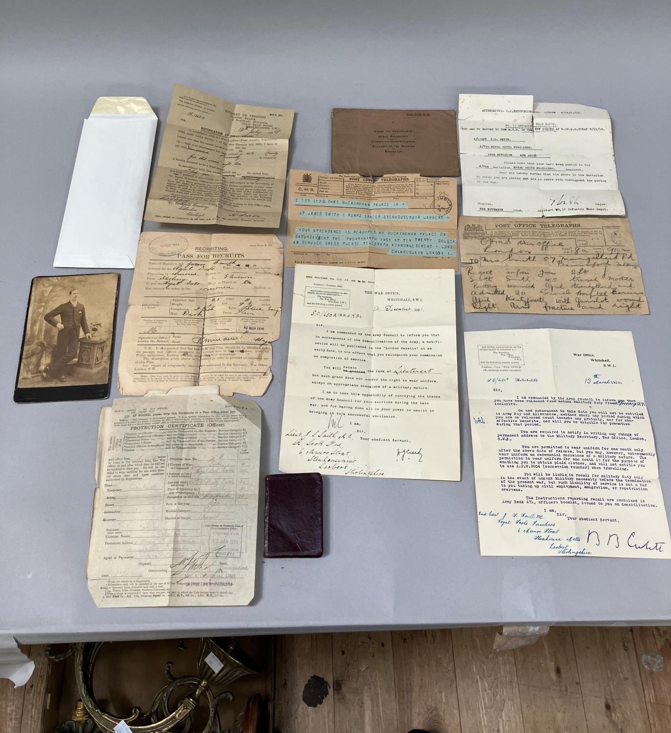 A collection of ephemera relating to the late Lieutenant James Scott Smith, including a telegraph from His Majesty's War Office London to Mrs Smith 'With regret to inform you Second Lieutenant J Scott Smith 45 Trench Mortar Battery wounded April 23rd and admitted to General Hospital at Carmiens with gunshot wound right arm fracture and sight' dated May 1917, a telegraph to the Lieutenant from AHMS Buckingham Palace notifying of the requirement for this attendance at Buckingham Palace on Saturday 29th in service dress, Lord Chamberlain London, letters regarding the release from actual military duty and later the demobilisation of the army, pass for recruits dated 10th November 1914, No. 7 Infantry Base Depot to Second Lieutenant JS Smith of the 6/7th Royal Scots Fusiliers 15th Division 4th Army, letters regarding a war pension following his disablement after being wounded, marriage certificate and other related ephemera, and a photograph presumably of Smith