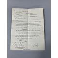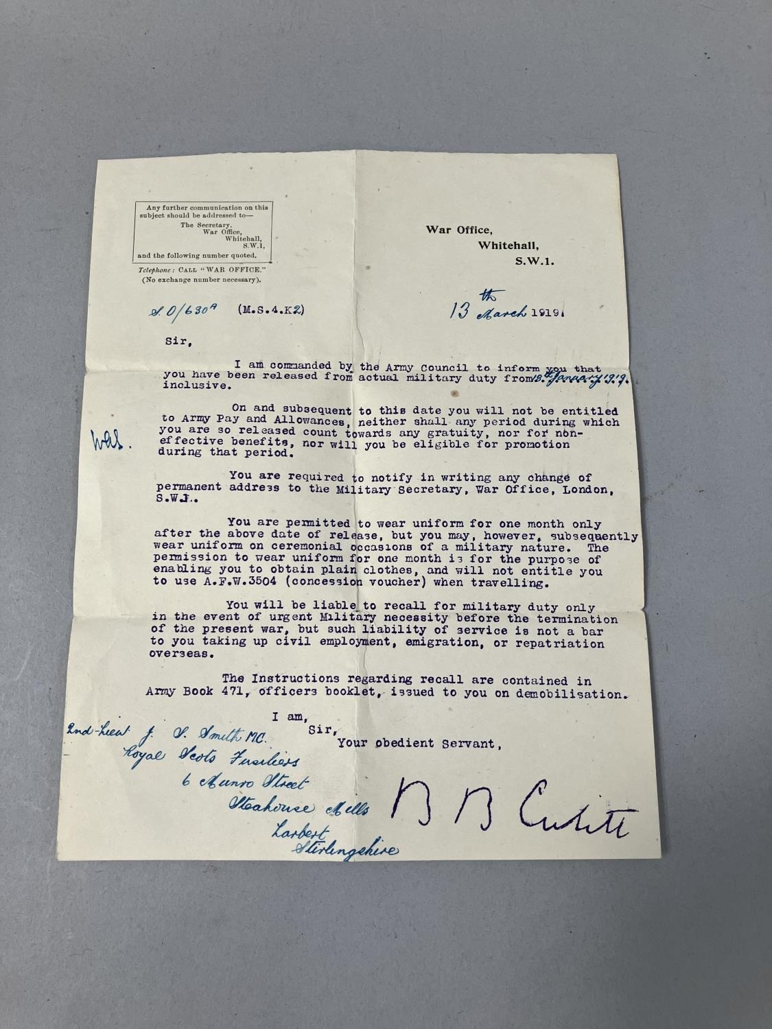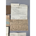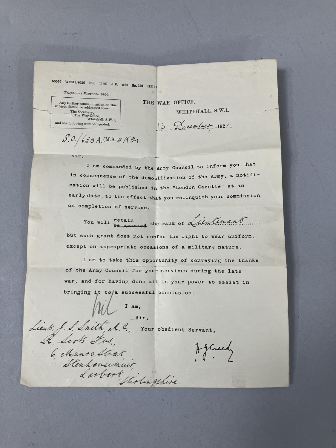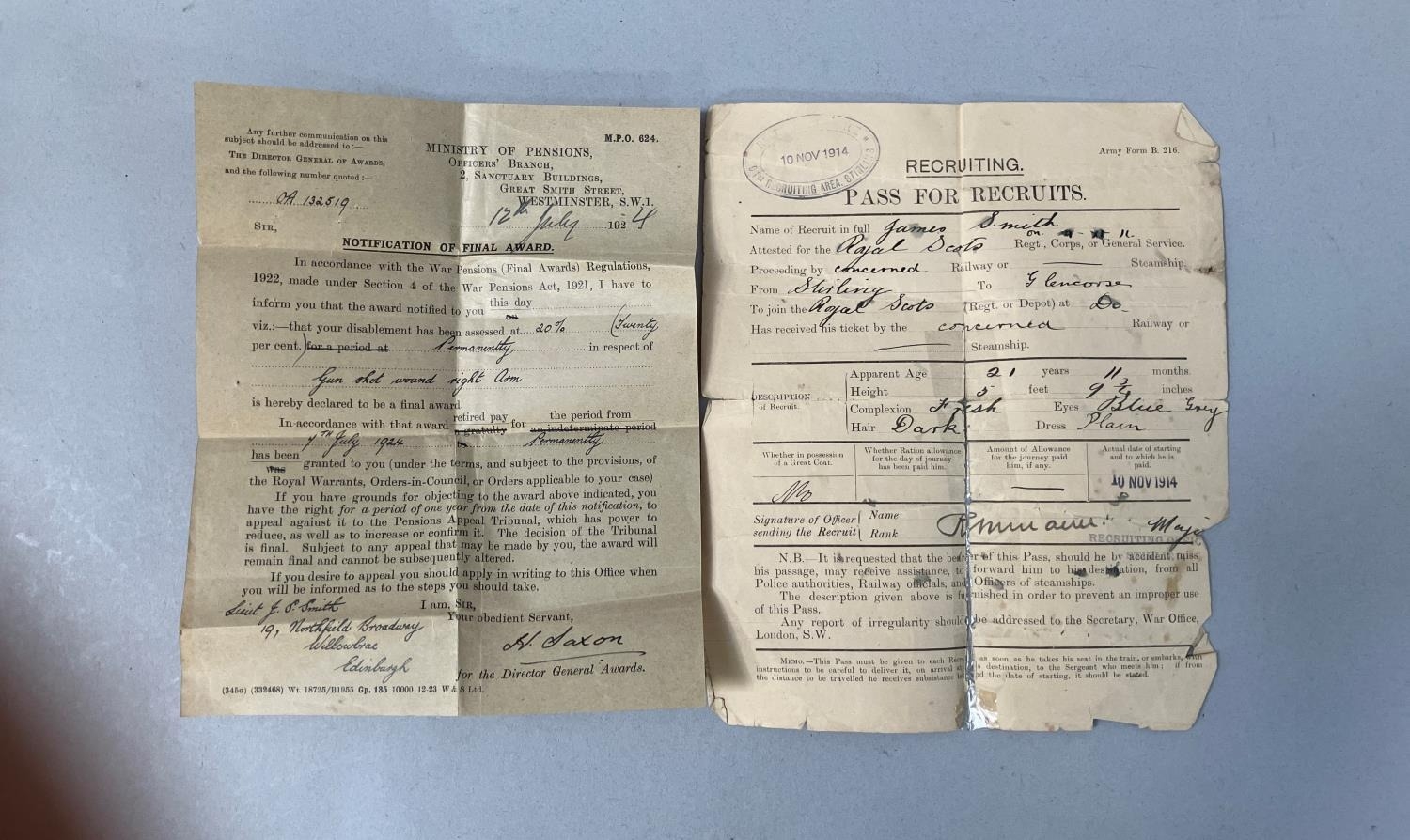 A collection of ephemera relating to the late Lieutenant James Scott Smith, including a telegraph from His Majesty's War Office London to Mrs Smith 'With regret to inform you Second Lieutenant J Scott Smith 45 Trench Mortar Battery wounded April 23rd and admitted to General Hospital at Carmiens with gunshot wound right arm fracture and sight' dated May 1917, a telegraph to the Lieutenant from AHMS Buckingham Palace notifying of the requirement for this attendance at Buckingham Palace on Saturday 29th in service dress, Lord Chamberlain London, letters regarding the release from actual military duty and later the demobilisation of the army, pass for recruits dated 10th November 1914, No. 7 Infantry Base Depot to Second Lieutenant JS Smith of the 6/7th Royal Scots Fusiliers 15th Division 4th Army, letters regarding a war pension following his disablement after being wounded, marriage certificate and other related ephemera, and a photograph presumably of Smith