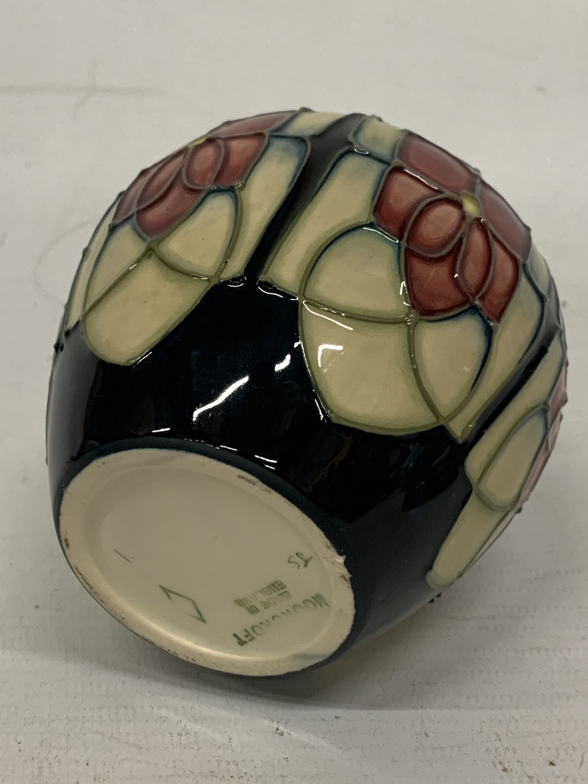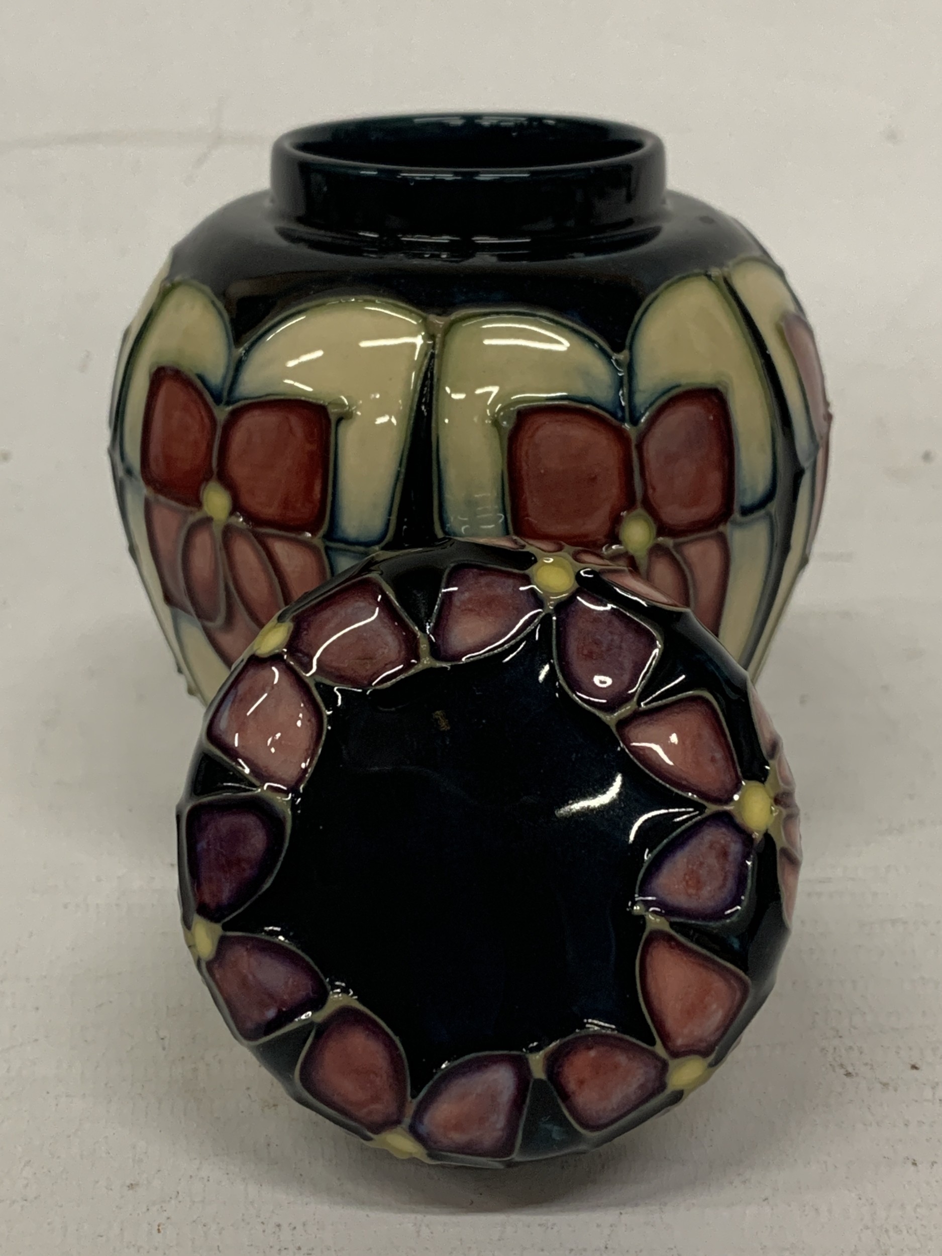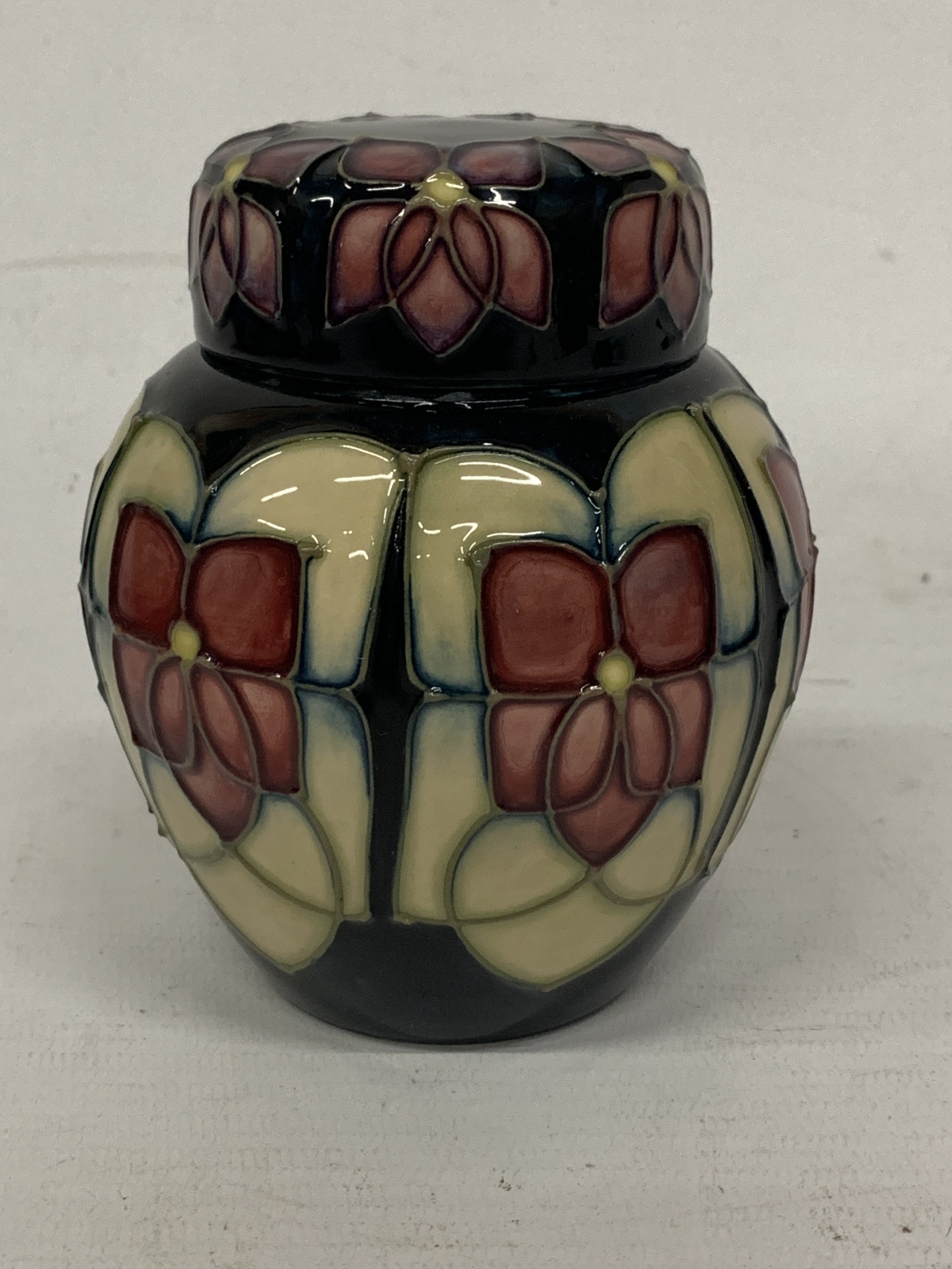 A MOORCROFT VIOLET PATTERN GINGER JAR WITH COVER, HEIGHT 11CM