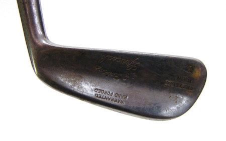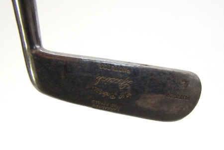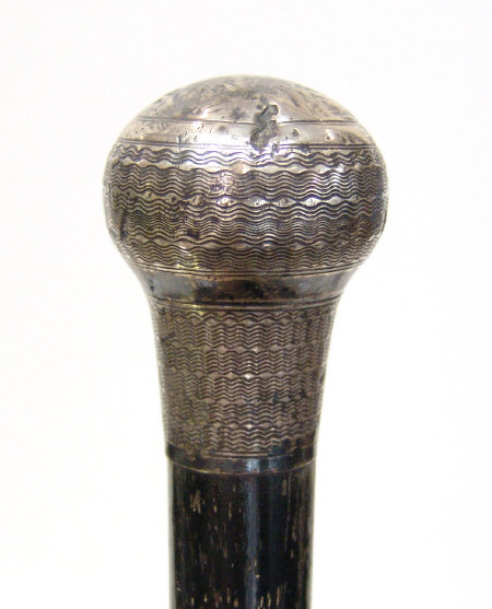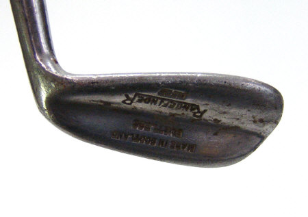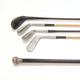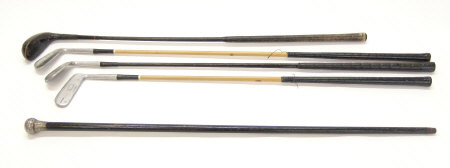 Silver topped ebonised walking cane and four vintage golf clubs by Roberts and Rangefinder