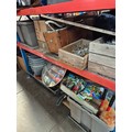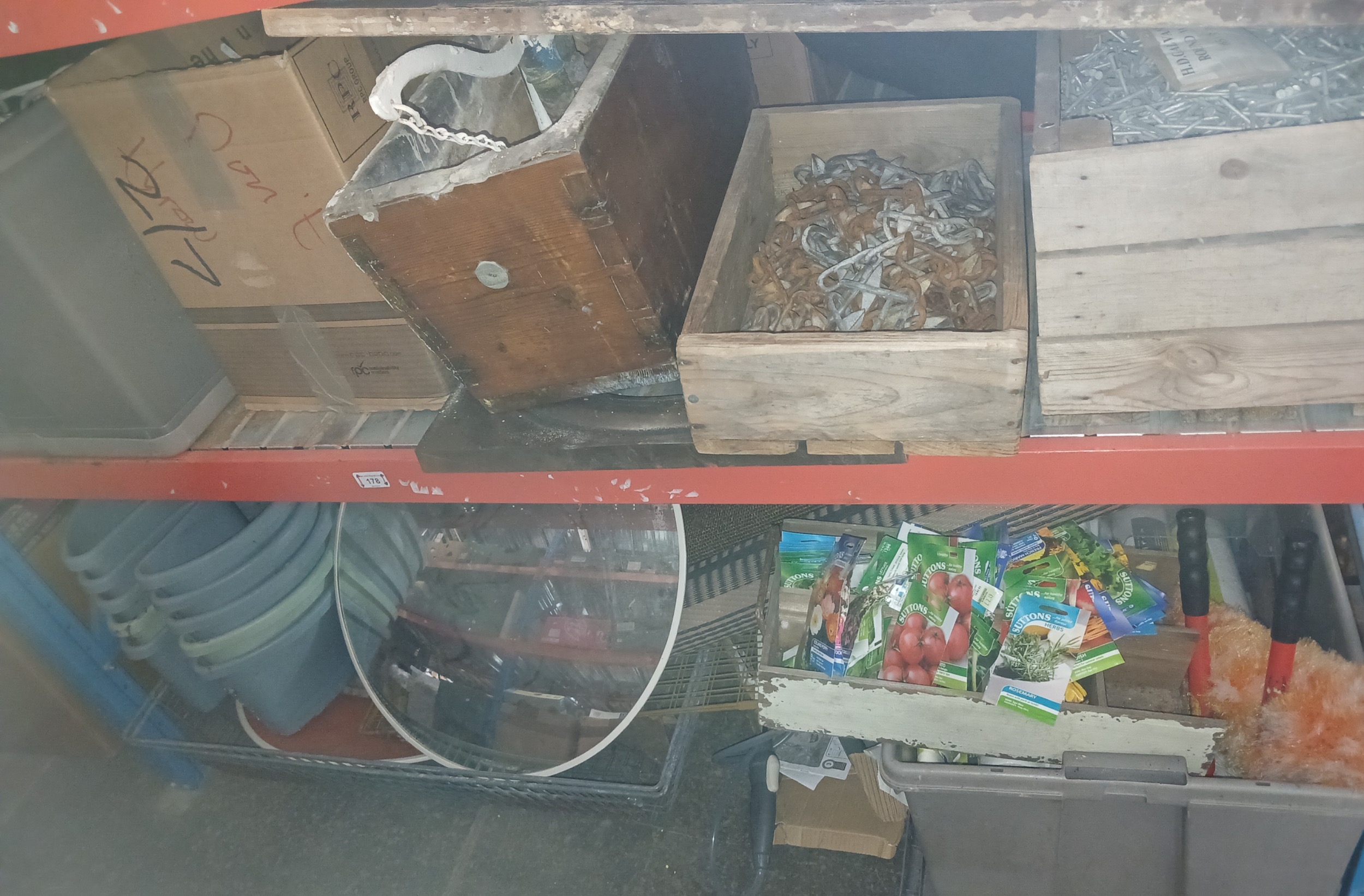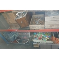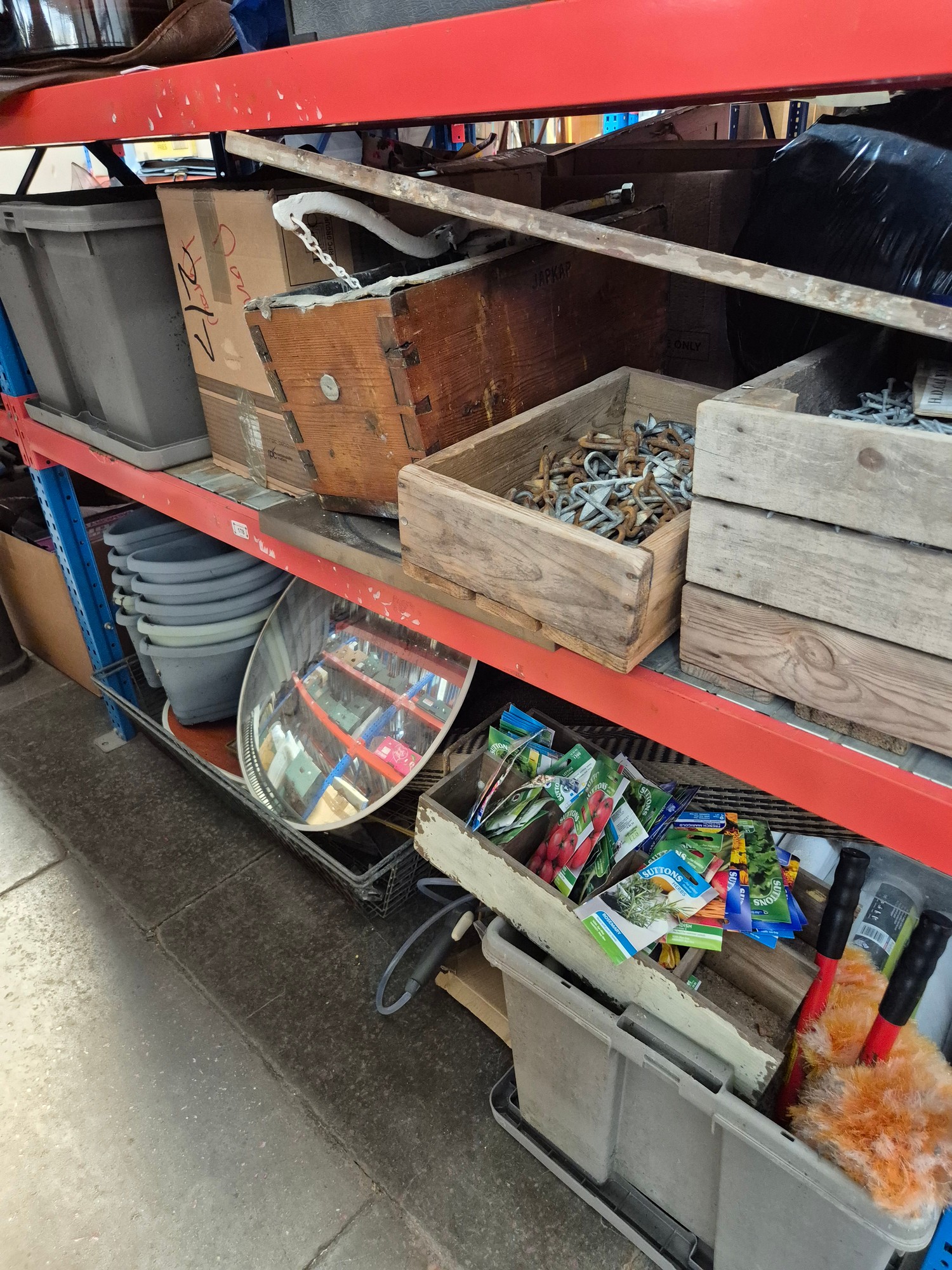2 shelves of garge and garden wares including garden sprayer, seeds, bolt croppers, cable reel, roll of linked chain, radiogram, feather dusters, plant trays, galvanised nails, box of chain, toilet cistern, plant pots, large box of gang plugs and cable reel, rugs, 2 convex mirrors etc