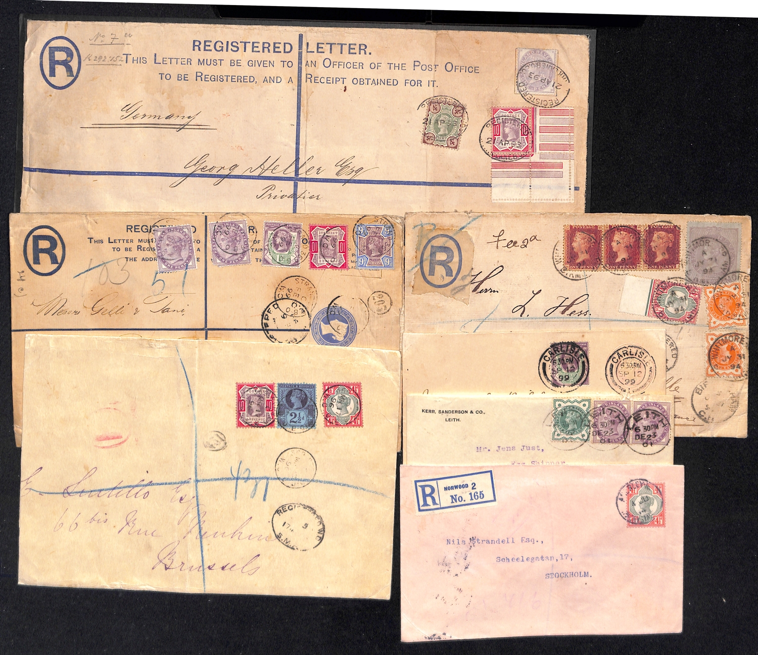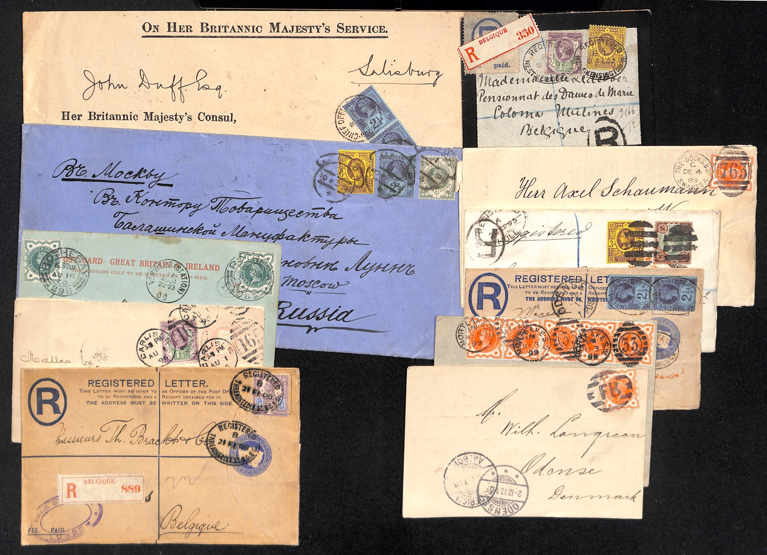 1887 Jubilee Issue. 1889-1914 Covers (16) and postcards (2) bearing QV Jubilee issue stamps, all to Europe including Denmark (4), Sweden (3), Finland (2), Russia, etc., one Foreign Office cover signed by Lord Salisbury, various rates and frankings, two bearing postal fiscals, some registered. (18).