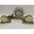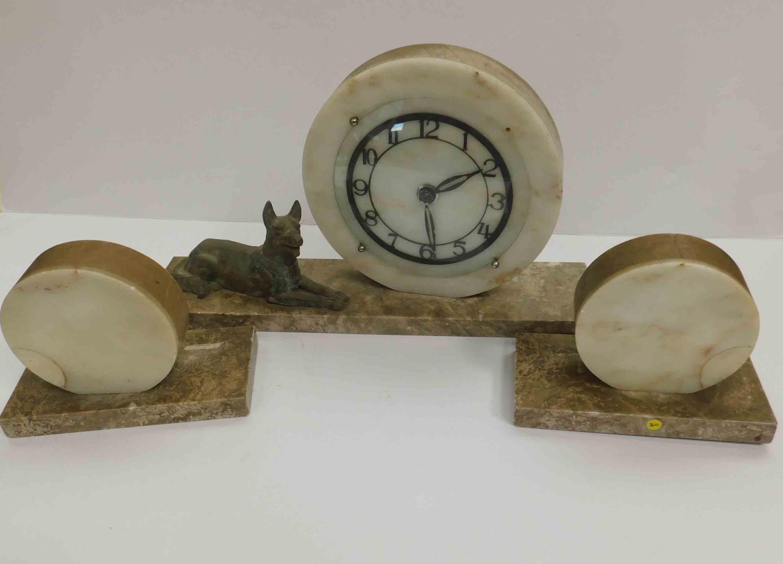 1930s Art deco - marble mantle clock with Alsatian dog & matching garnitures - requires some attention
