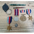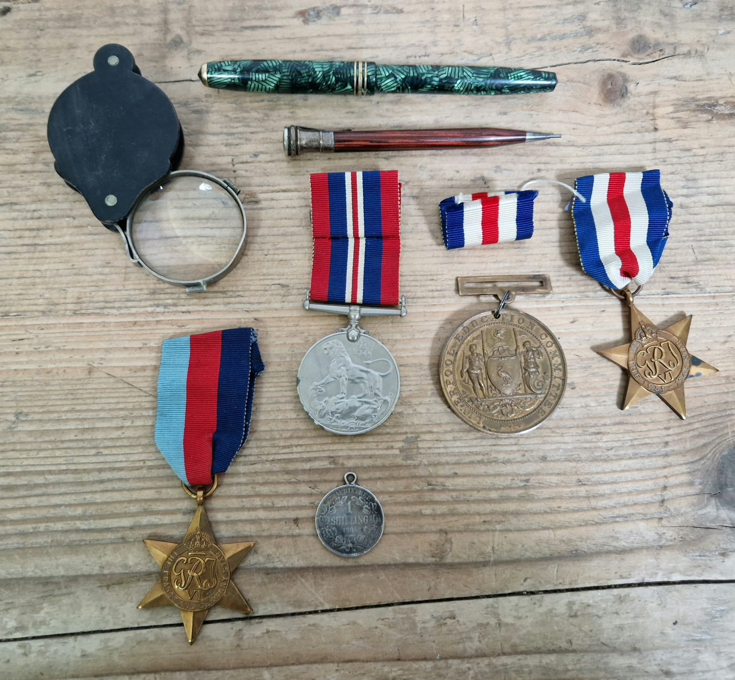 The France and Germany Star together with The 1939 - 1945 Star, a George VI medal, a 1907 Liverpool Education Committee medal awarded to John O'Connor, a vintage loupe, a Conway Stewart pen with 14ct gold nib, a Whal-Eversharp USA propelling pencil and a 1894 South African 1 shilling depicting President Kruger.