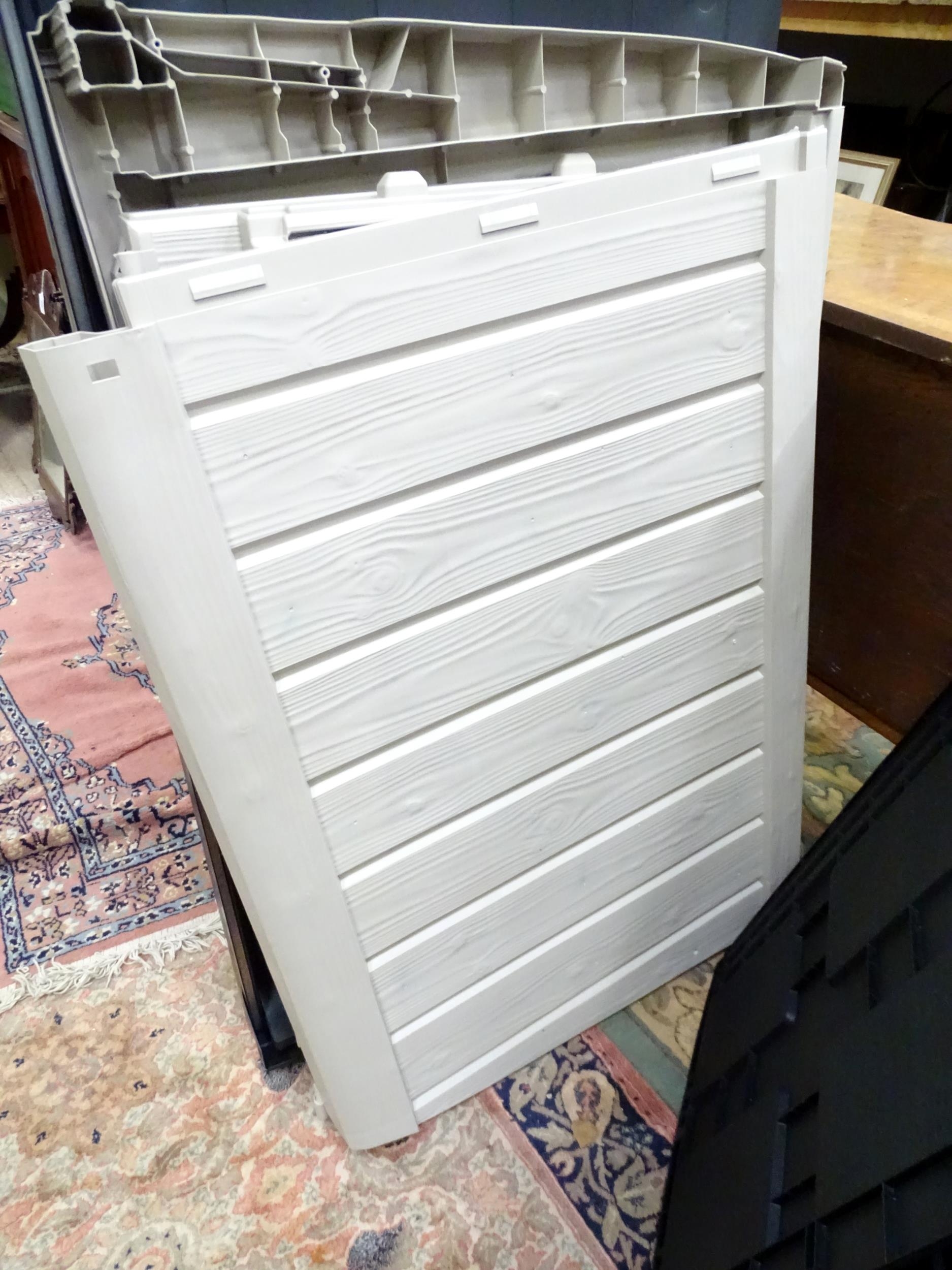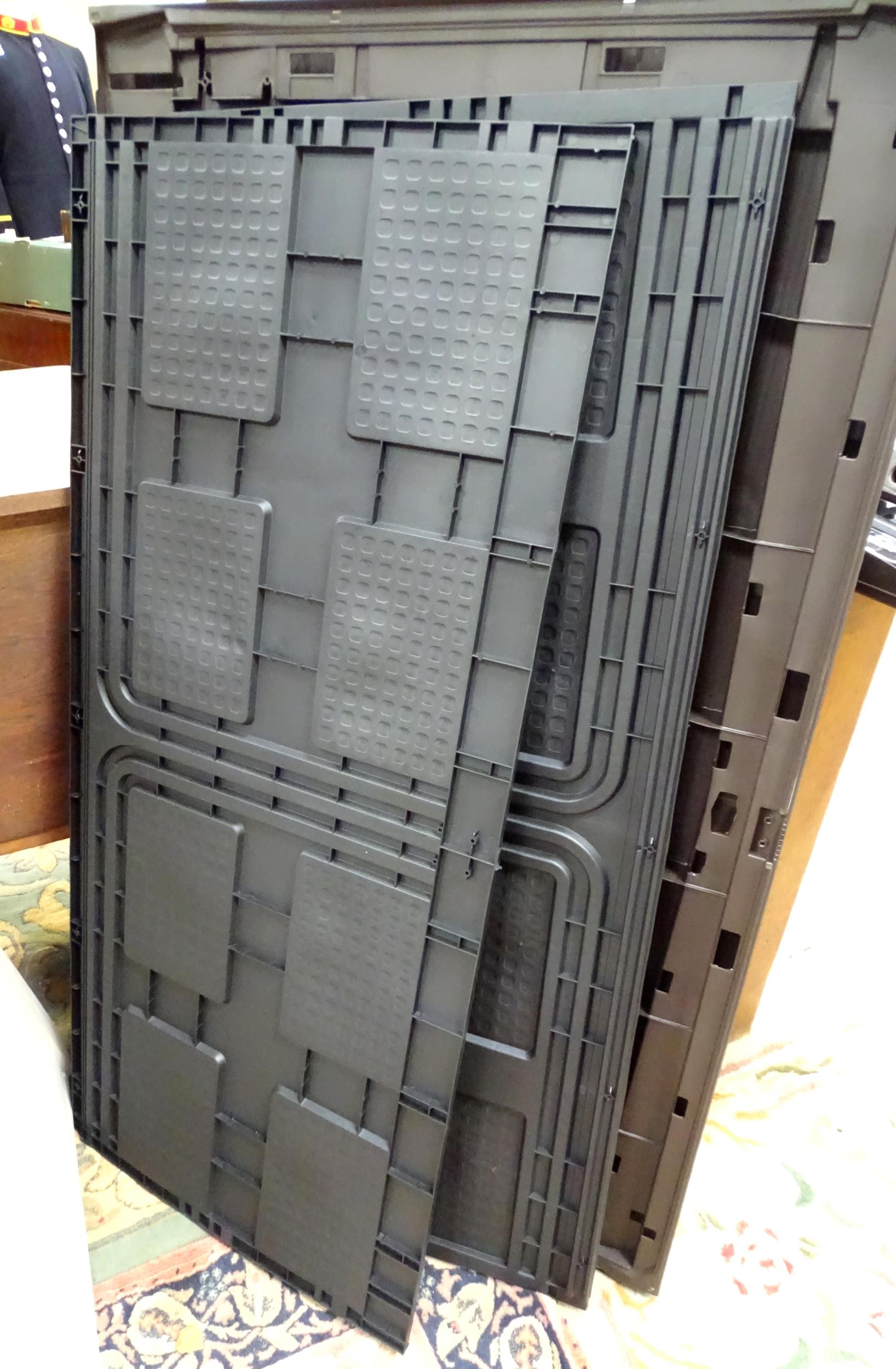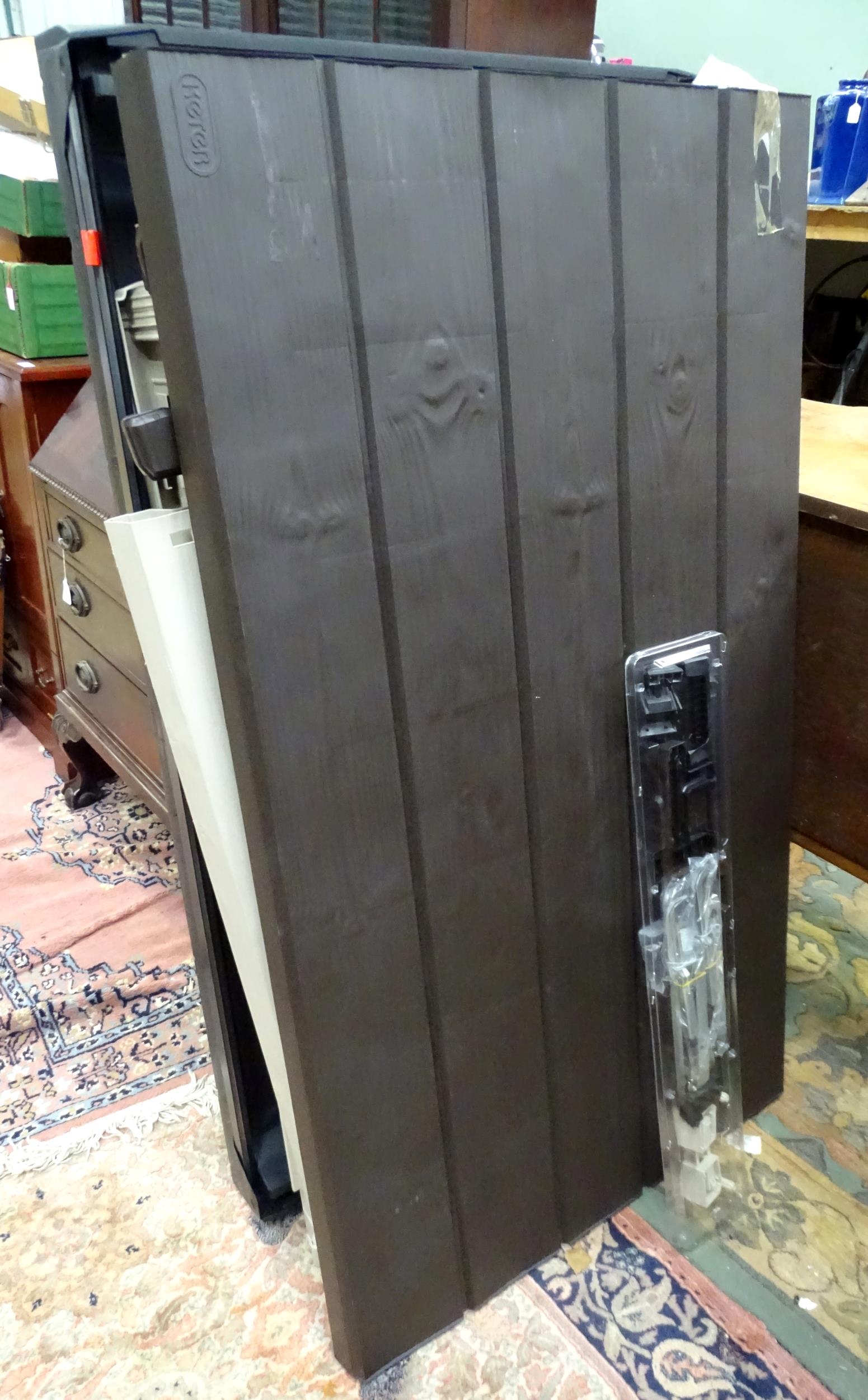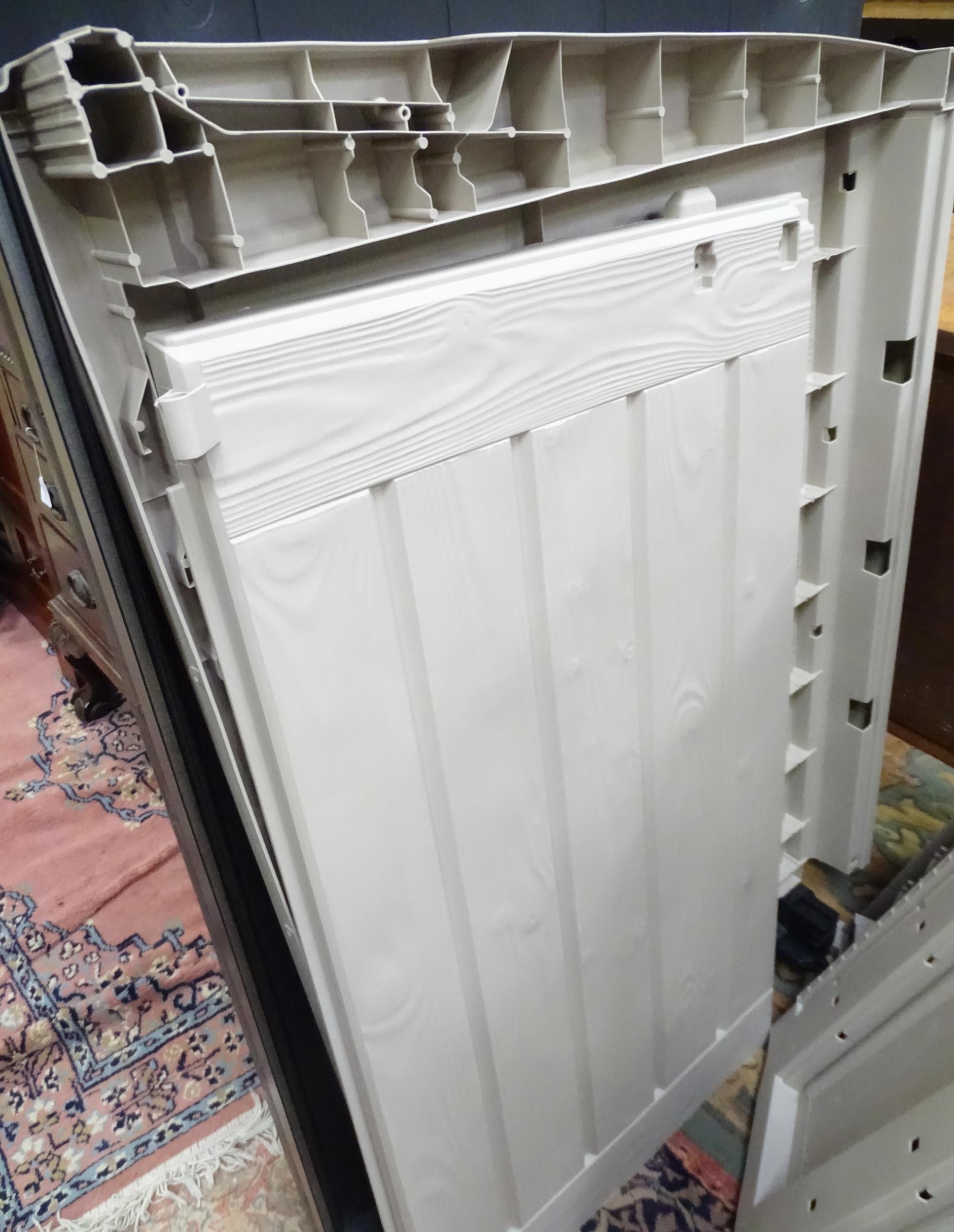 A Keter outdoor storage box, disassembled, the largest section approx 57" x 32 1/2"