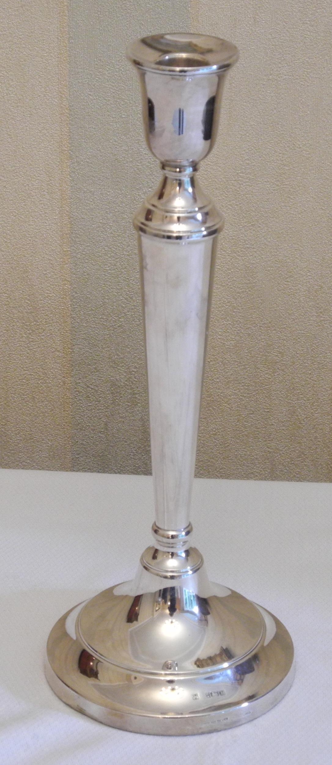 A silver table candlestick, bell shaped sconce, tapering cylindrical column, 30cm high, David Shaw Silverware Ltd, Birmingham 1986