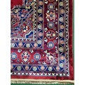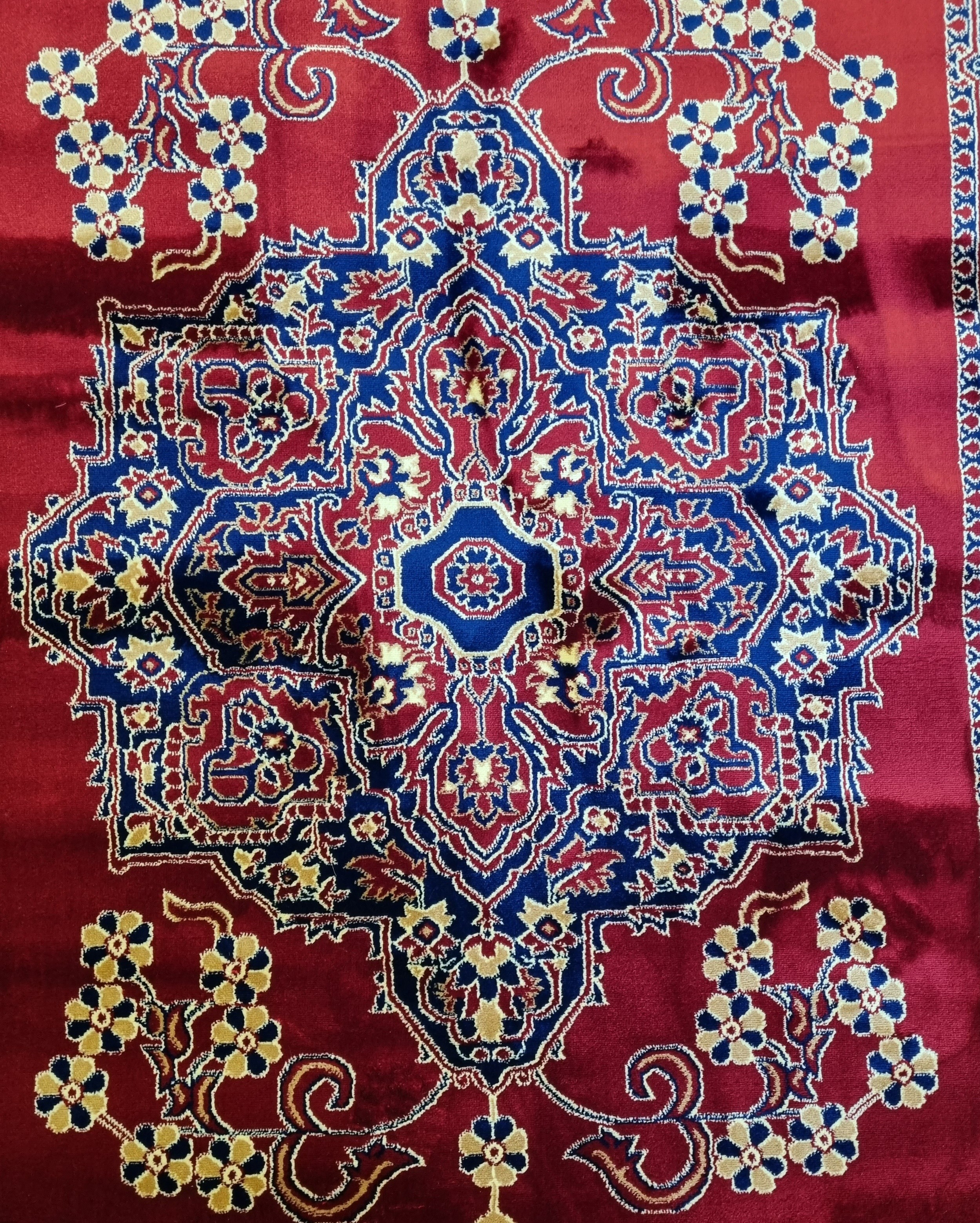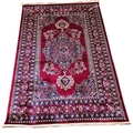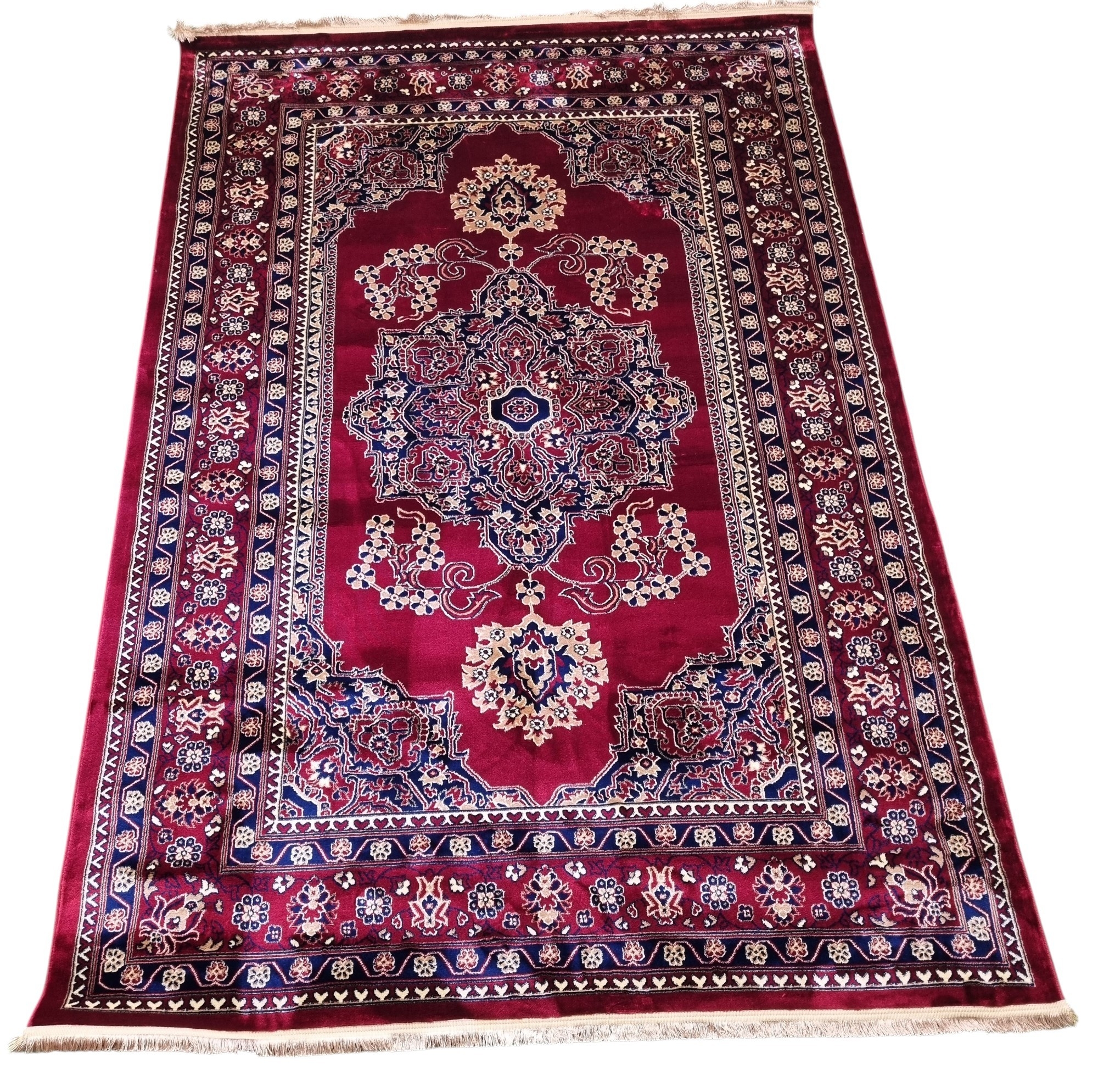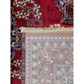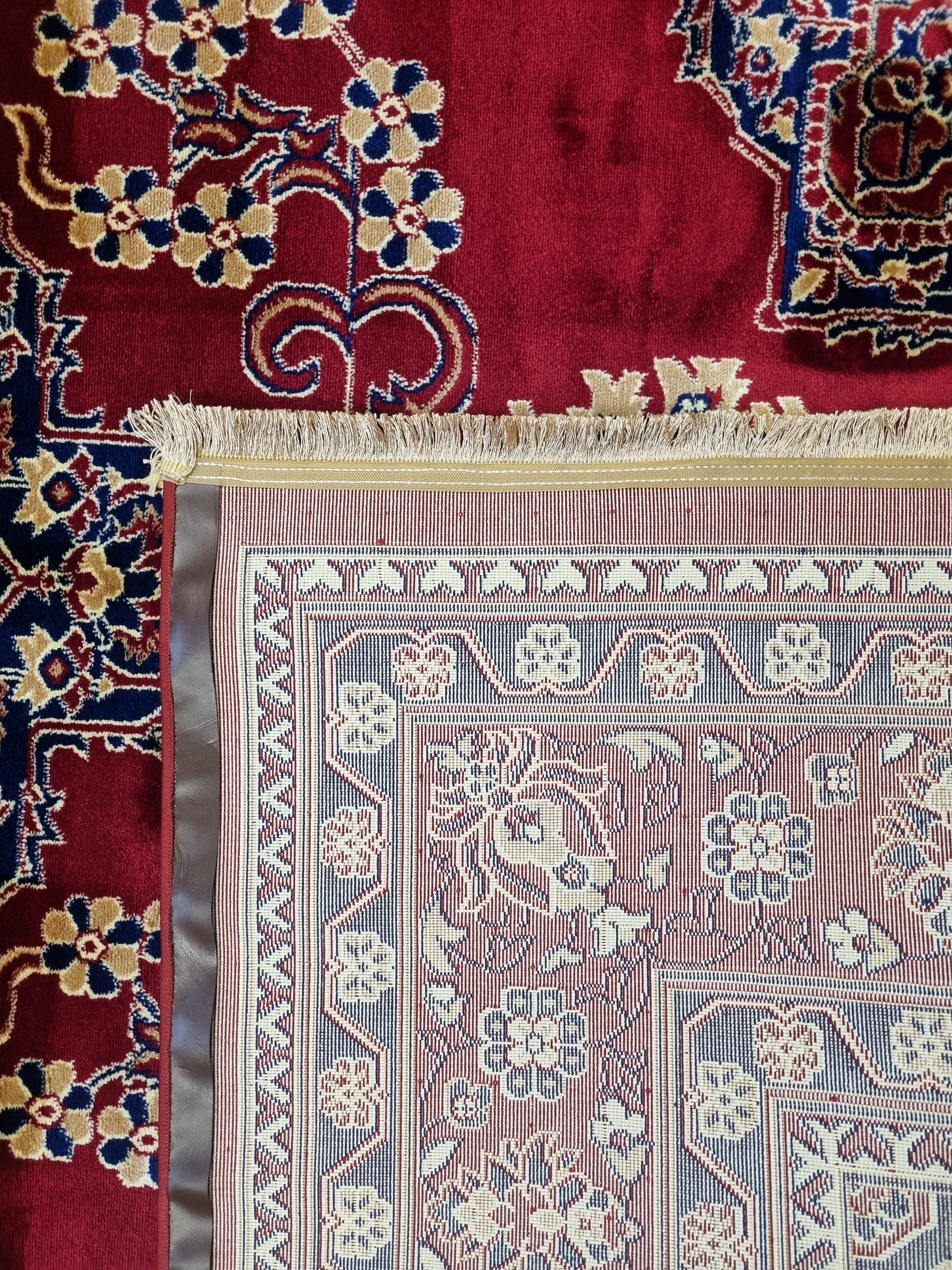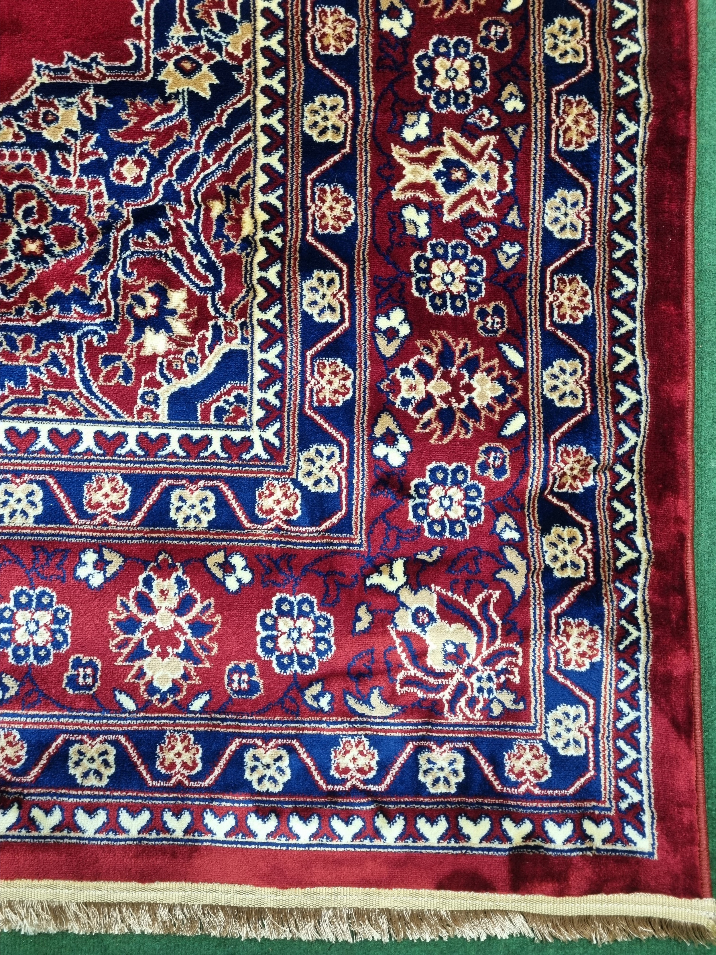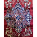 A red ground Turkish Soft Full Pile Carpet with central medallion design surrounded by borders and back leather trim. As New. L 305 x W 195 cm approx.