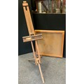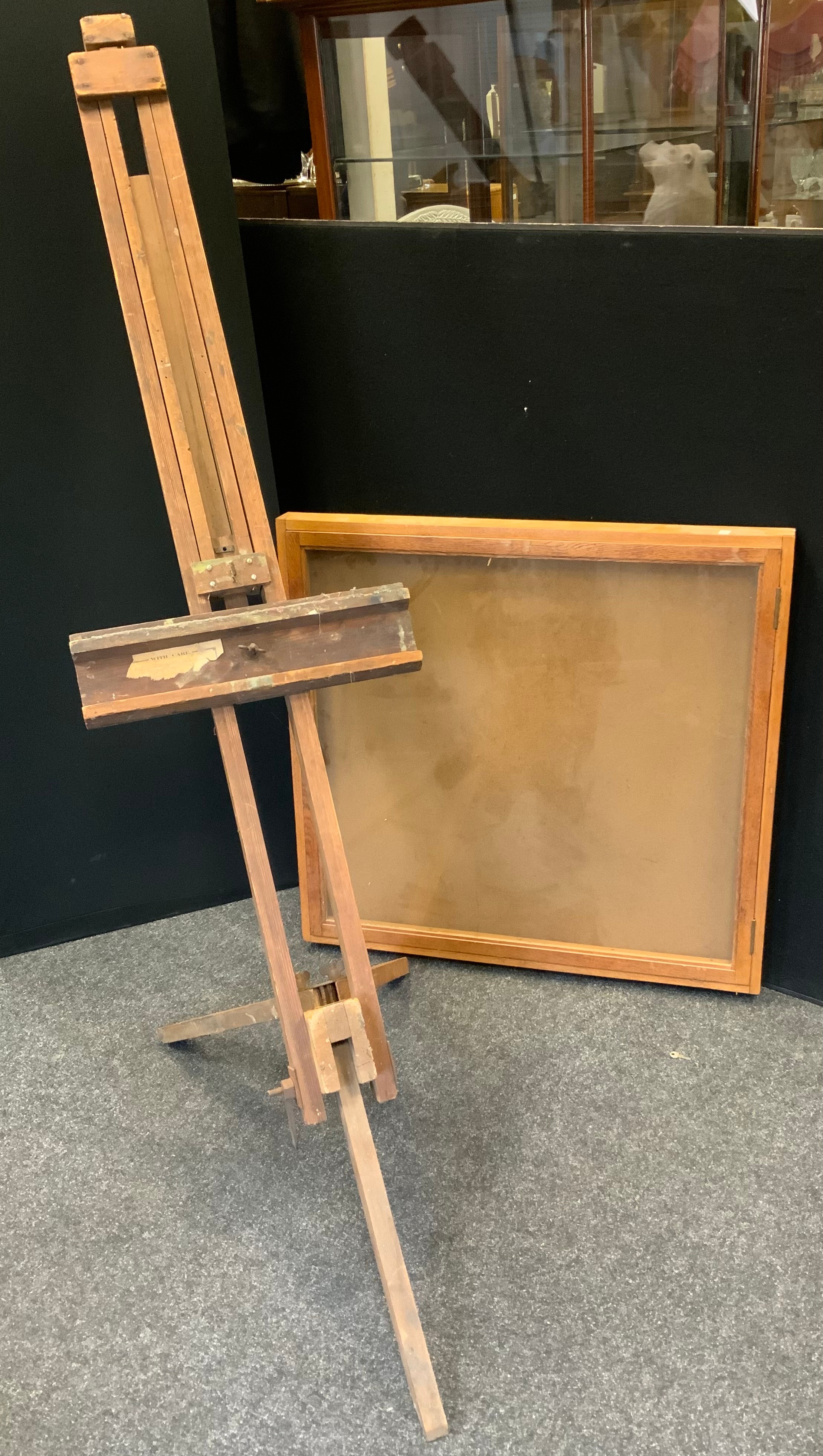 A wall mounted glazed display case, 84cm x 82cm; a large floor standing easel (2)