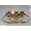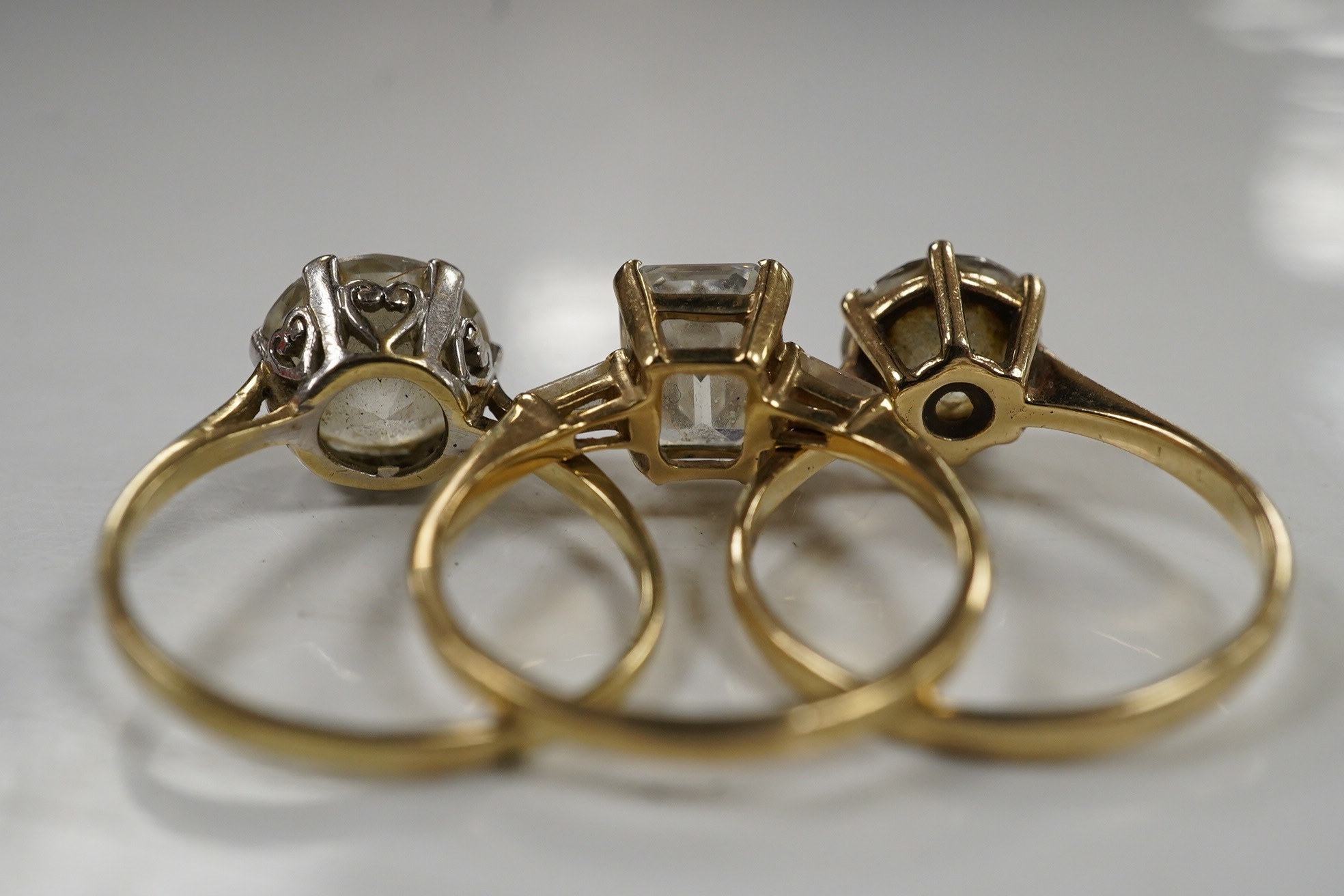 Three simulant diamond rings, comprising: a ring set with a step-cut simulant diamond with baguette simulant diamond shoulders; and two solitaire rings set with brilliant-cut simulant diamonds, all mounted in 9ct gold, sizes P1/2-Q, each with British hallmarks, combined gross weight approximately 9 grams