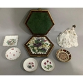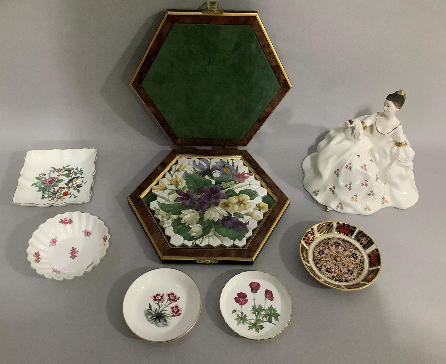 A Royal Crown Derby pin dish pattern 1128, four various pin and trinket dishes by Minton Royal Worcester, Aynsley and Shelley; a hexagonal tiled floral ceramic jigsaw in case and a Royal Doulton china figure 'My Love' HN2339