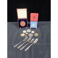 A SCIENCE AND ART DEPARMENT READING INDUSTRIAL EXHIBITION COMMEMORATIVE MEDAL (cased) with a King George and Queen Mary 1935 coin and others including silver plated cake forks