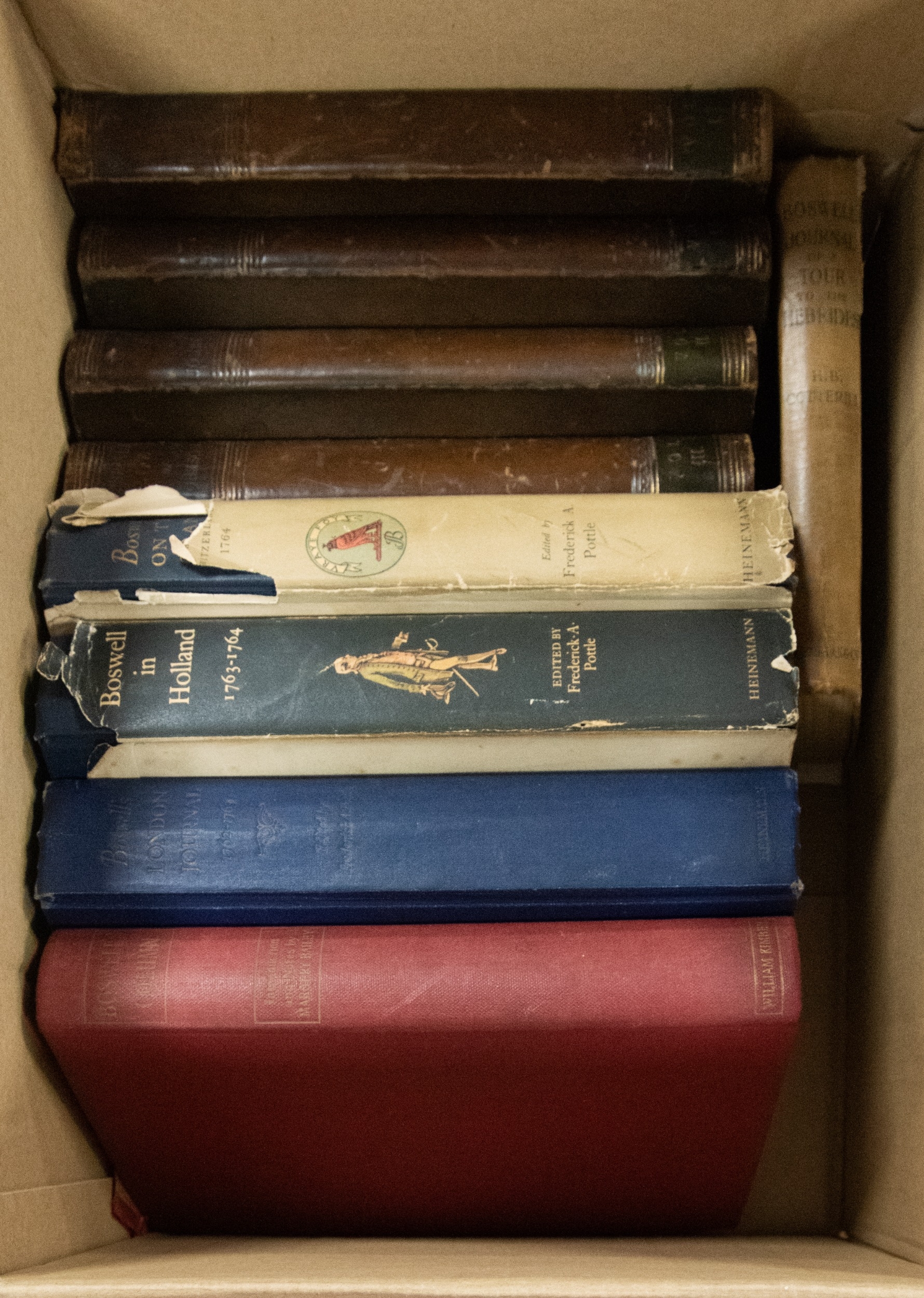 James Boswell - The Life of Samuel Johnson, printed J Richardson & Co 1823, 4 vol, bound in period half leather bindings. Together with a group of further books relating to JAMES BOSWELL. Contents of one box