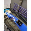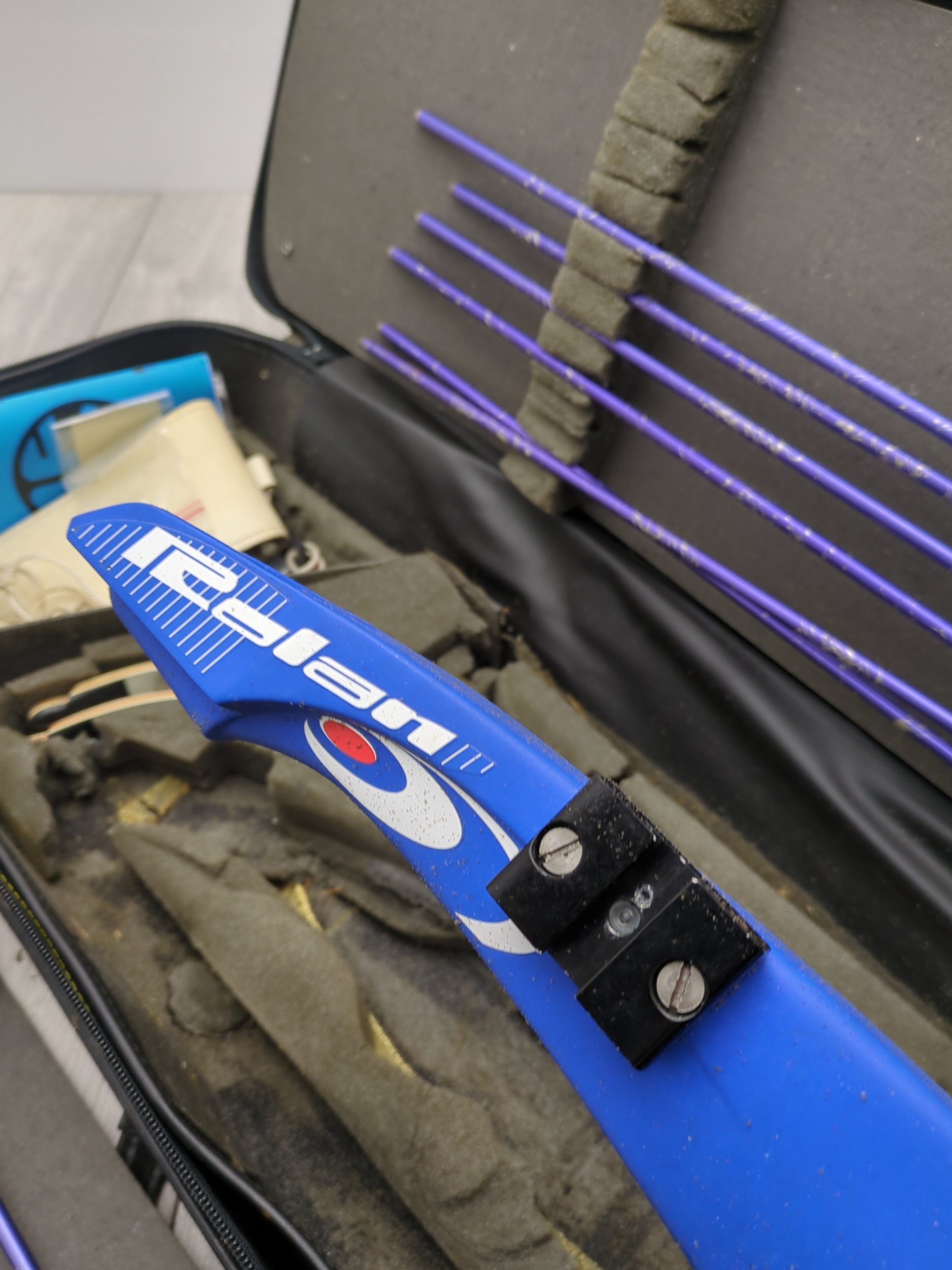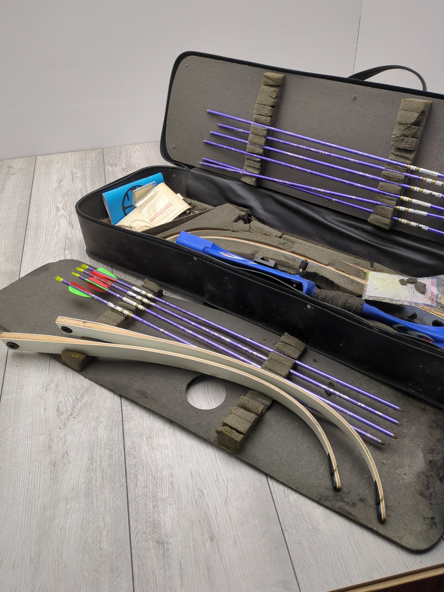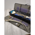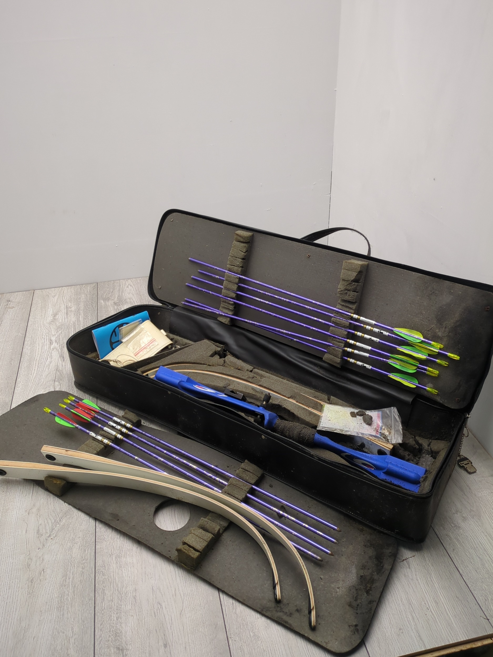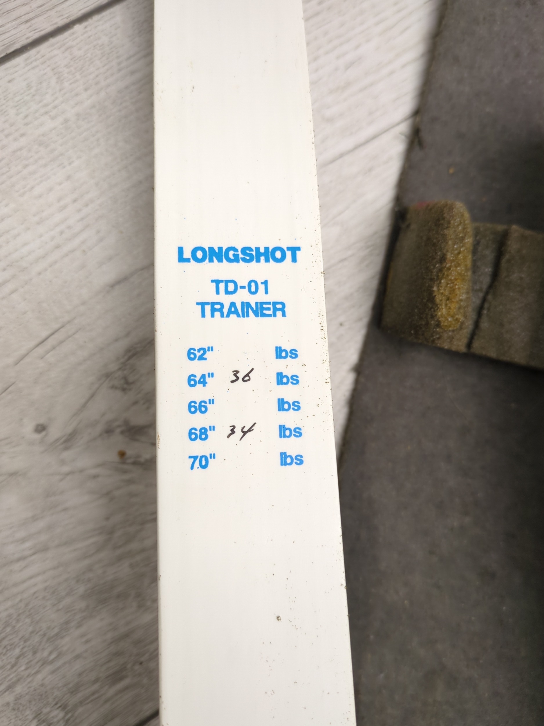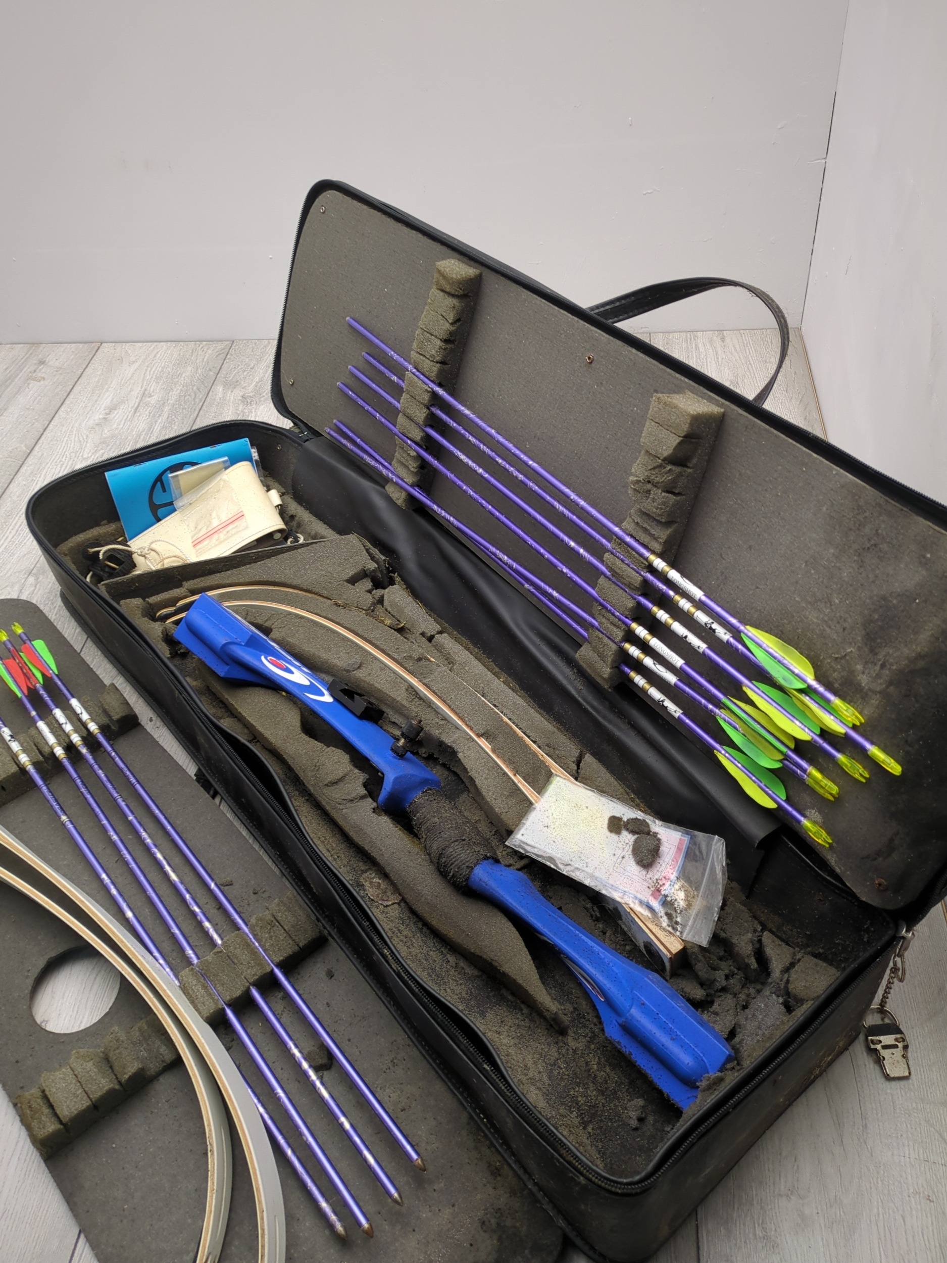 This Longshot TD-01 Trainer archery set includes a disassembled bow and multiple arrows housed in a protective case. The bow components are blue and white, marked with specifications on the limbs. The arrows feature vibrant fletching and metallic tips, suggesting a comprehensive practice set ideal for beginners or enthusiasts.