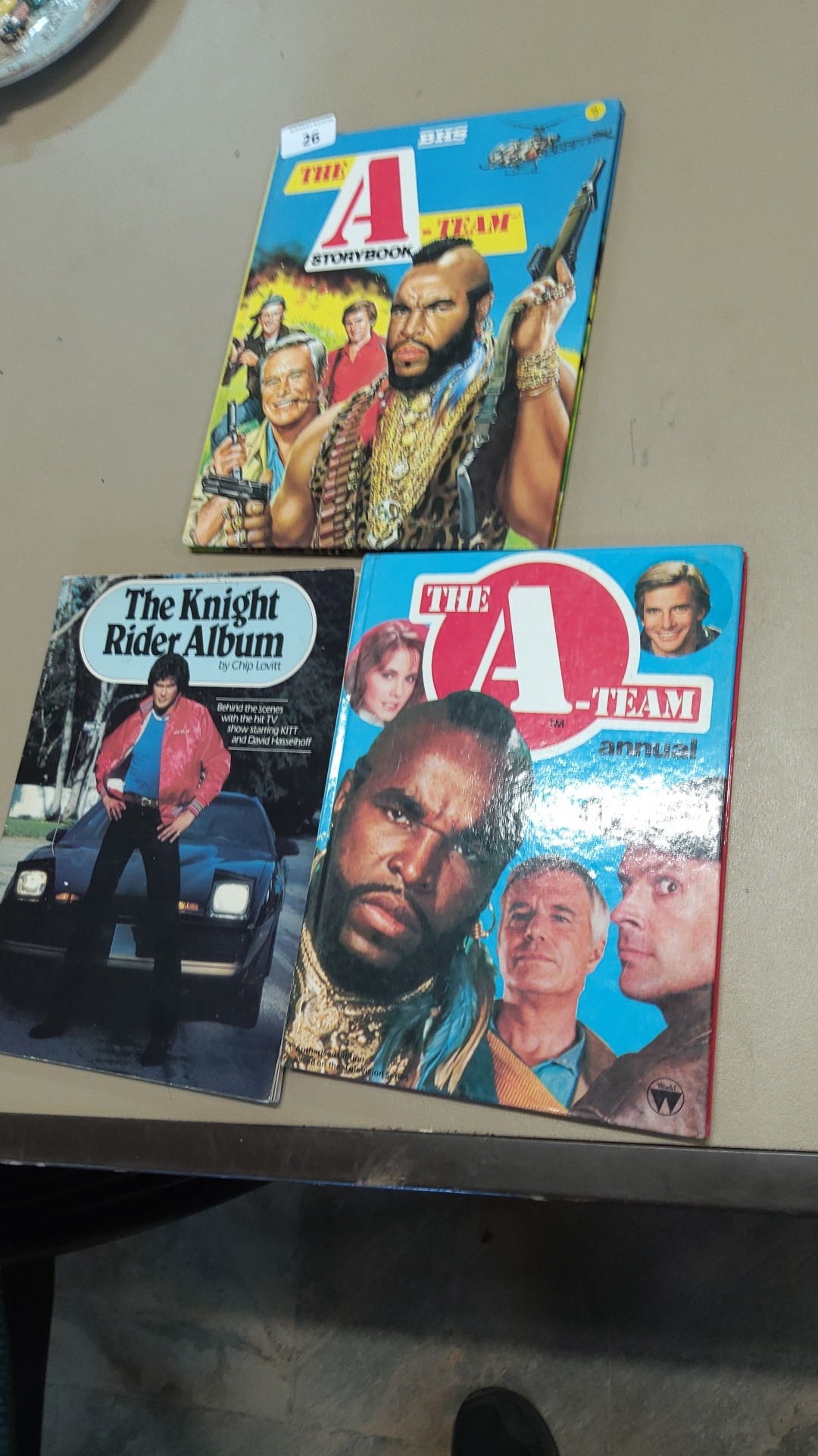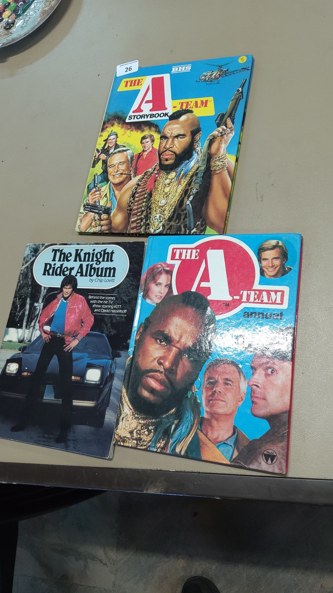 Set of 3 television tie-in paperback/annual publications comprising BHS "The A-Team Storybook", "The A-Team" annual (World International Publishing), and "The Knight Rider Album" by Chip Lovitt.