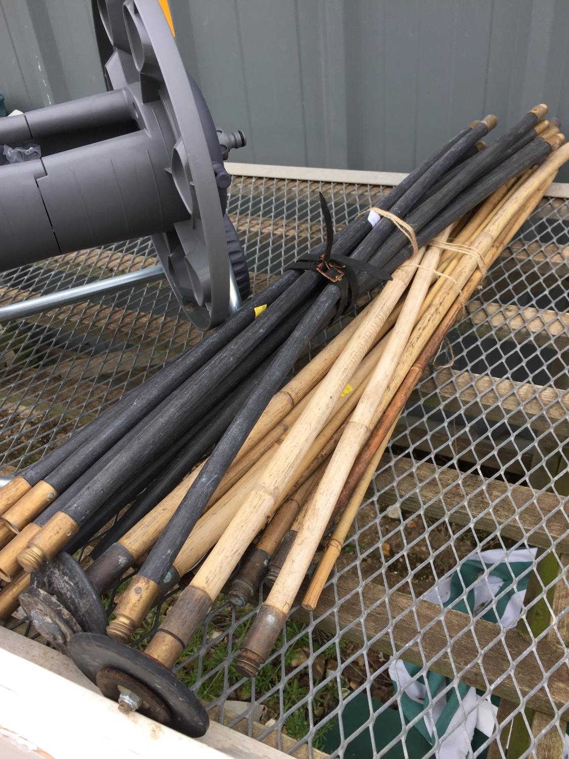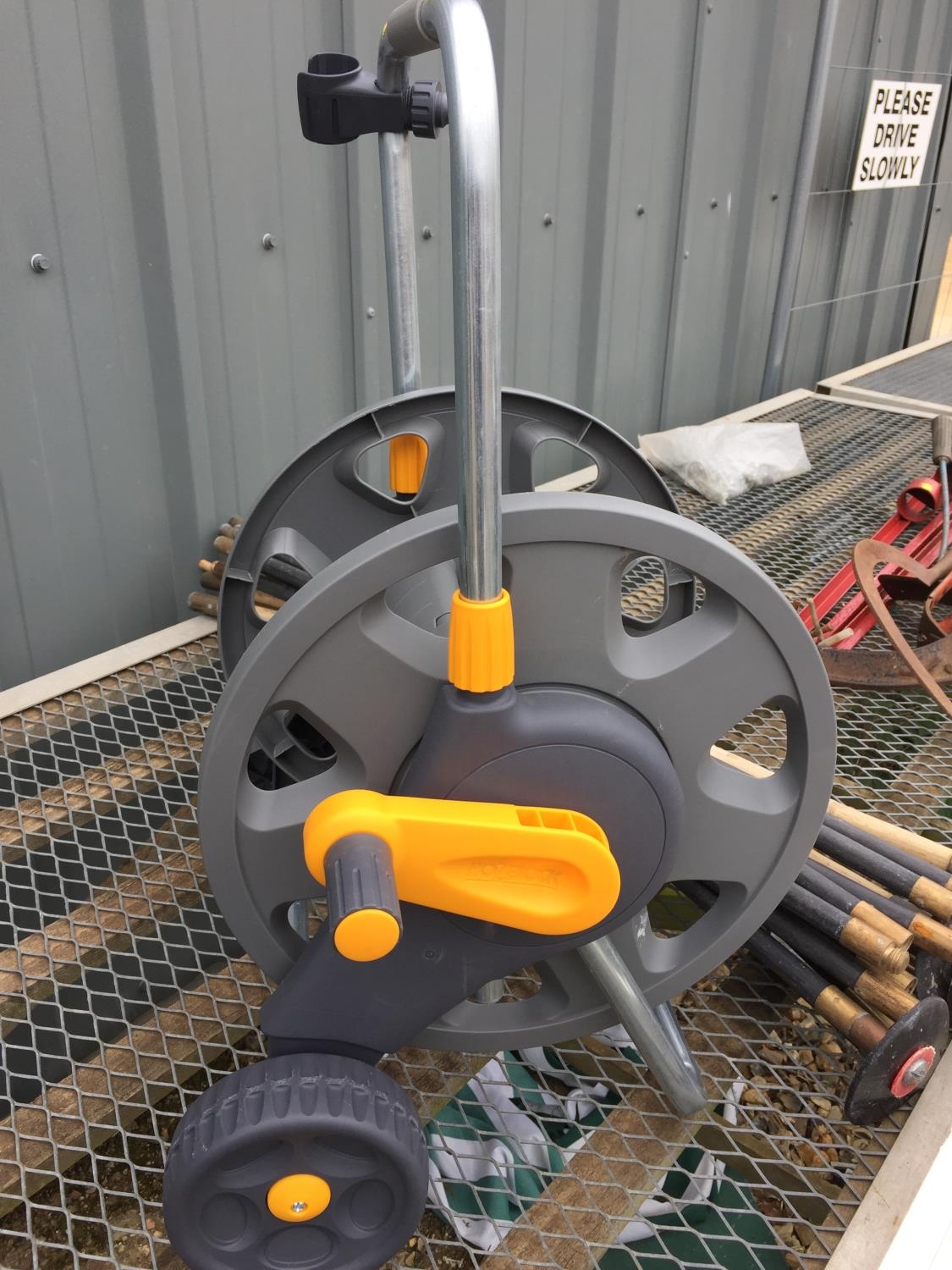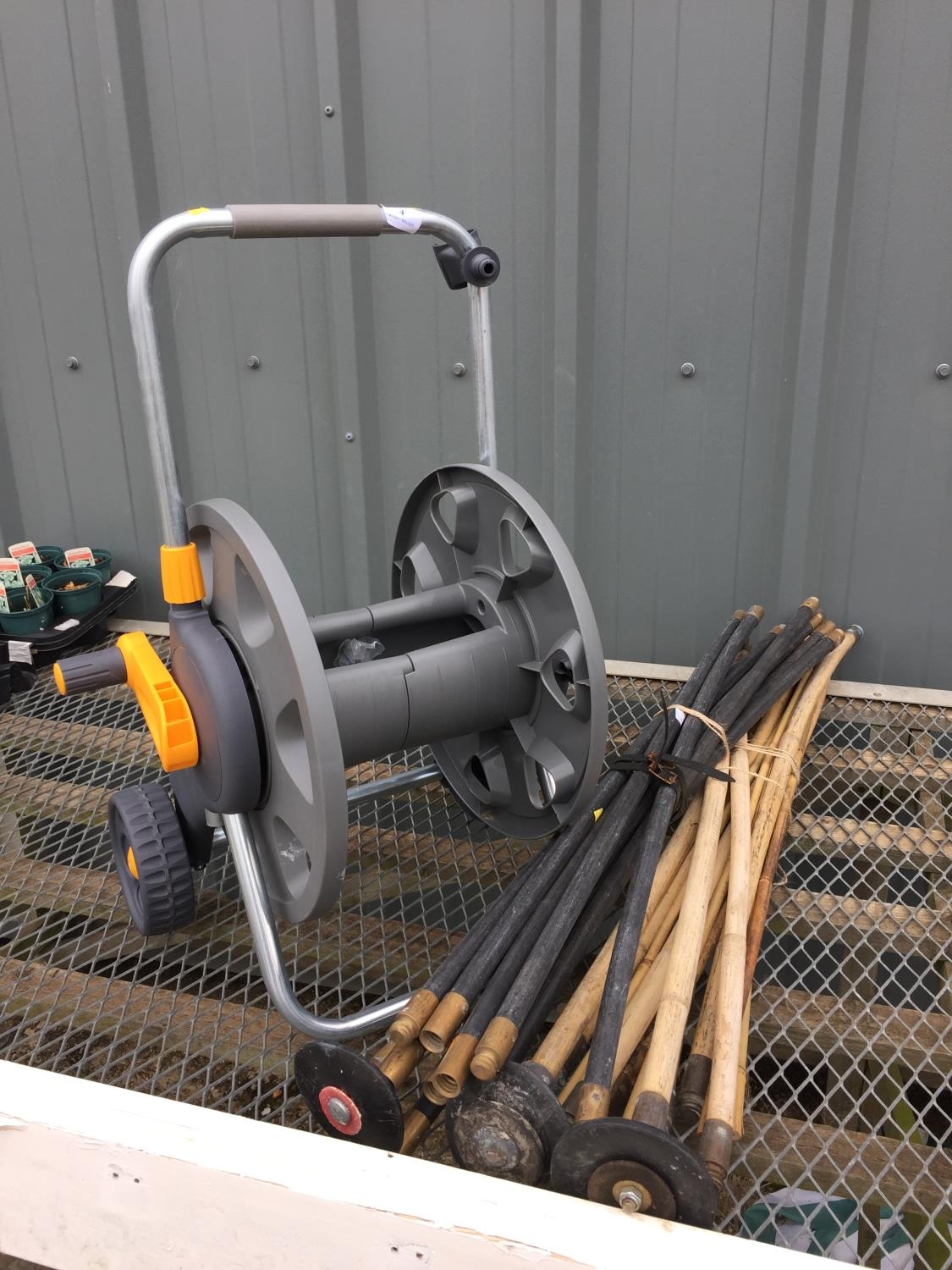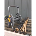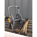 HOZELOCK HOSE REEL ON WHEELS & DRAIN RODS ETC.