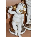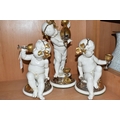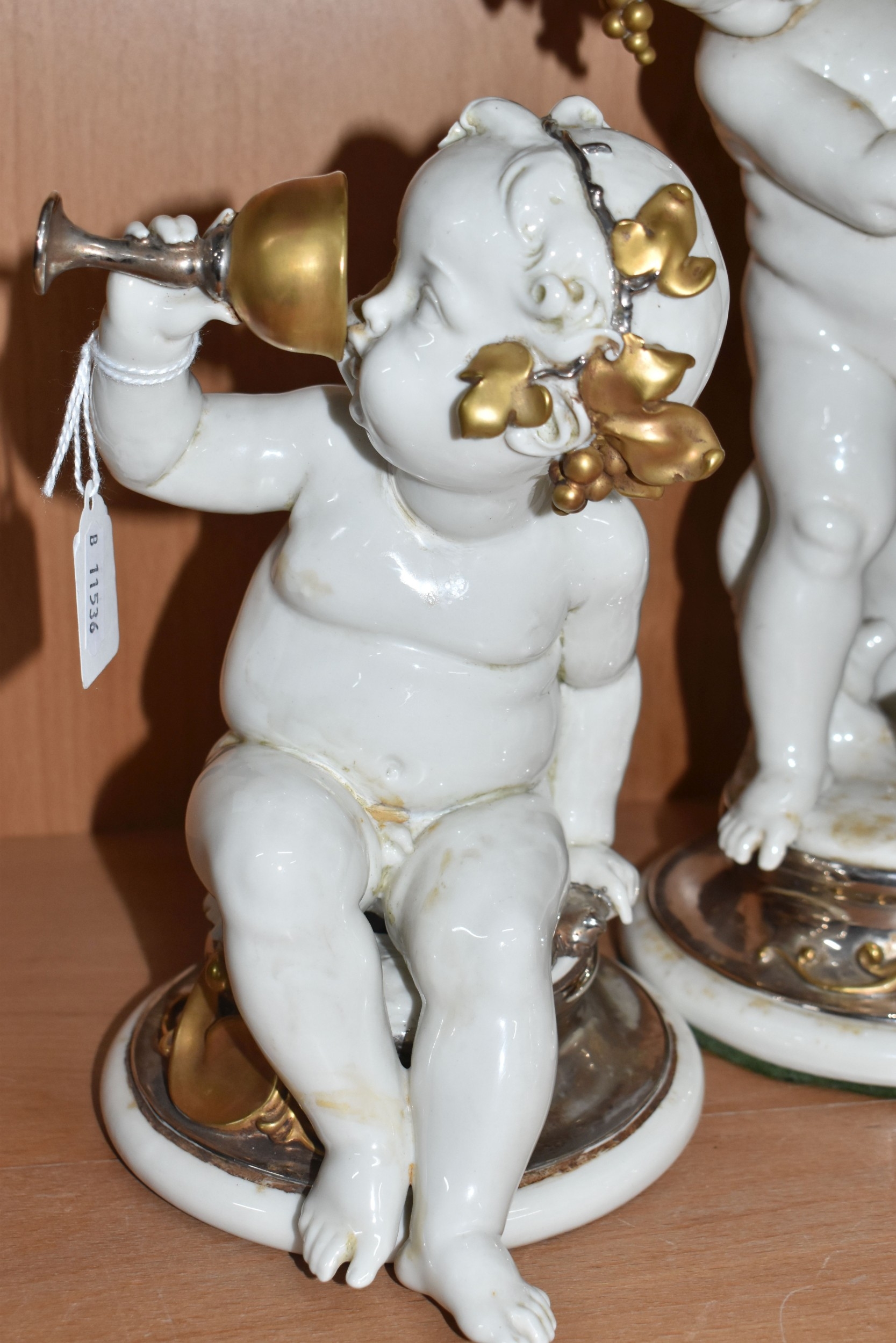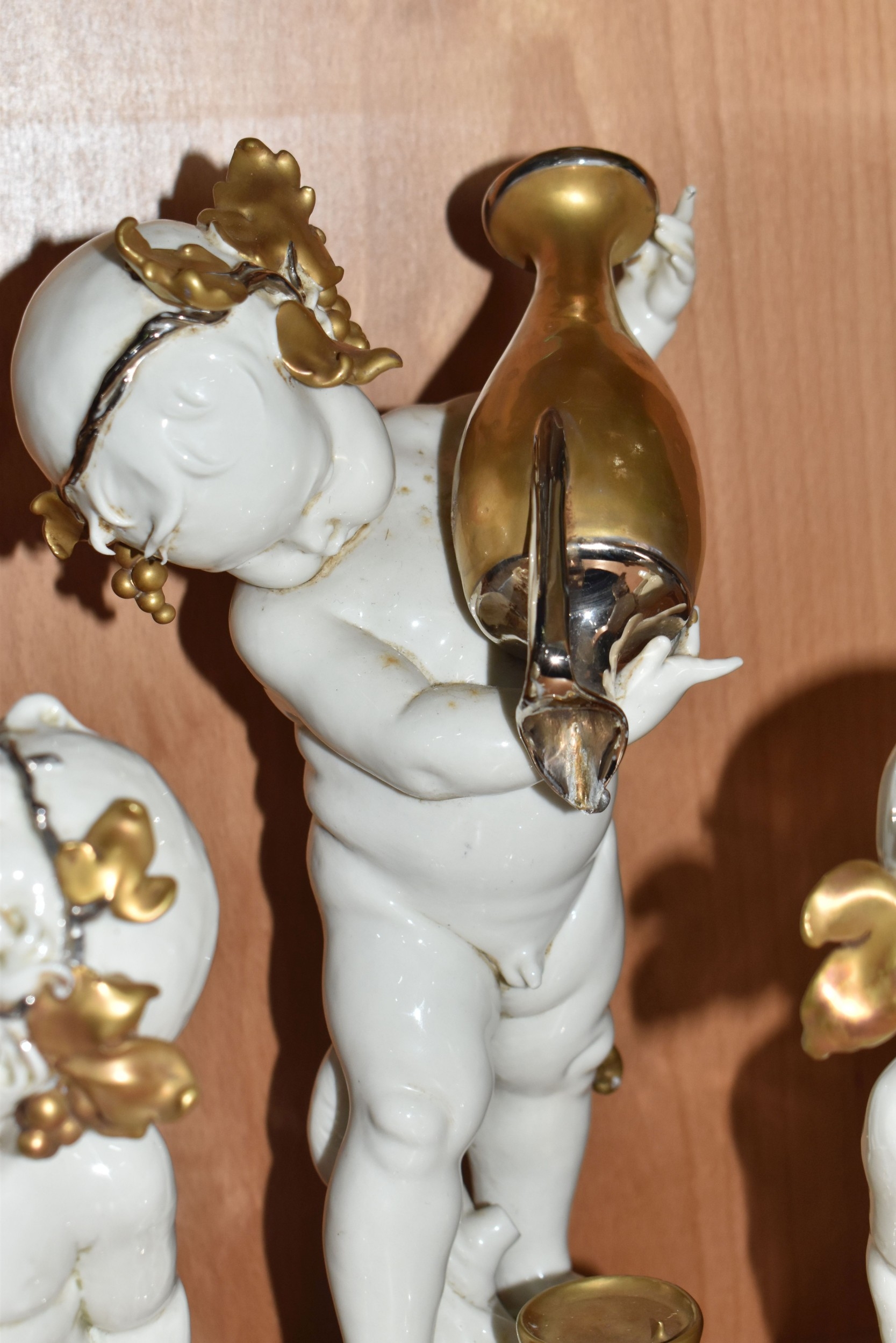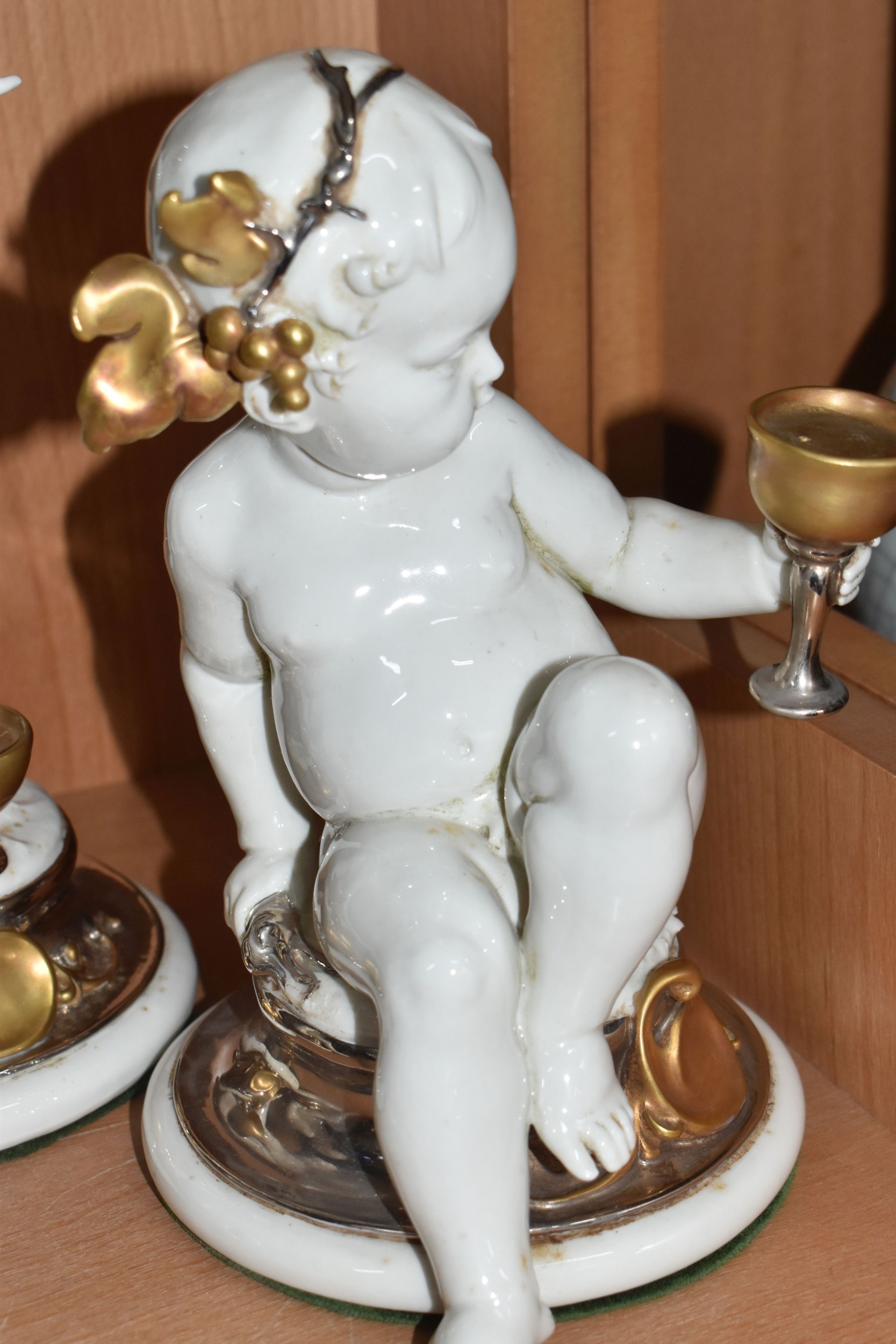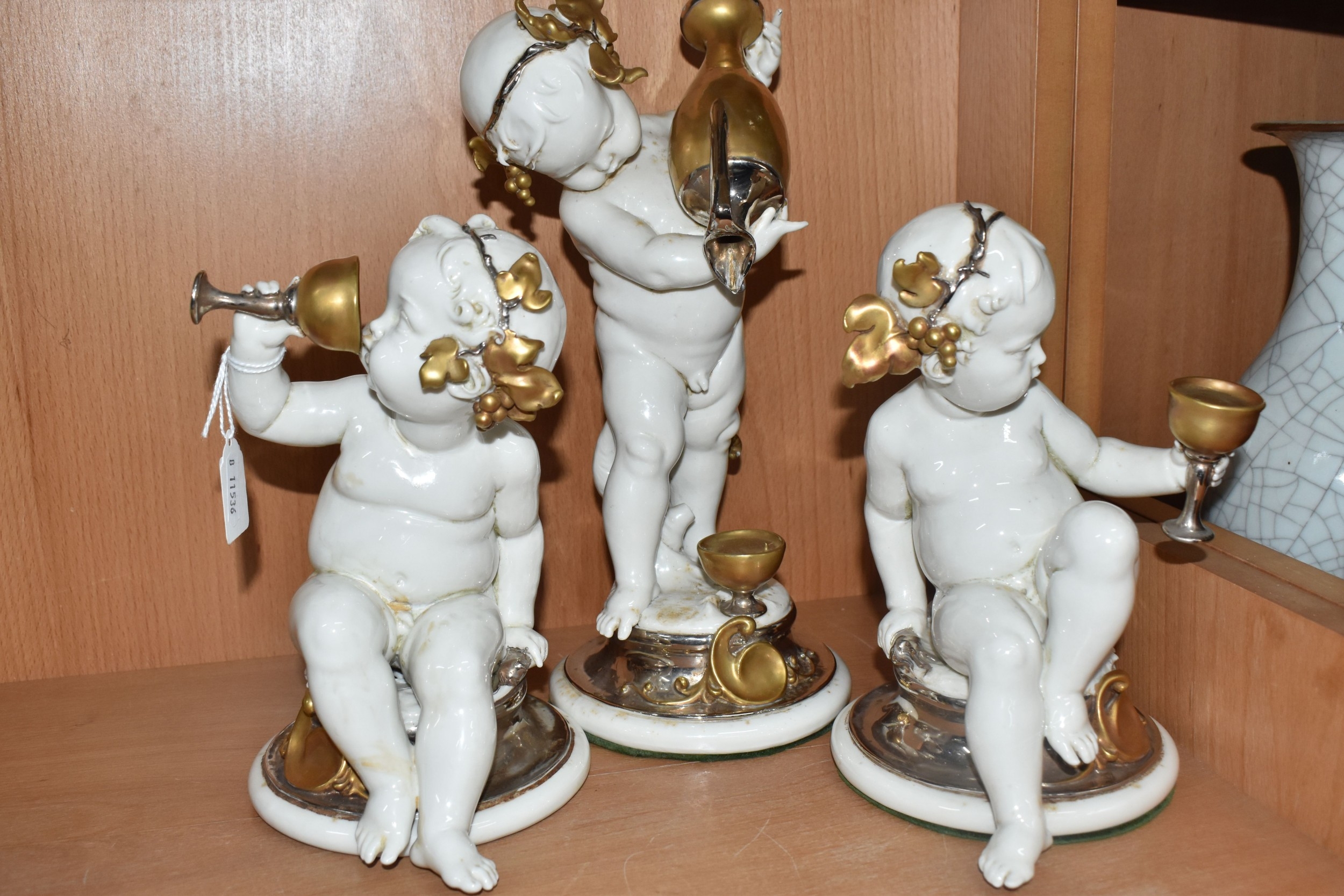 THREE GIUSEPPE CALLÉ CAPODIMONTE FIGURES OF CHERUBS, the porcelain figures wearing gilt and silver lustre garlands of vine leaves and grapes, and holding goblets and a ewer of wine, each marked 'Callé', height of tallest approximately 30cm (3) (Condition Report: generally ok, largest figure missing a drip from spout of jug, with a tiny area of damage and signs of restoration to spout, some restoration? visible on another figure - at base of neck and top of thighs, and the third inside goblet, would benefit from a clean)