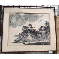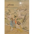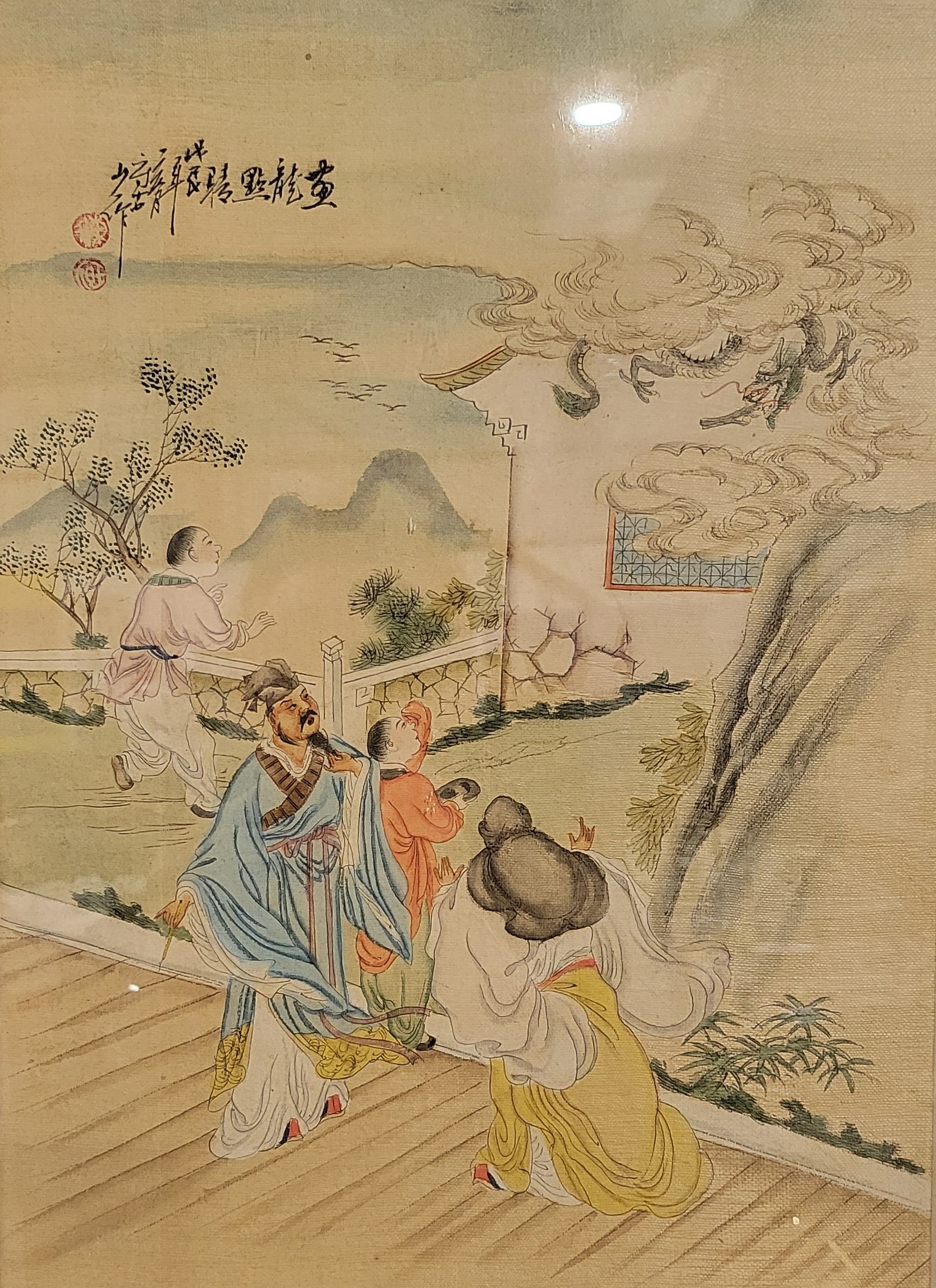 A Chinese watercolour on silk depicting a family looking up at a cloud dragon, 14.5"x10.25". No shipping. Arrange your own packer and shipper please.