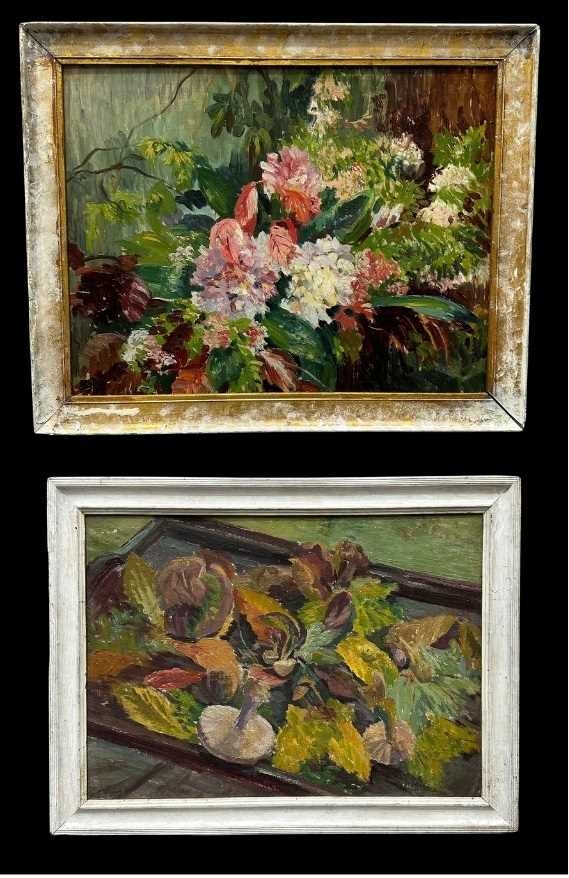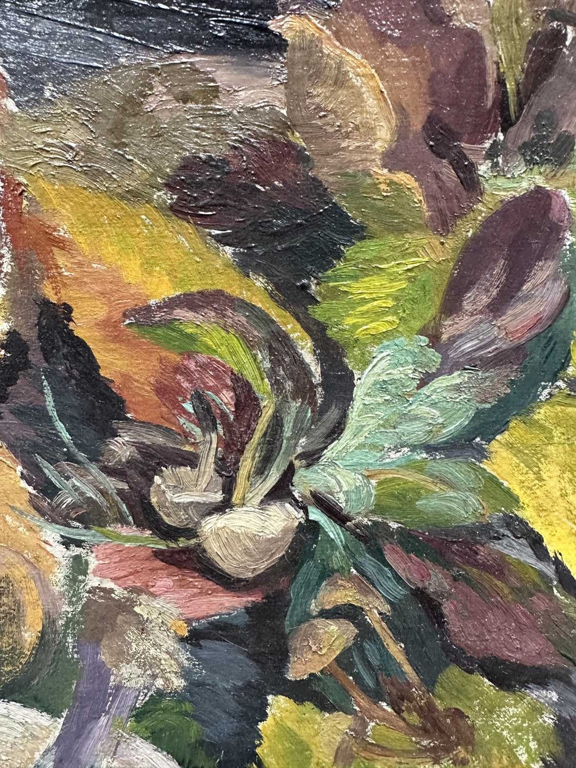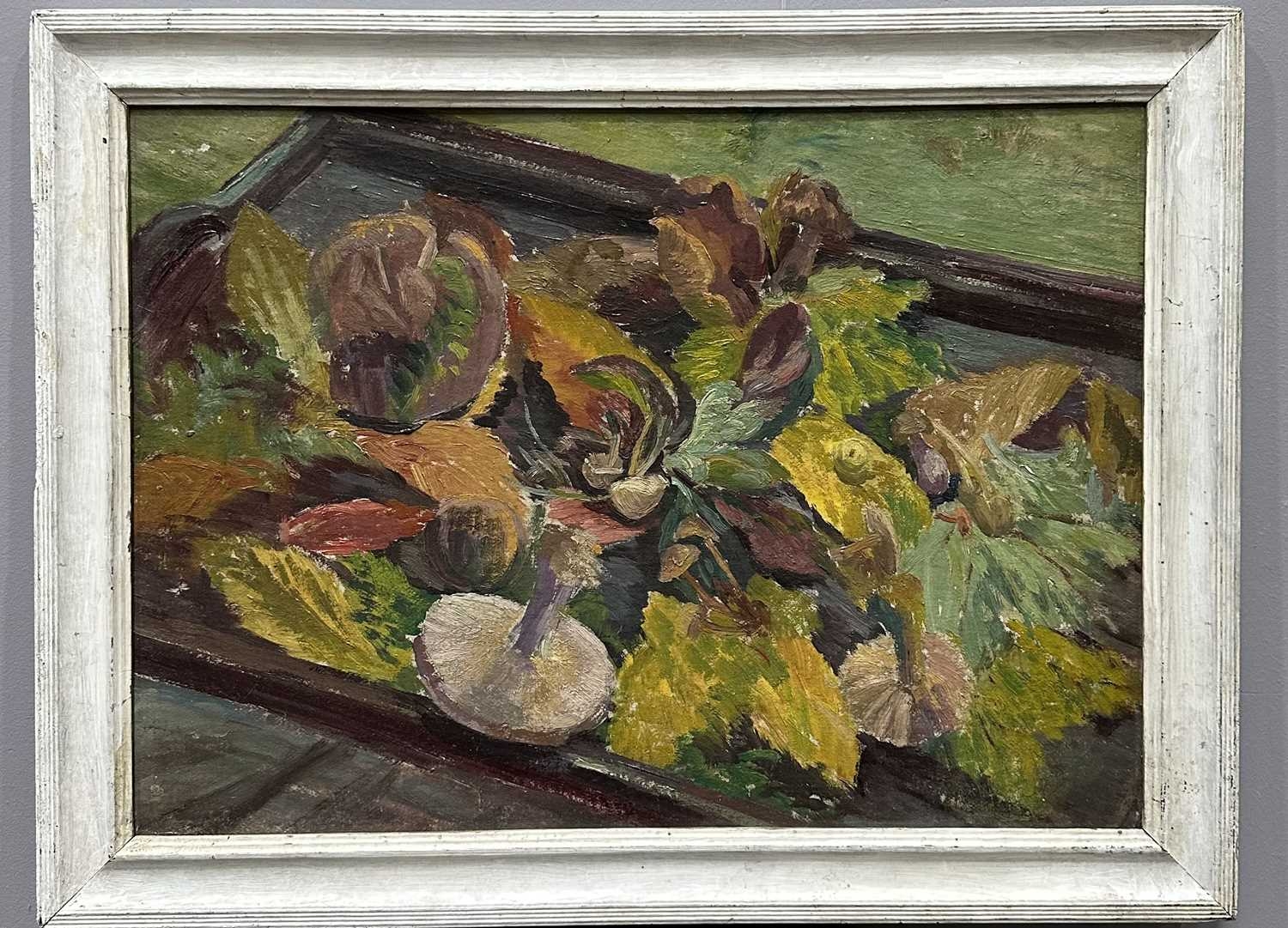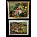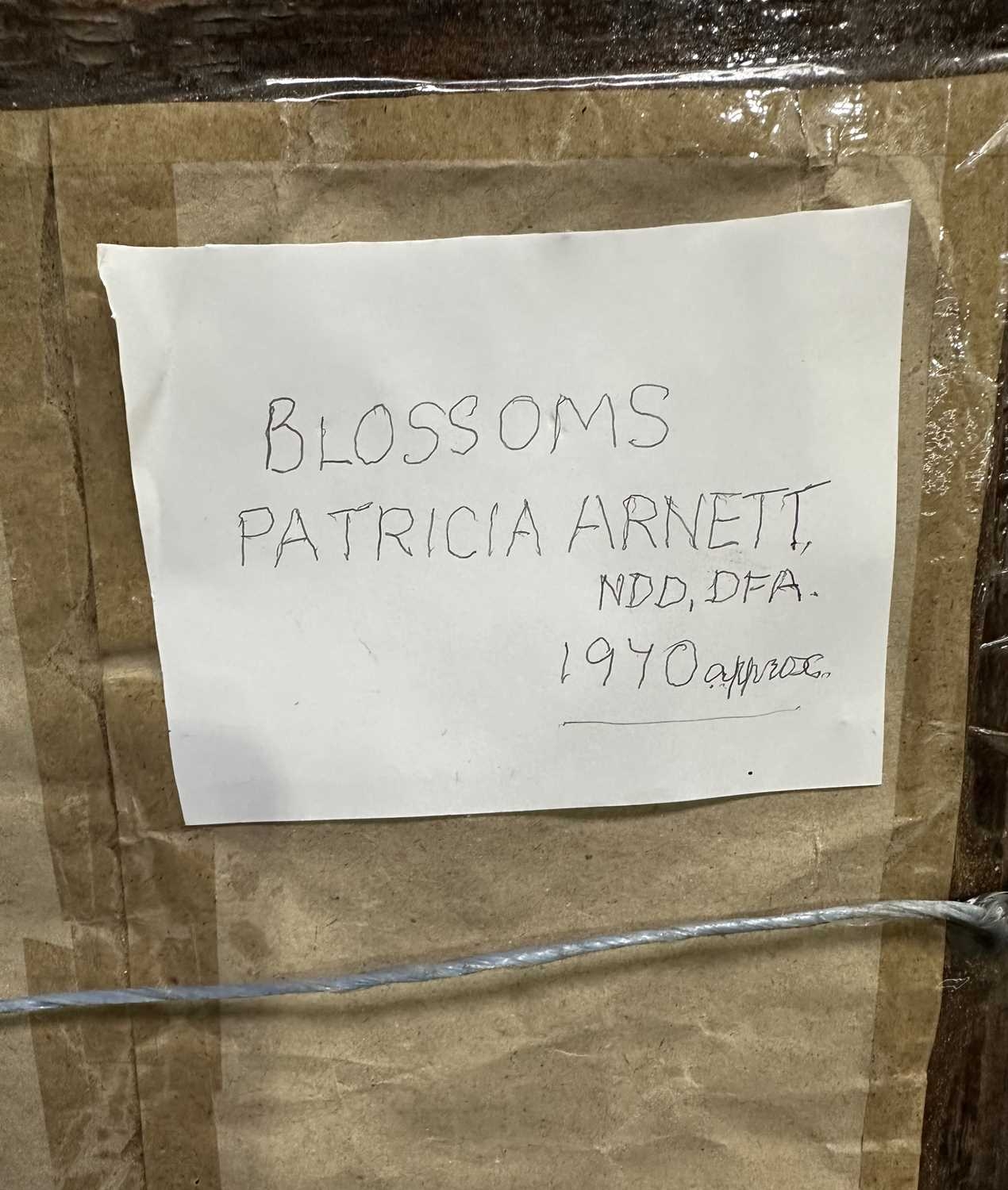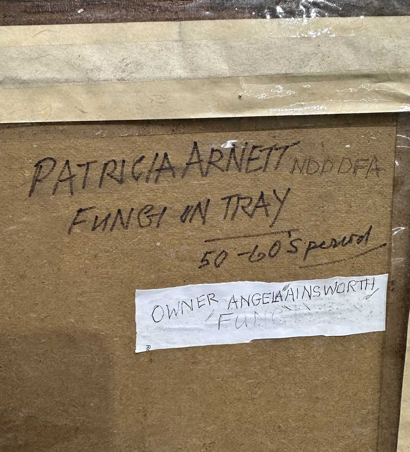 Patricia Arnett (British 1923), and oil on board of flowers, titled verso Blossoms, in gilt and paint frame, 44.5cm x 57.5cm, together with another similar oil by the same artist of mushrooms, titlted Fungi In Tray, in white frame, 39.5cm x 54.5cm (2)