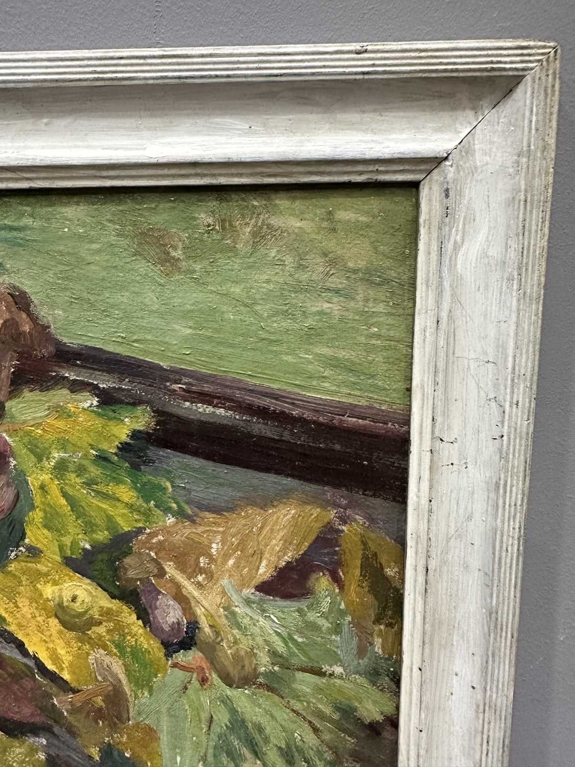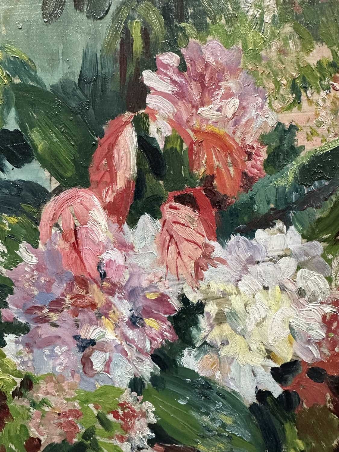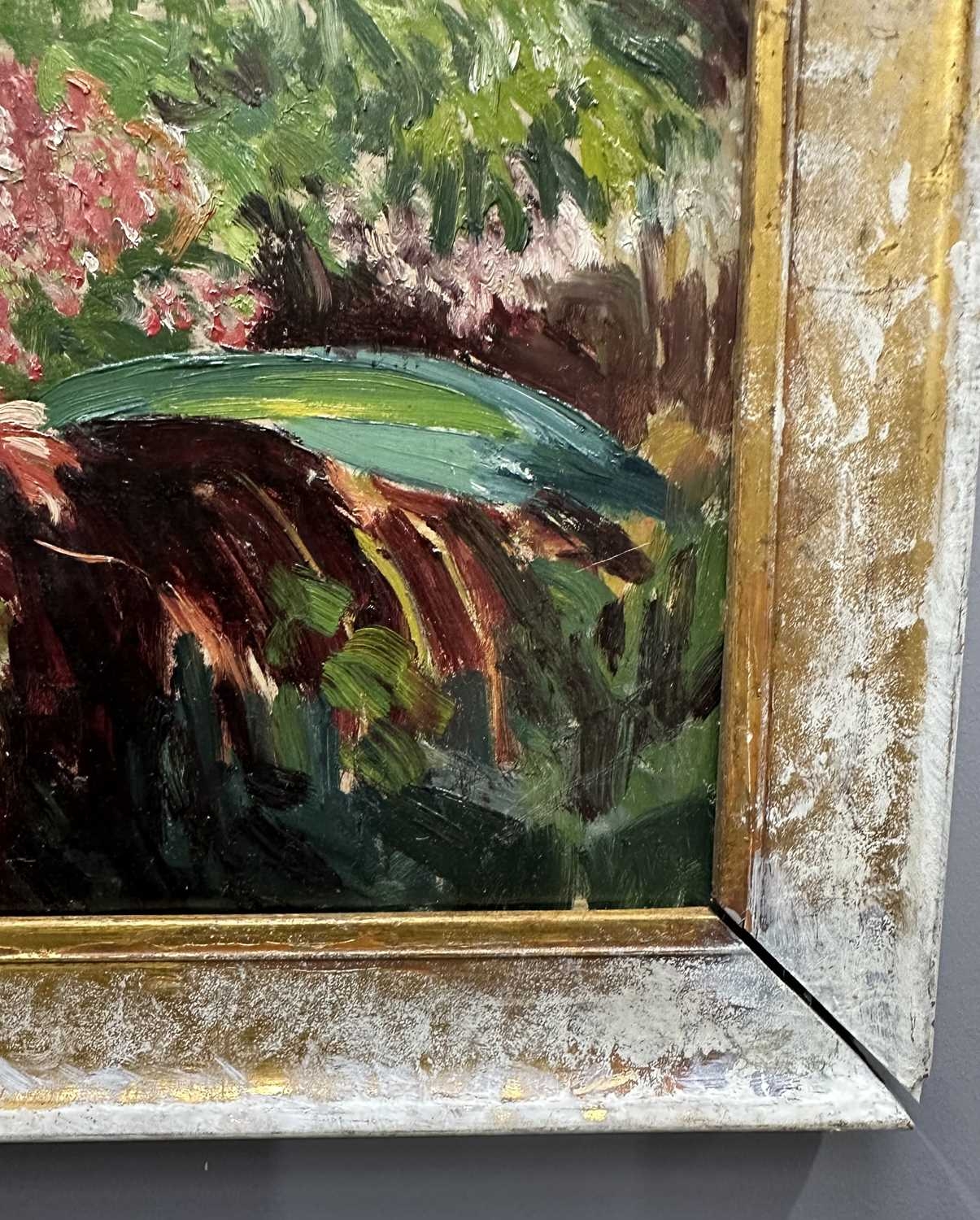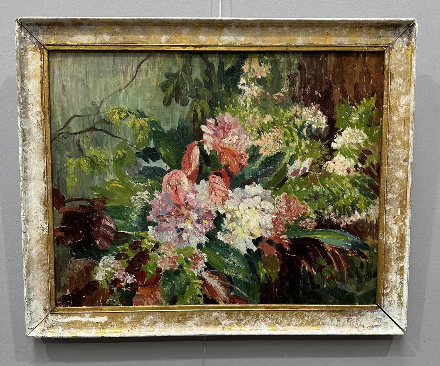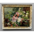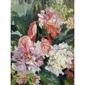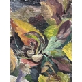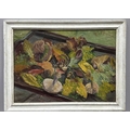 Patricia Arnett (British 1923), and oil on board of flowers, titled verso Blossoms, in gilt and paint frame, 44.5cm x 57.5cm, together with another similar oil by the same artist of mushrooms, titlted Fungi In Tray, in white frame, 39.5cm x 54.5cm (2)