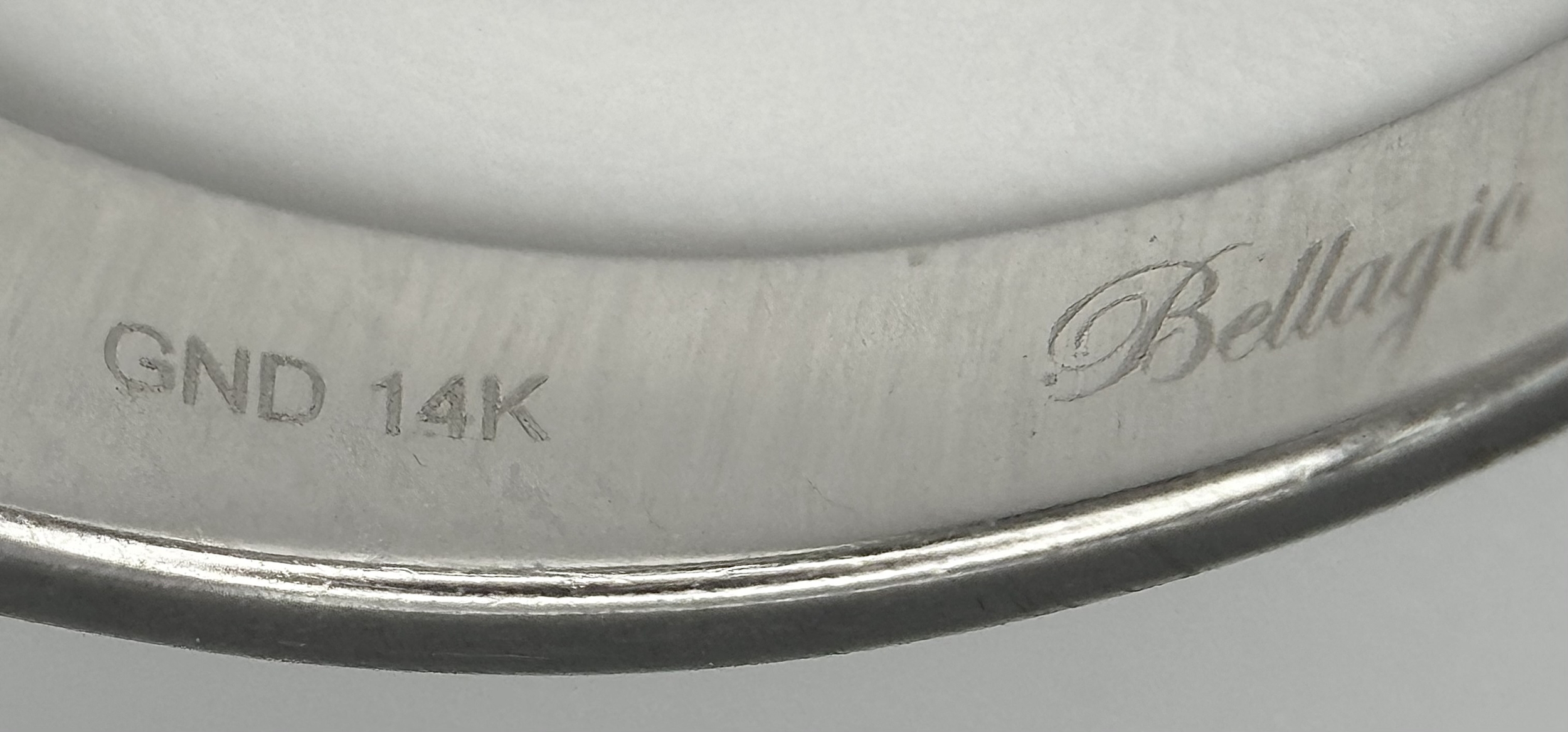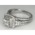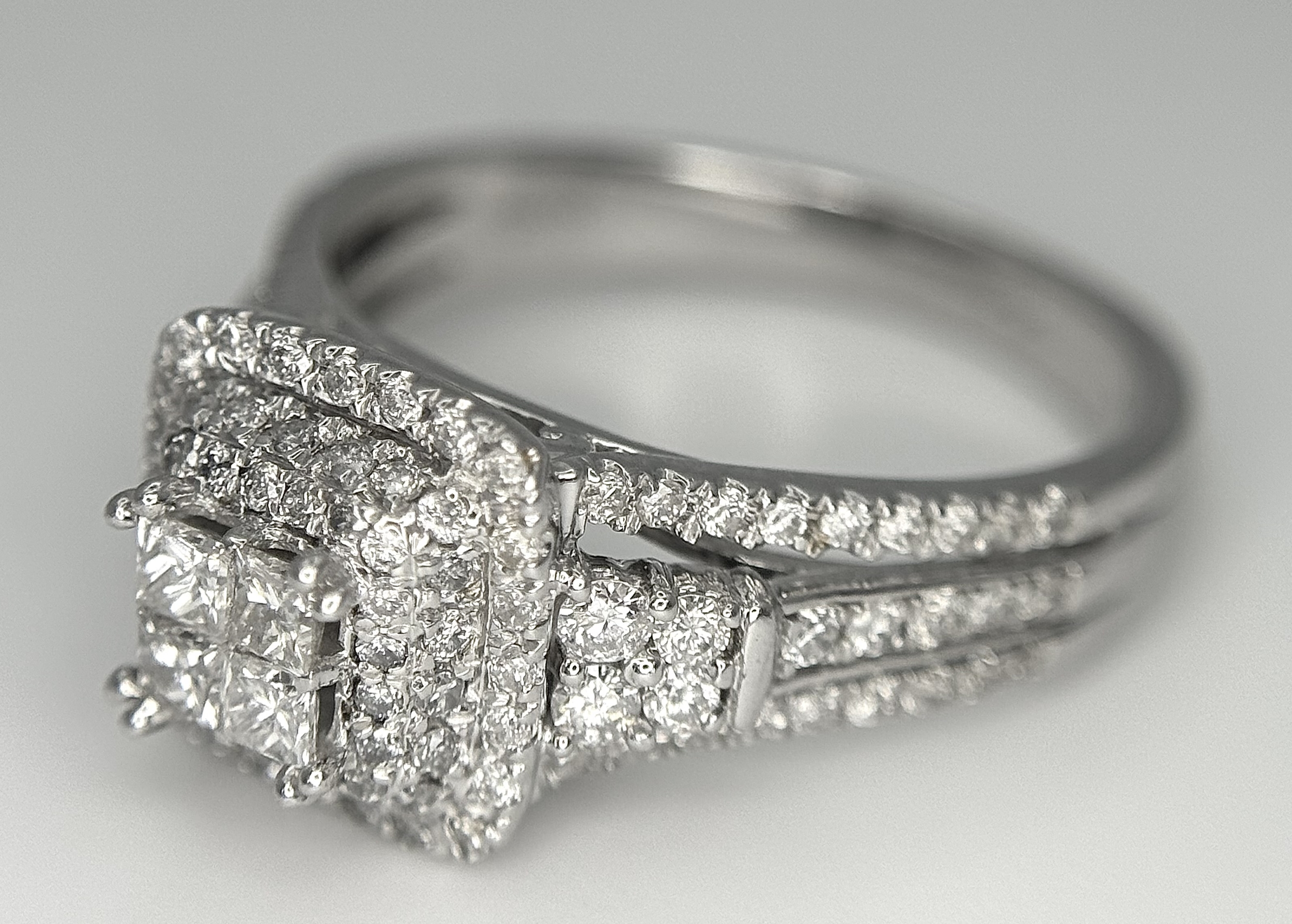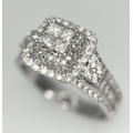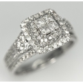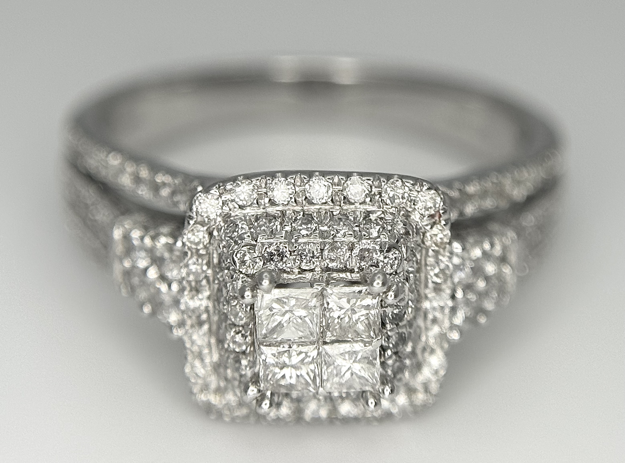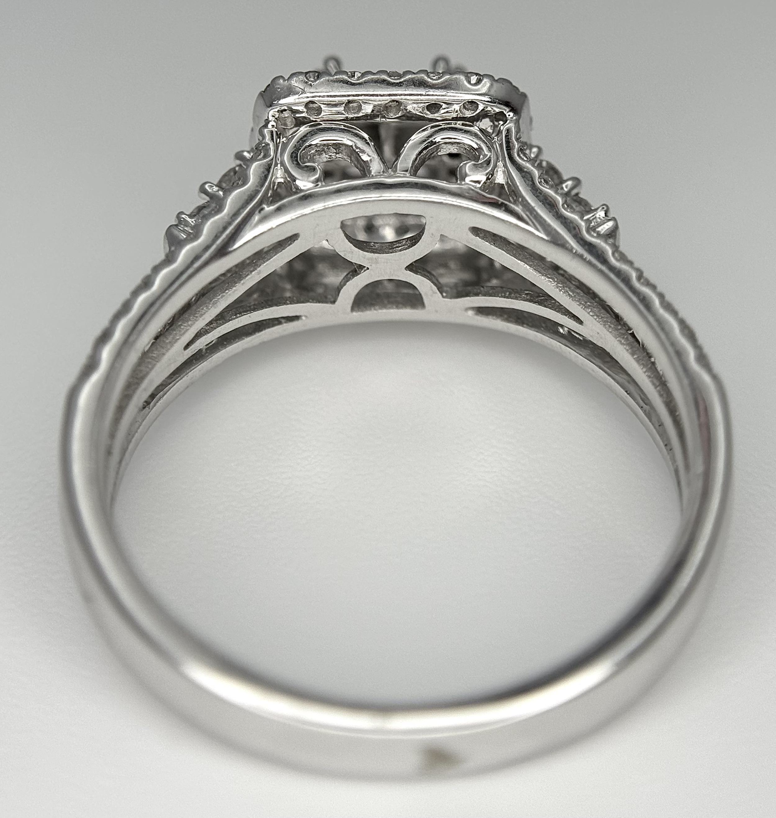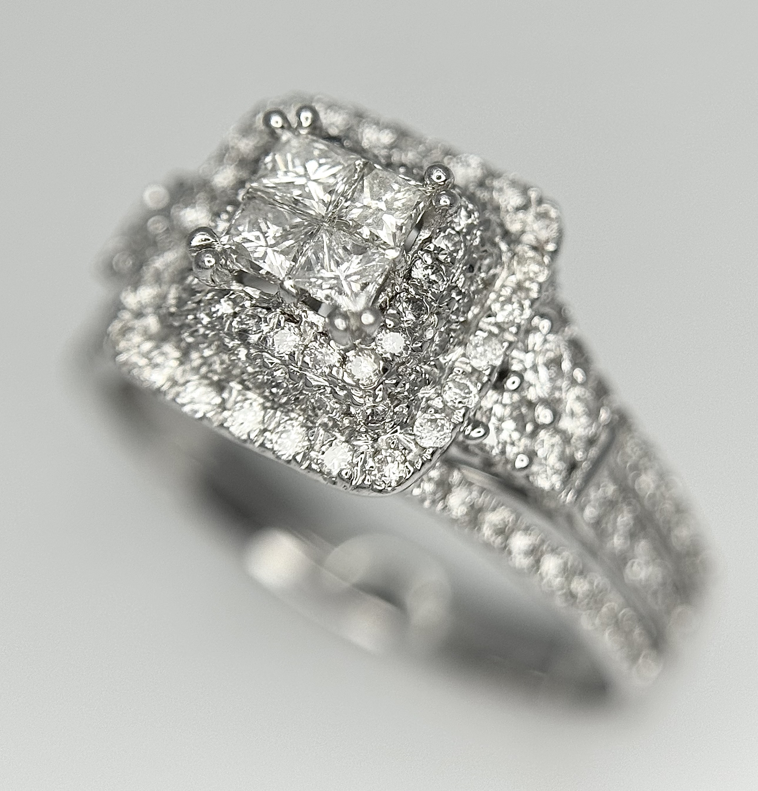 A 14K WHITE GOLD DIAMOND TRIPLE HALO RING WITH DIAMOND SET SHOULDERS. MARKED BELLAGIO INSIDE. 0.90CTW. 4.6G. SIZE N. JR3010.