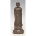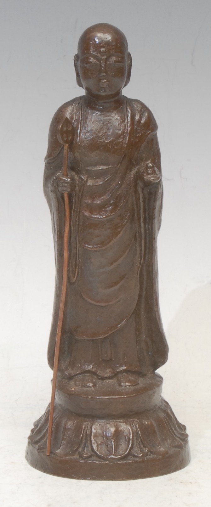 An early 20th century Tibetan bronze, of a Buddhist monk holding a staff, lotus leaf base, 18cm high overall