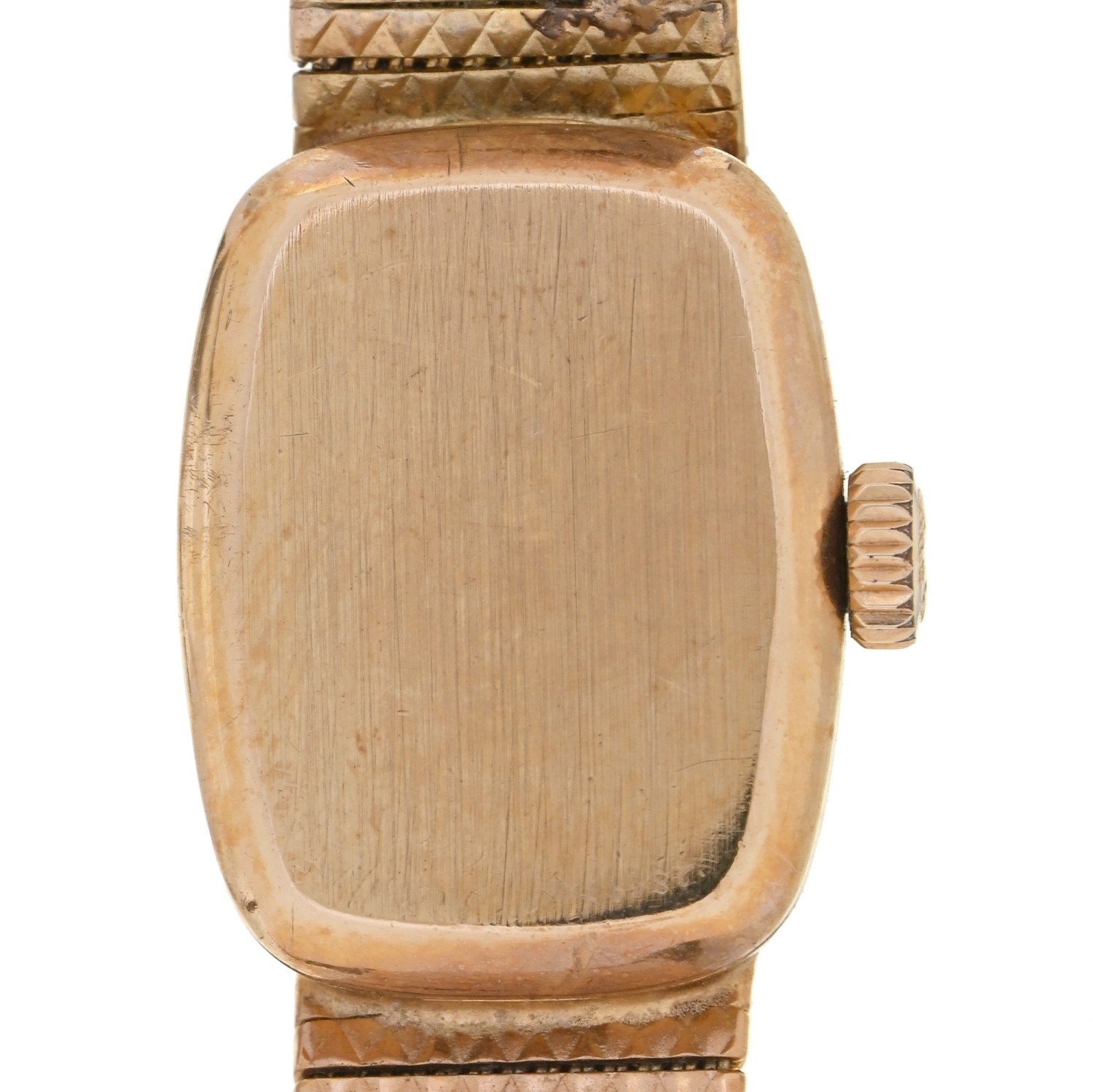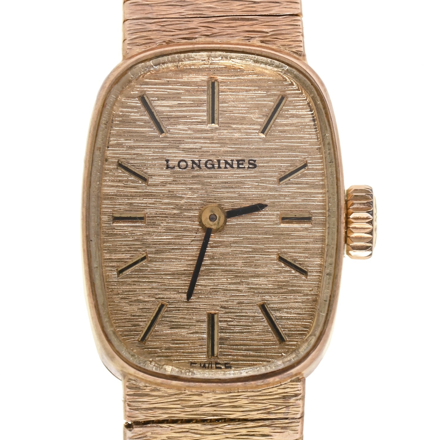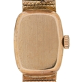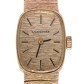 A Longines 9ct gold cushion shaped lady's wristwatch, 15 x 20mm, on 9ct gold tapered mesh bracelet, 26g