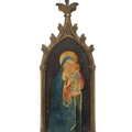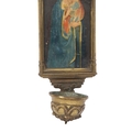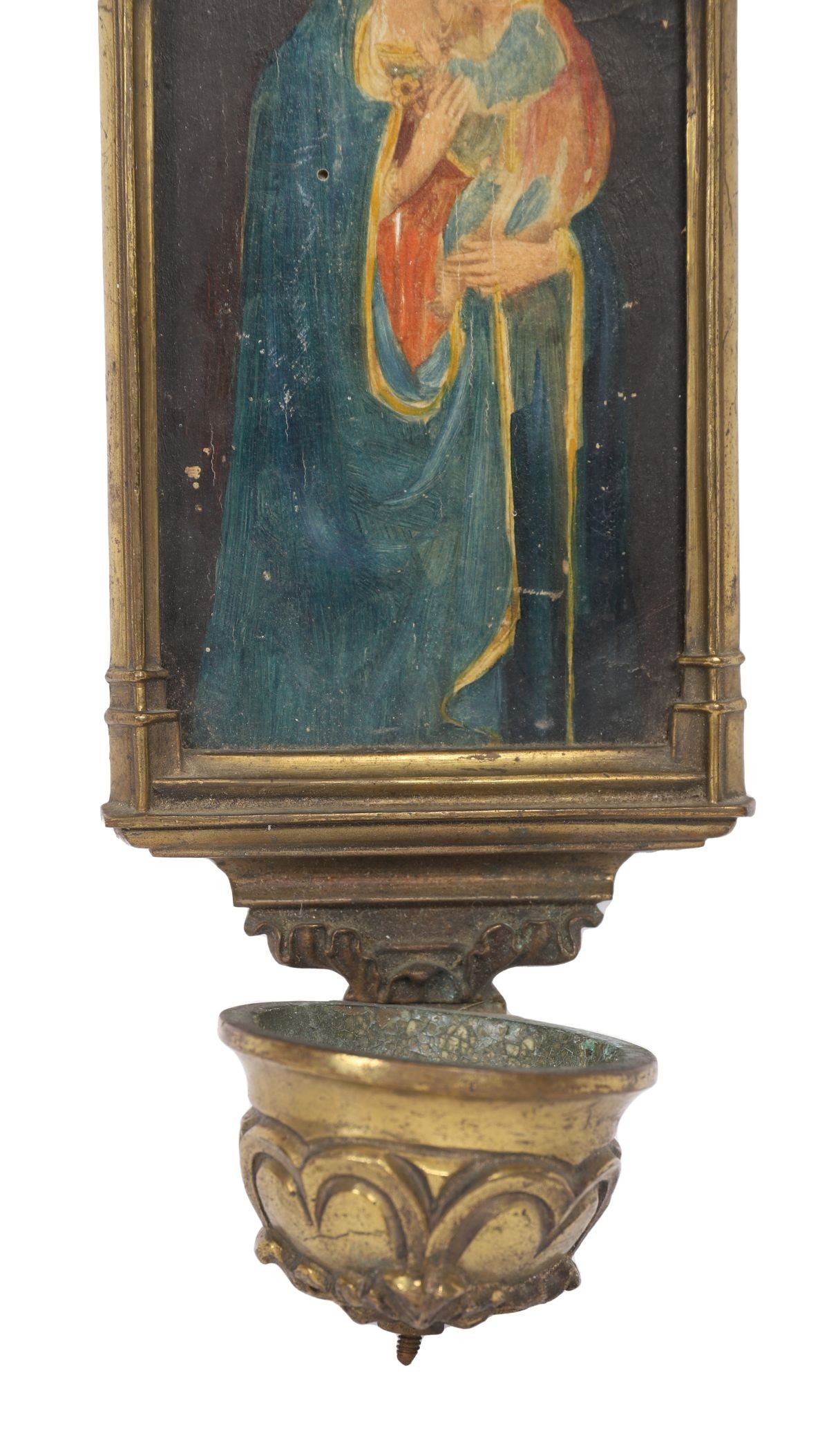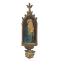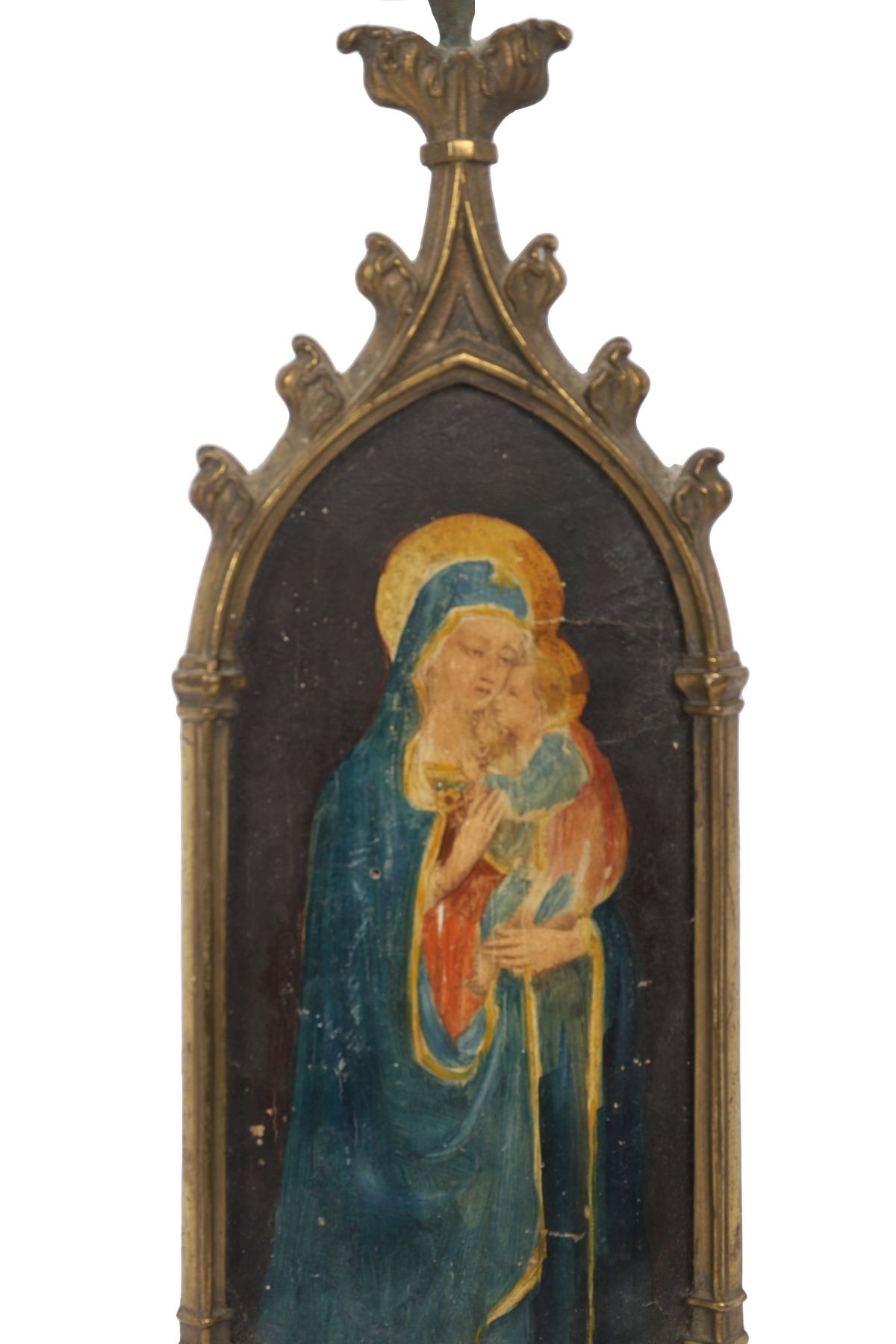 Gothic-arched form with painted Madonna and Child panel.