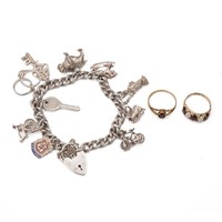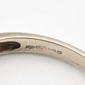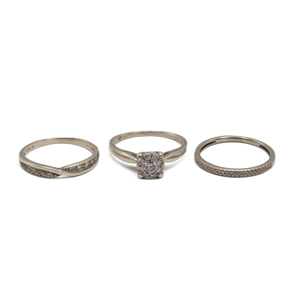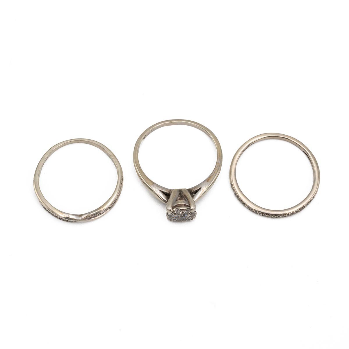 Three 9ct white gold rings, wedding band, eternity and a diamond 9ct white gold, centre stone approx 0.1ct surrounded by eight diamonds. Gross weight 4.87 grams.
