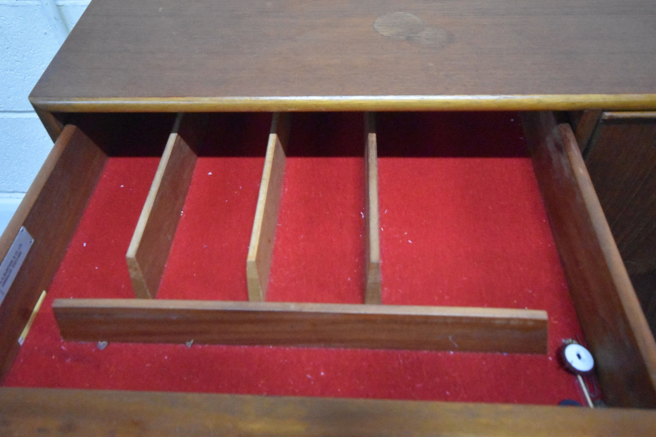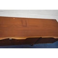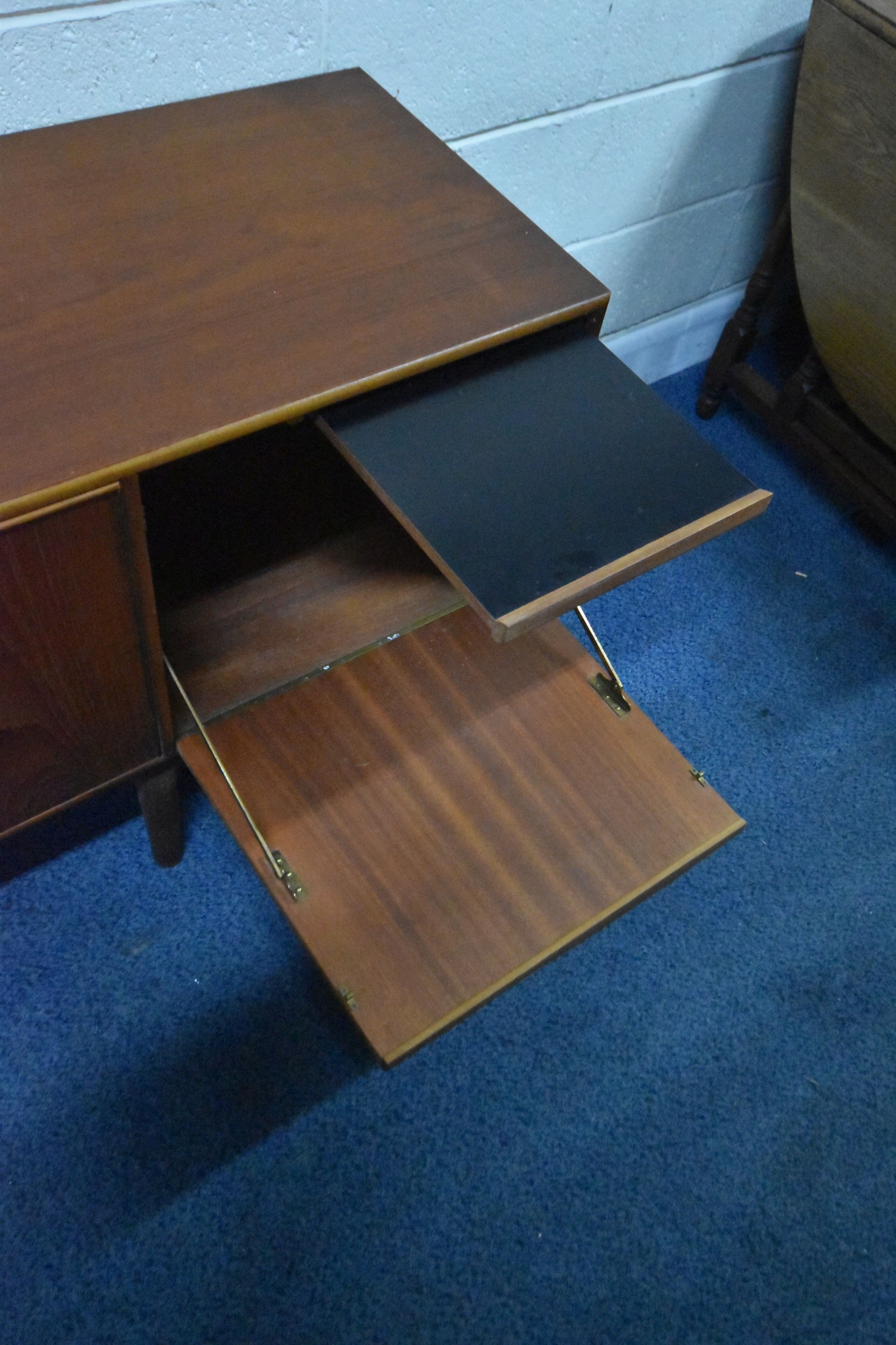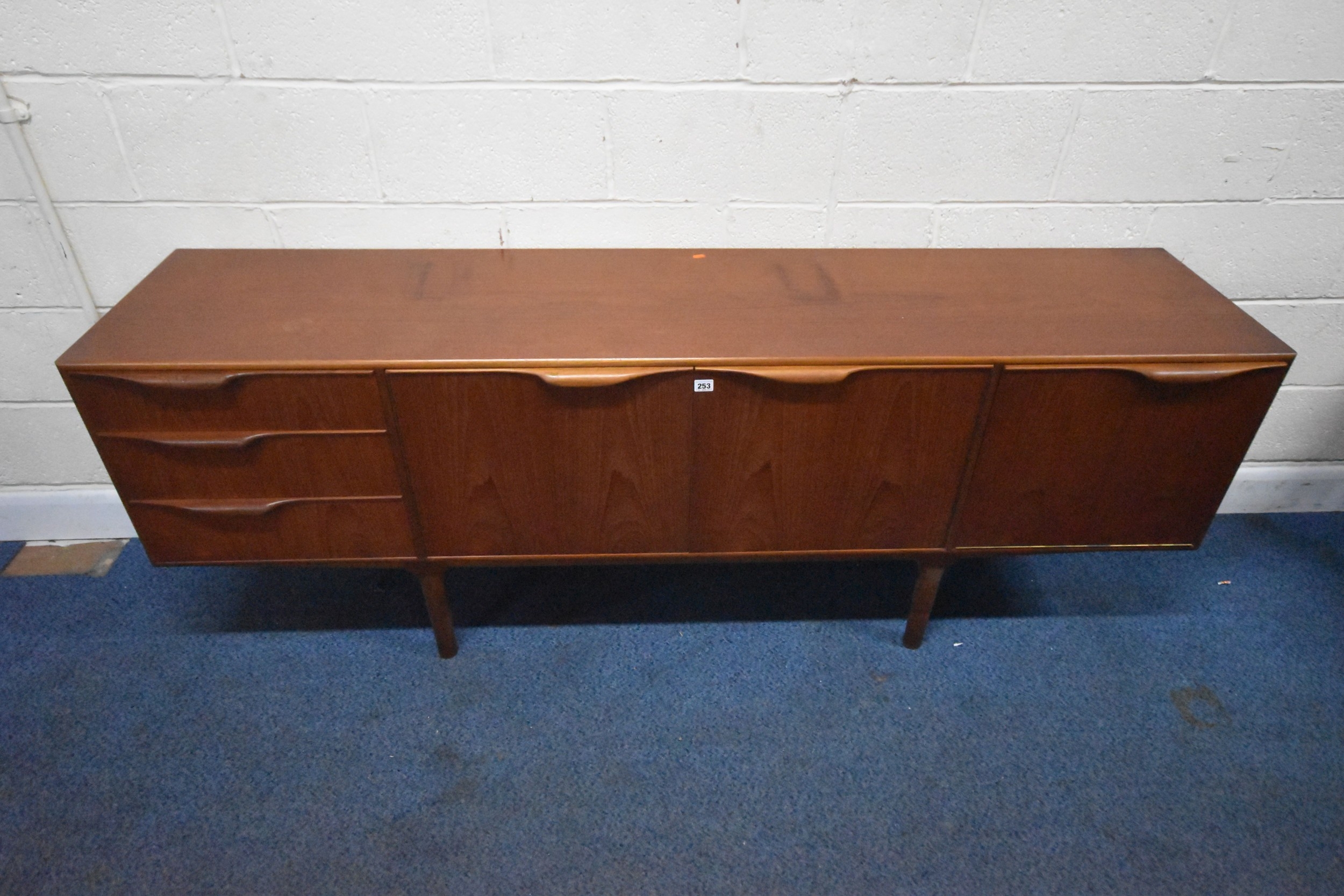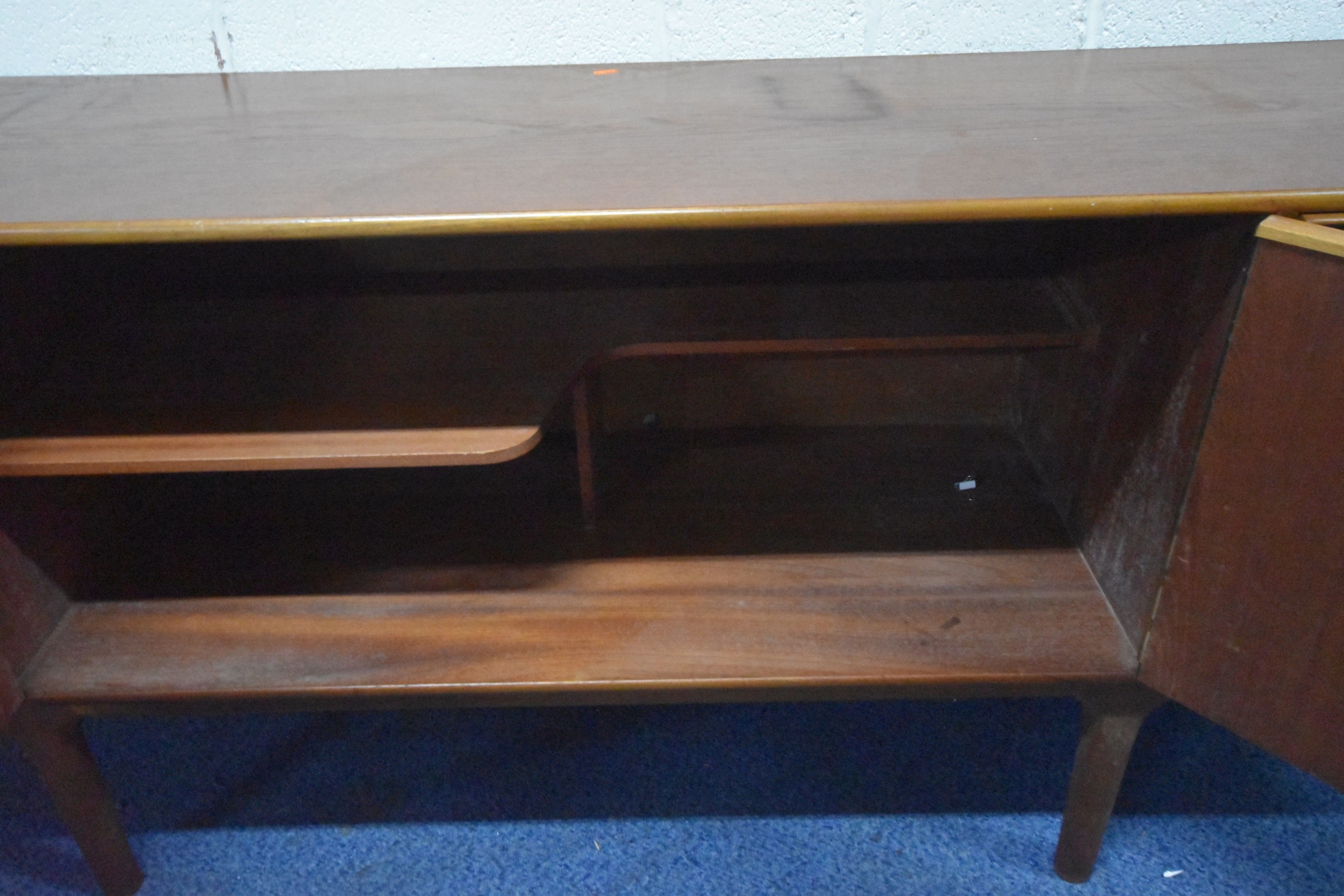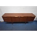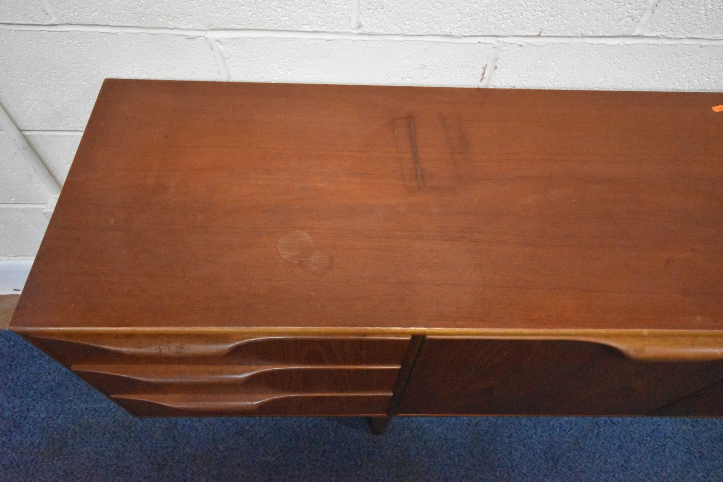 A.H. McINTOSH & CO LTD, KIRKCALDY, SCOTLAND, A MID-CENTURY TEAK SIDEBOARD, fitted with three drawers, the top drawer with red baize and cutlery dividers, double cupboard doors and a fall front door, raised on tapered legs, width 202cm x depth 49cm x height 76cm, condition report: marks, scuffs, stains, heat marks, drawers stiff, other wear and usage