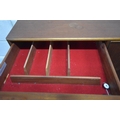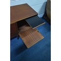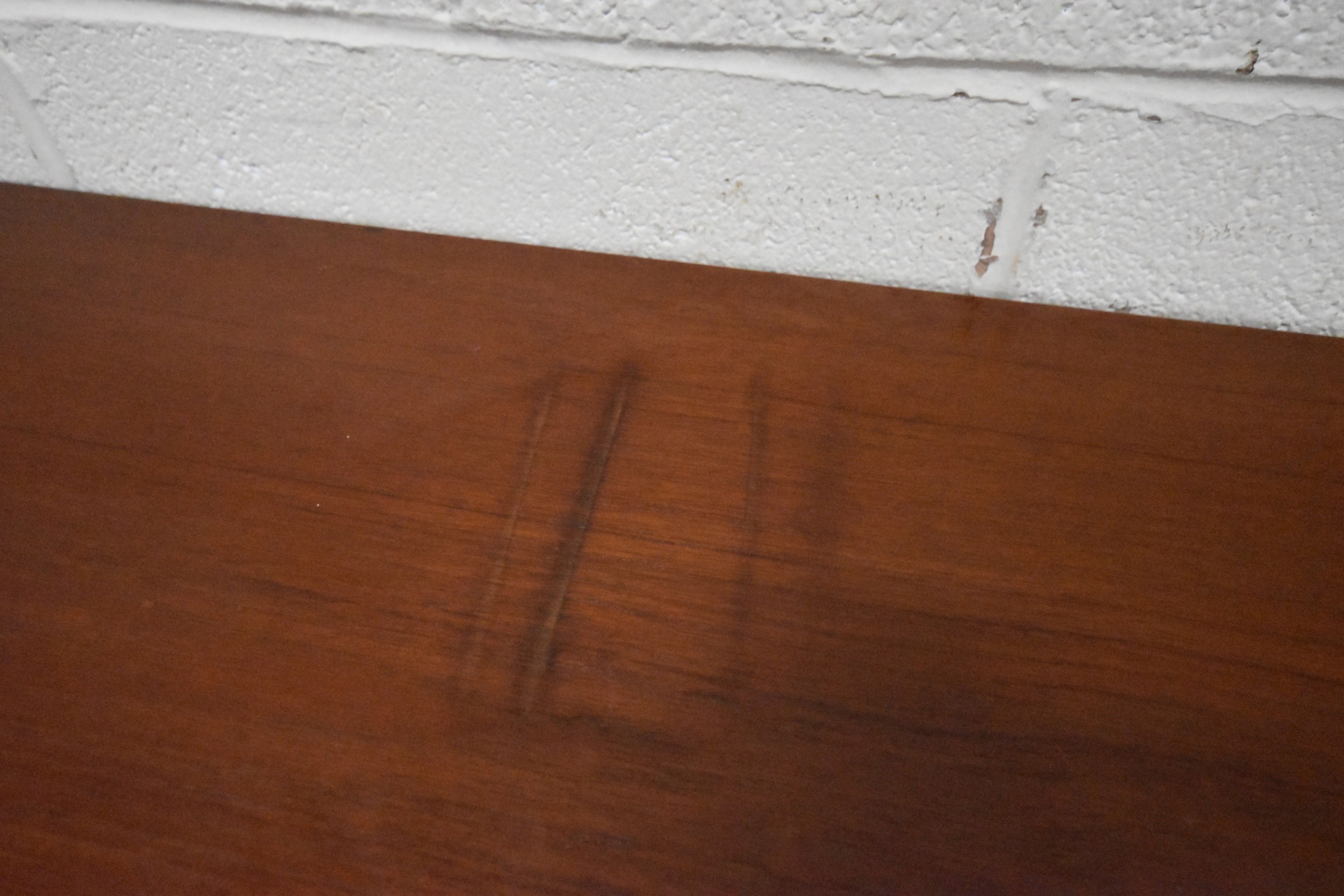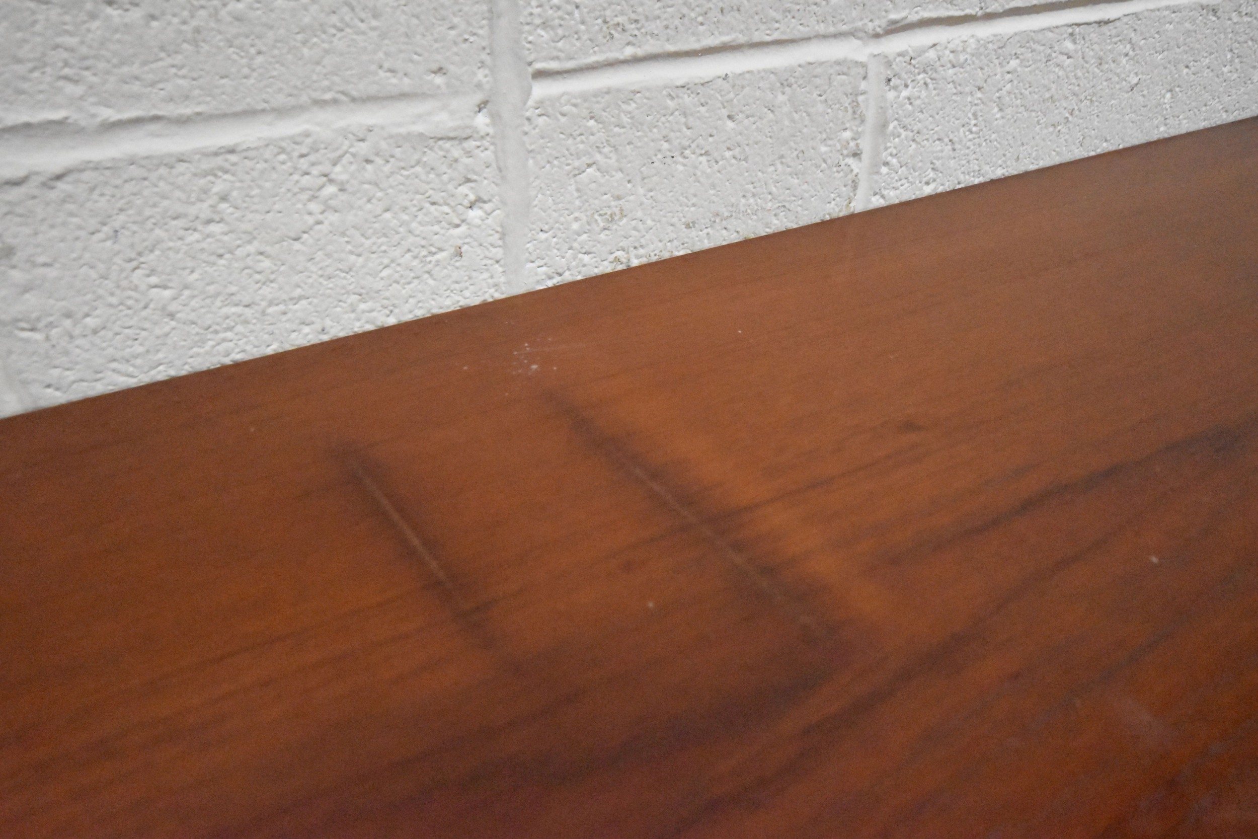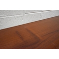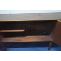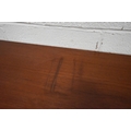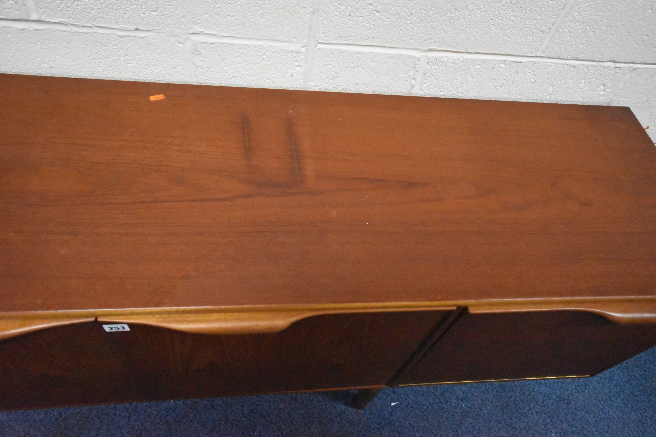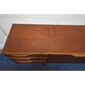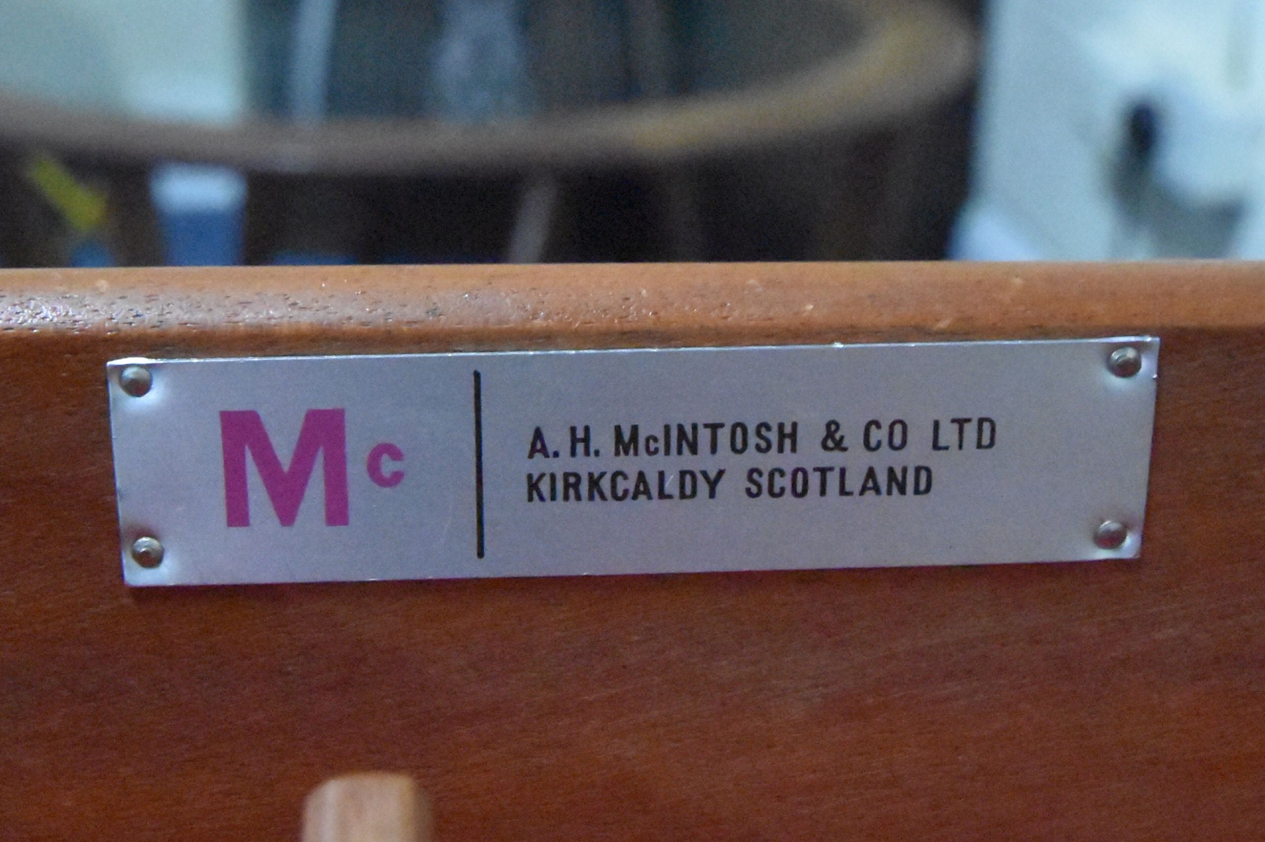 A.H. McINTOSH & CO LTD, KIRKCALDY, SCOTLAND, A MID-CENTURY TEAK SIDEBOARD, fitted with three drawers, the top drawer with red baize and cutlery dividers, double cupboard doors and a fall front door, raised on tapered legs, width 202cm x depth 49cm x height 76cm, condition report: marks, scuffs, stains, heat marks, drawers stiff, other wear and usage
