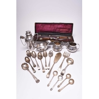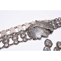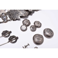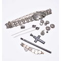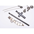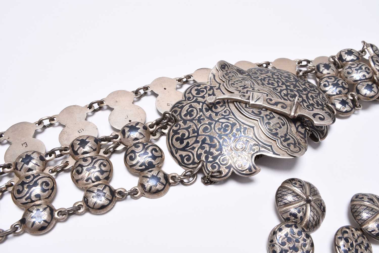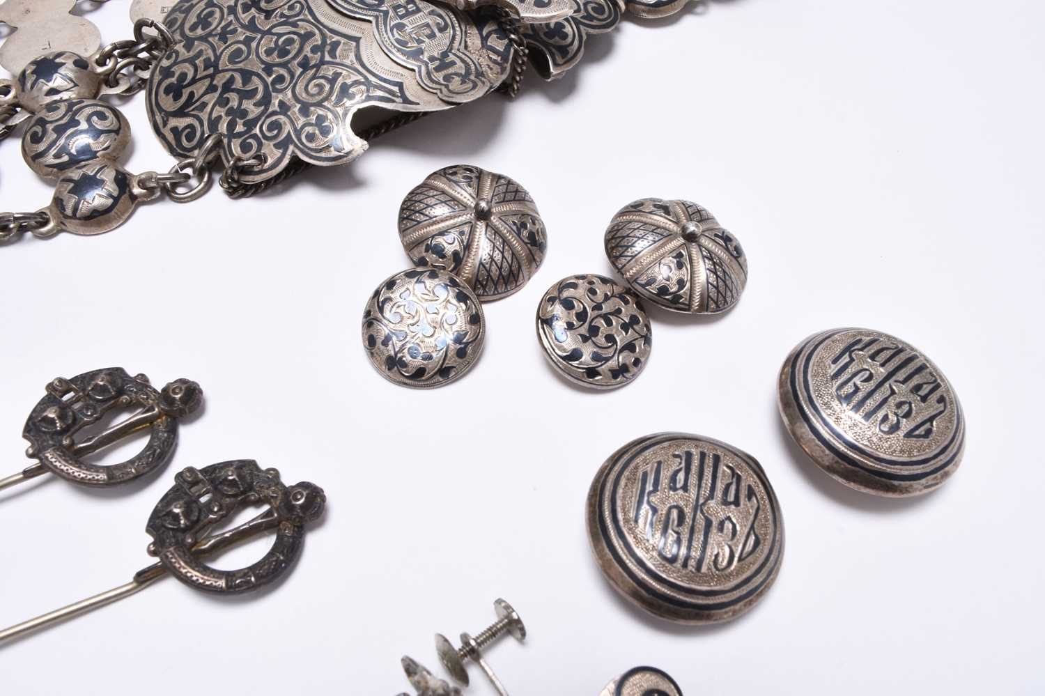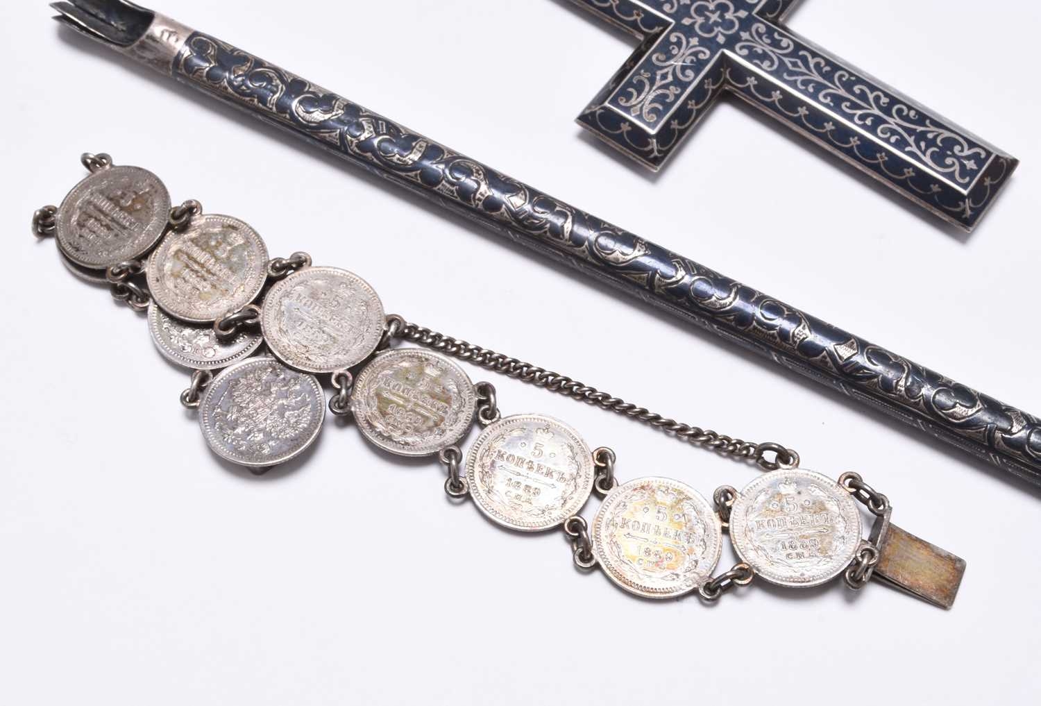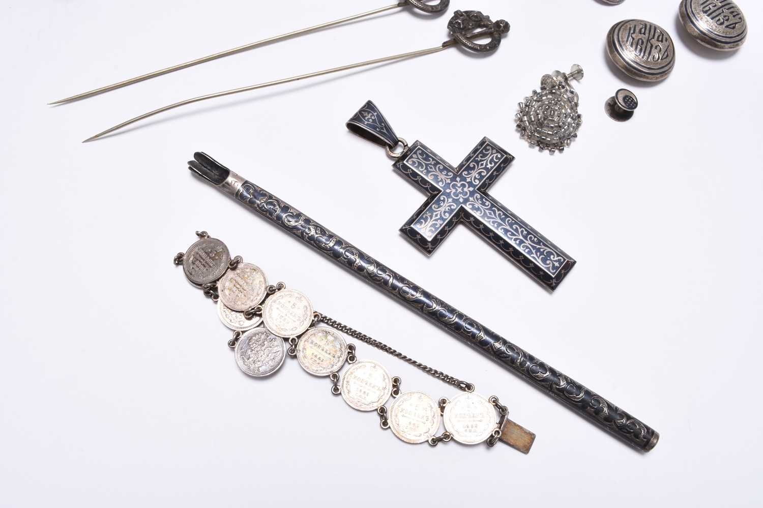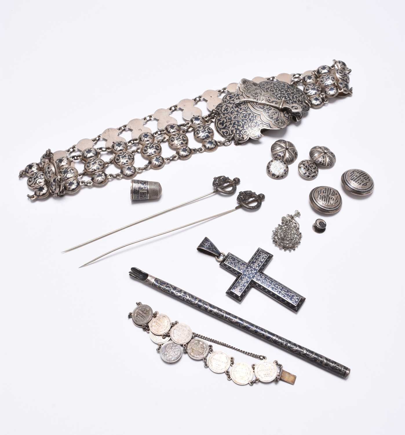A Russian silver niello work belt, the scrolling panel clasp secured with novelty Kindjal, together with a pair of cufflinks, two studs, white metal and niello work crucifix pendant, a thimble, a writing nib, a coin set bracelet and two hat pins (a lot)