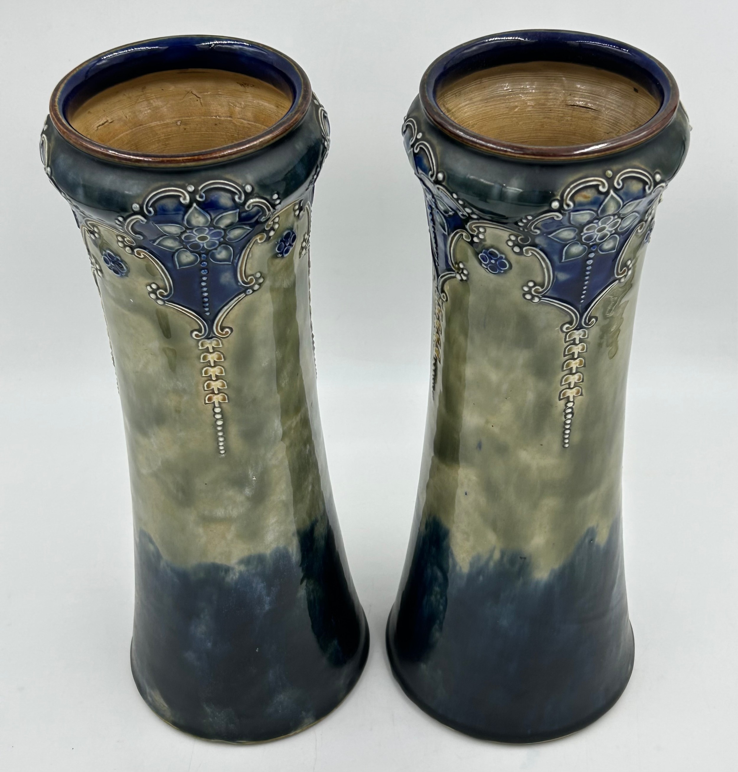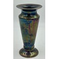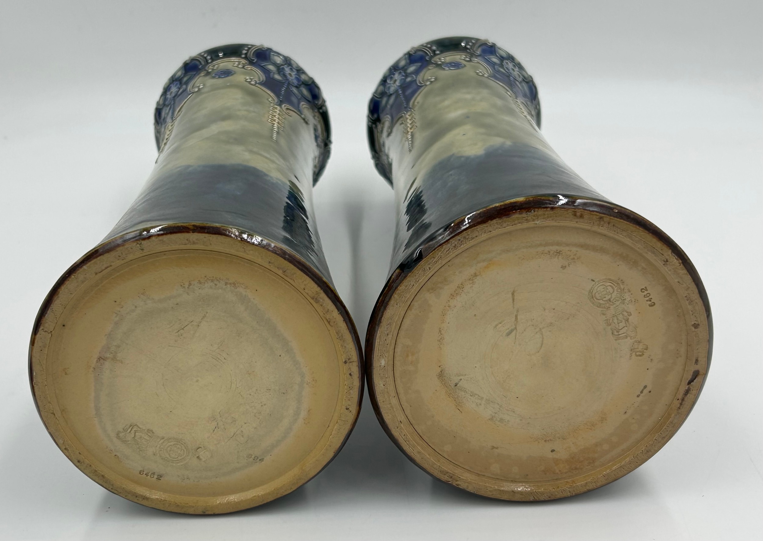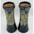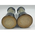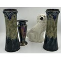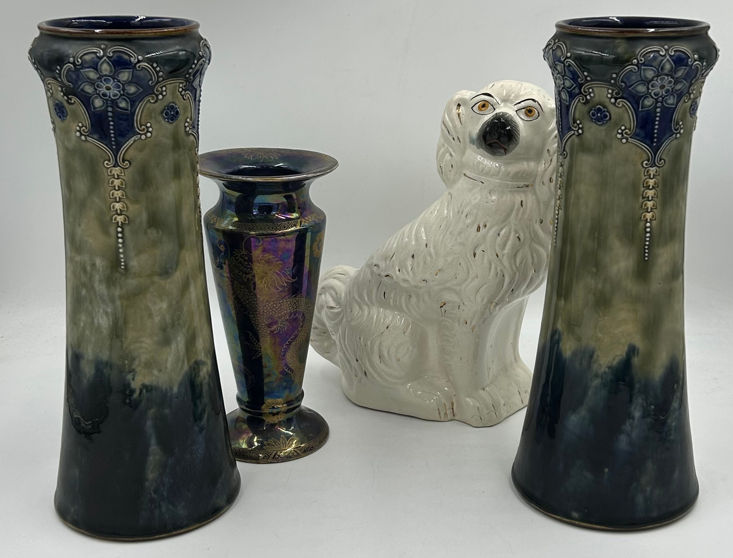 A pair of Royal Doulton stoneware Sleeve Vases, decorated with 'Tube lined' designs 32cm with impressed mark to base 6462 together with Maling vase decorated with dragons and flowers on a purple iridescent background with 3054L to base 22cm and a white Staffordshire Dog. (4).
